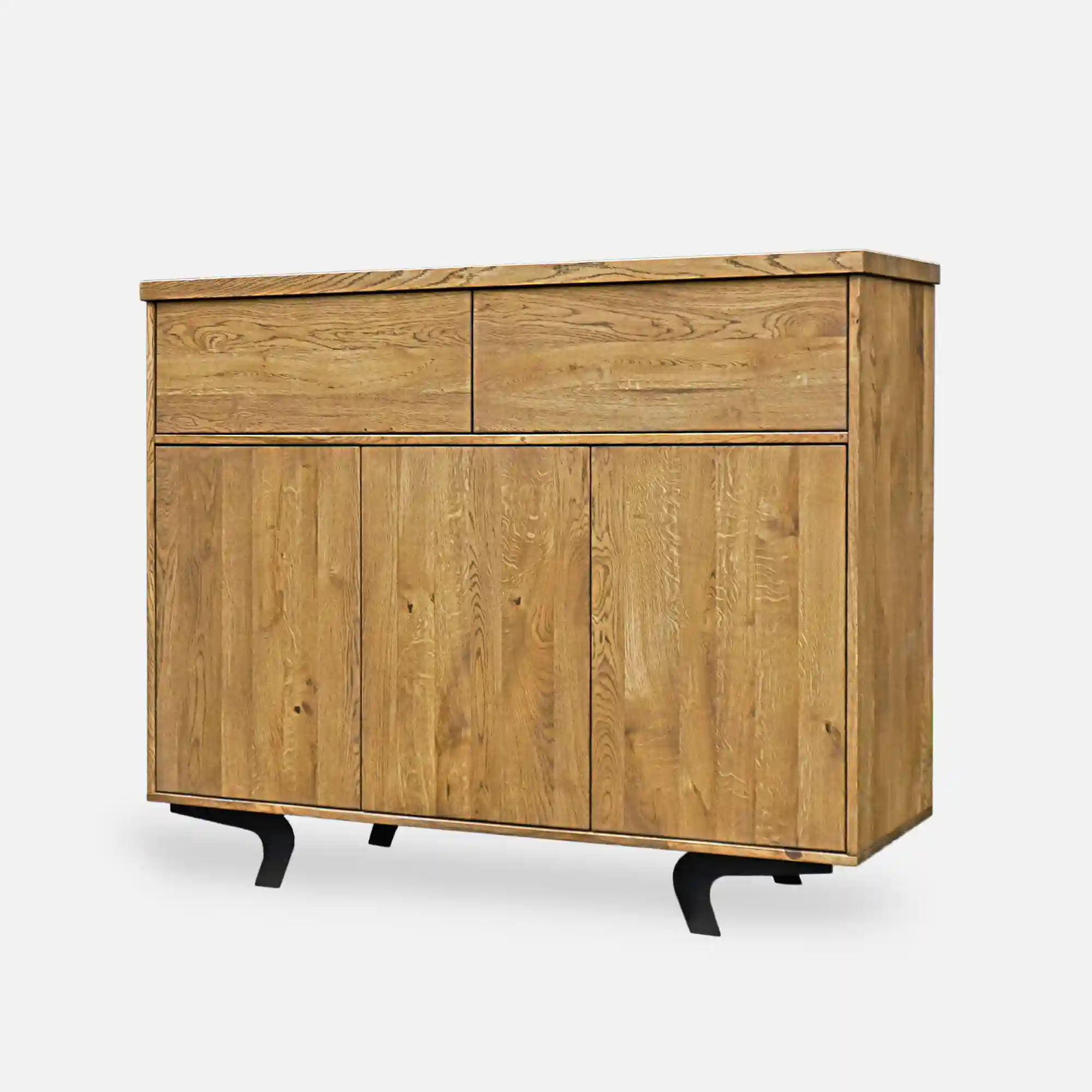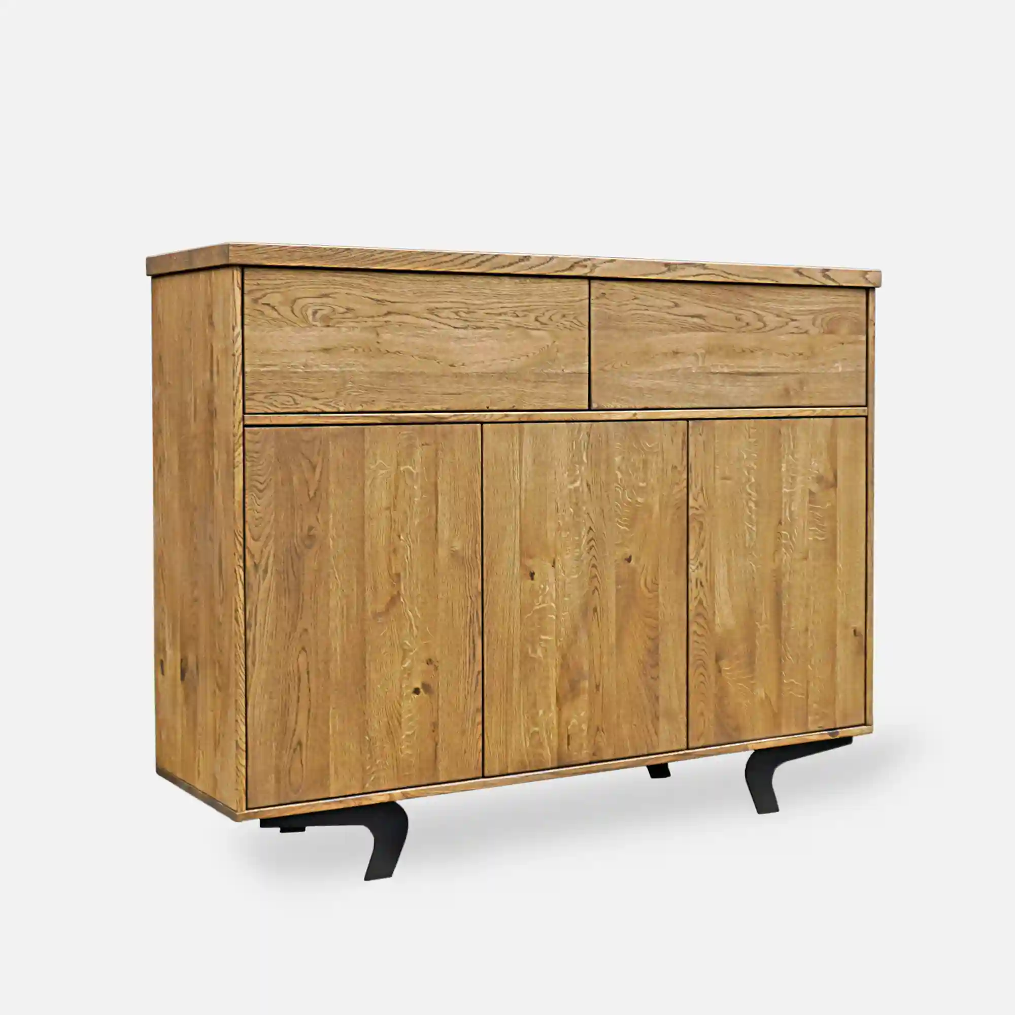 Sideboard VITA II ist große, geräumige und elegante Möbel aus massivem Eichenholz. Dieses Material hat schöne Struktur, gibt einzigartiges und natürliches Aussehen und ist ungewöhnlich einfach zu pflegen. Beine aus pulverbeschichtetem Stahl in Schwarz bieten Haltbarkeit und Robustheit von Möbeln. Die Kombination aus natürlichem Massivholz und Stahl passt perfekt in jedes Loft- und Industrieinterieur. Kommode aus Eiche hat zwei große und geräumige Schubladen und drei Schränke mit Regal in der Mitte, dank denen es viel Stauraum bietet. Charakteristisches Element für unsere Kommode VITA II ist auch die im Vergleich zum gesamten Möbelbau etwas längere Tischplatte. Alle Fronten verfügen über ein komfortables Öffnungssystem per Touch TIP-ON. Kommode ist aus Massivholz gefertigt und Stahl passt perfekt in den industriellen Stil. Sideboard VITA II ist eine ausgezeichnete Wahl für Wohnzimmer sowie Esszimmer oder sogar elegantes Heimbüro.