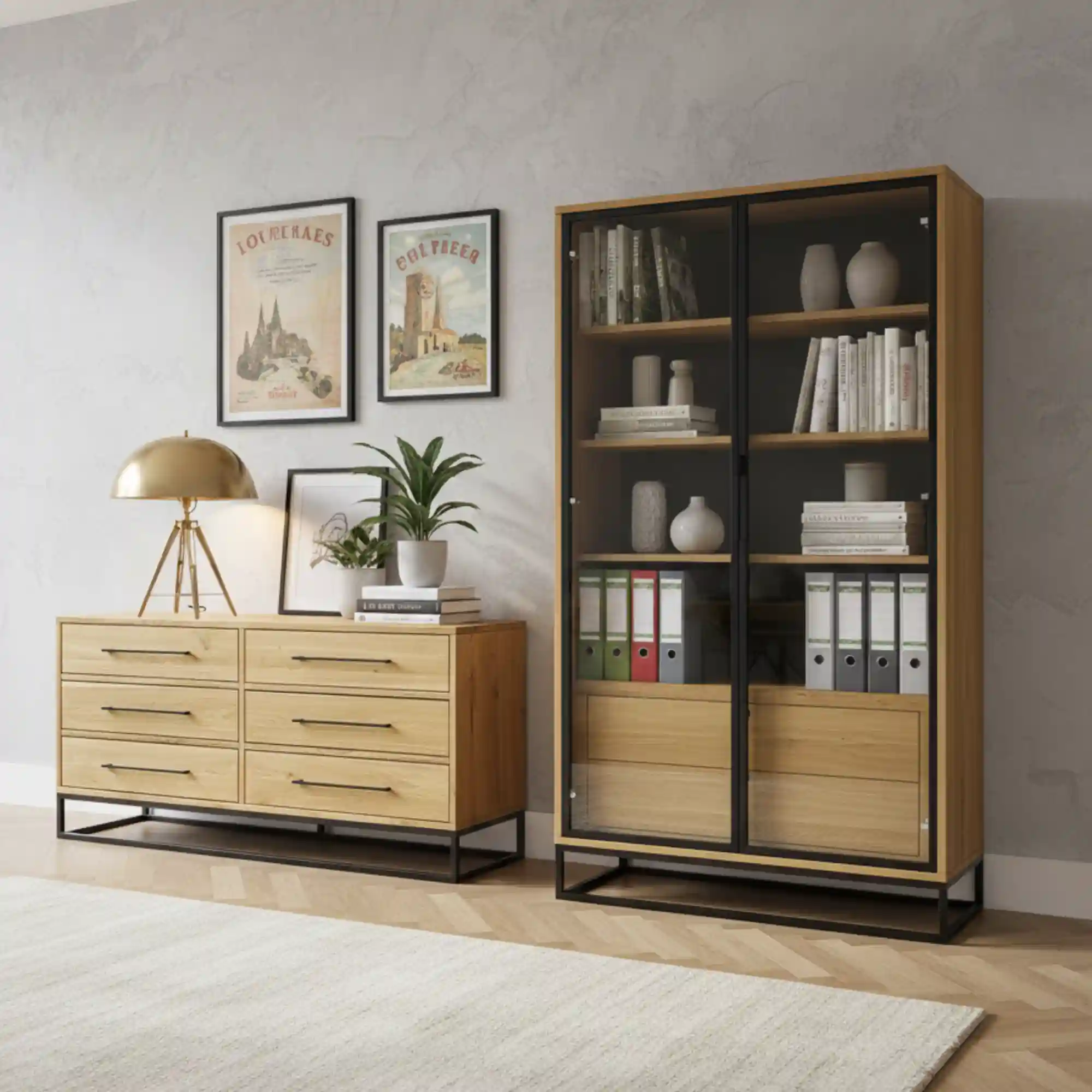 Loft-Eichenschrank aus Massivholz MERIS II einzigartiges Design und interessante Form in einer modernen Edition. Die Holzvitrine besteht aus massivem Eichenholz mit einer natürlichen, warmen Farbe. Dadurch ist die Struktur des Holzes deutlich sichtbar und jedes Möbelstück erhält einen einzigartigen Charakter. Die Loft-Vitrine mit Schubladen verfügt über Metallelemente aus schwarz pulverbeschichtetem Stahl. Metallelemente stehen im Kontrast zum natürlichen Material und verleihen den Möbeln gleichzeitig einen wahrhaft industriellen Charakter. Die Schubladen werden über Löcher in den Fronten geöffnet. Die Glastür besteht aus Glas mit einem schwarzen Metallrahmen. Die aus Massivholz gefertigte Vitrine bietet Ihnen viel Platz, um Ihre Souvenirs, Dekorationen oder Bücher und Ordner im Büro zu präsentieren. Die Vitrine MERIS II aus Loft-Eiche eignet sich perfekt für moderne, industrielle und Loft-Innenräume.