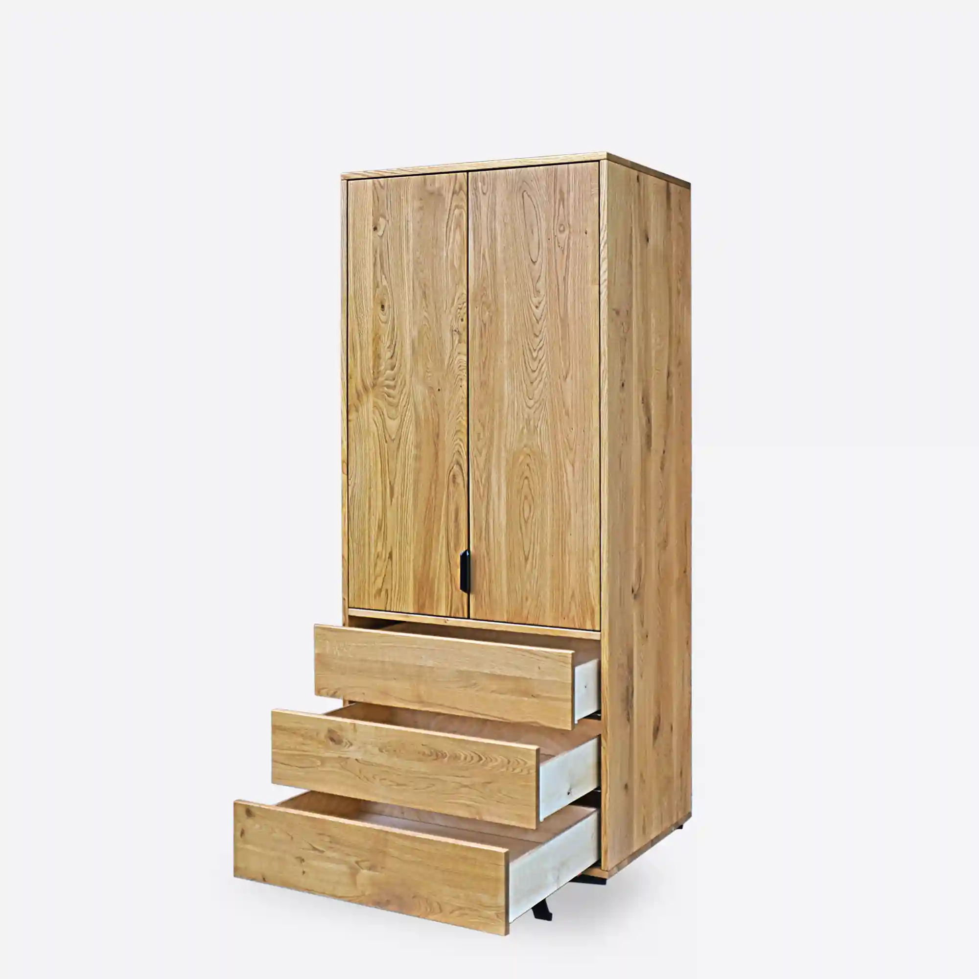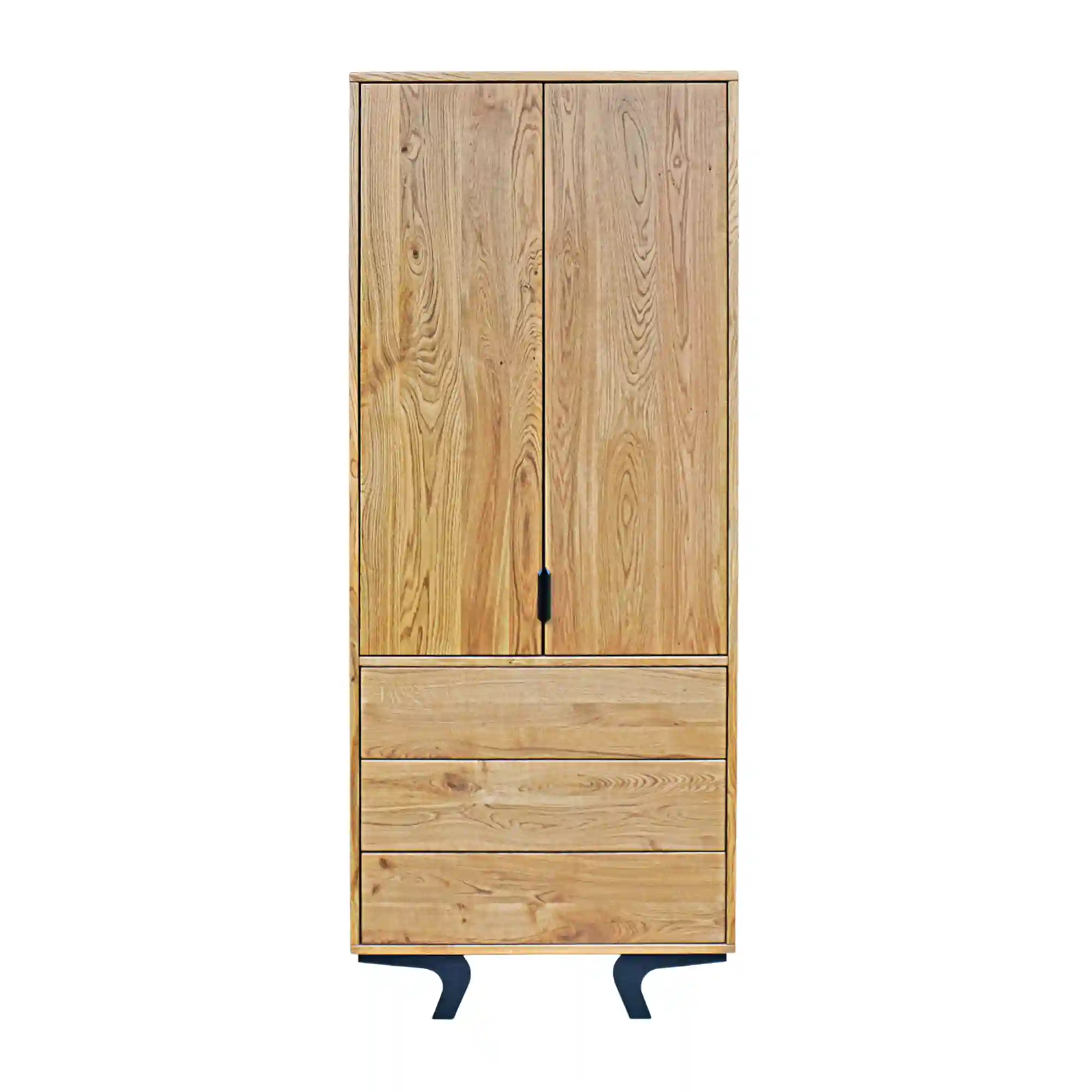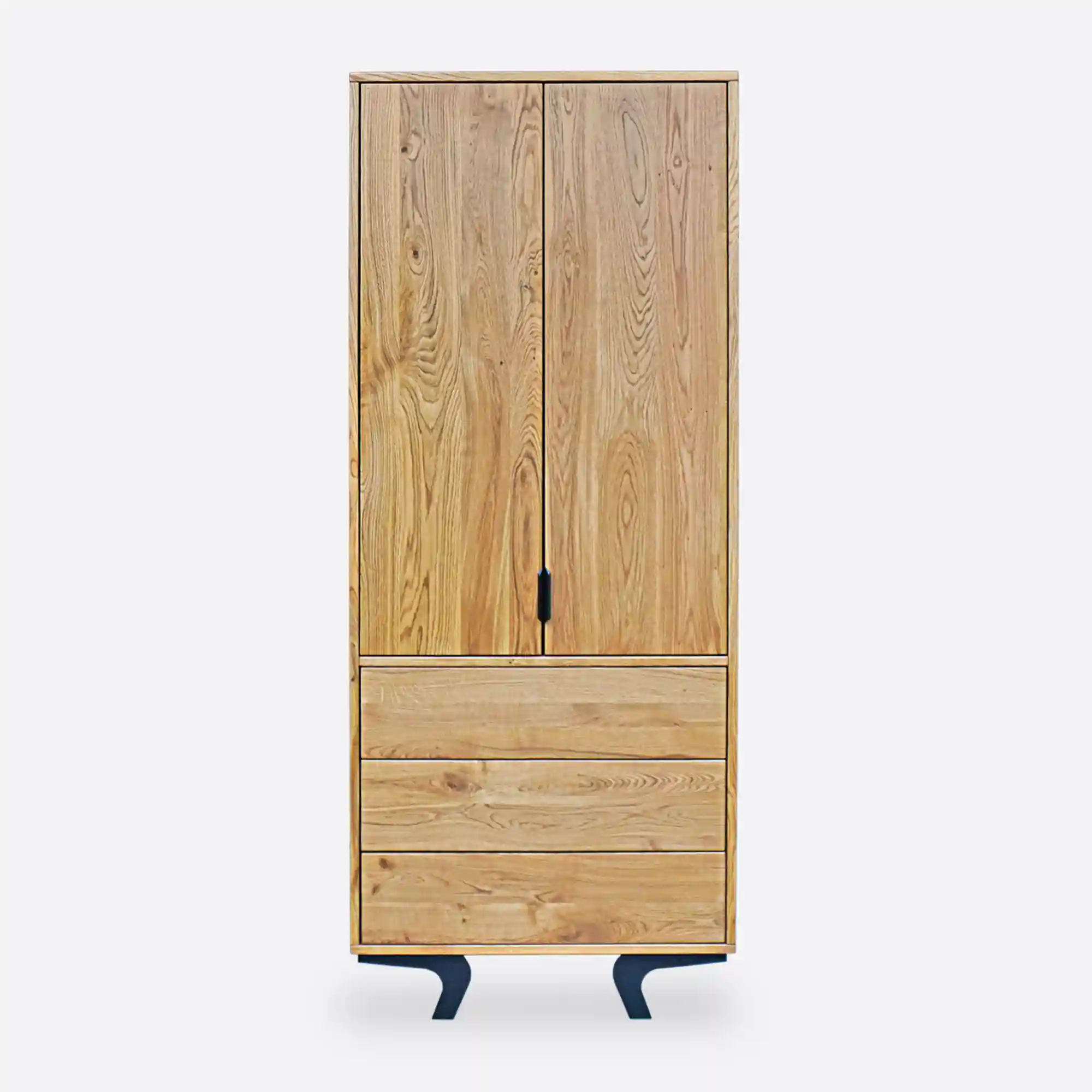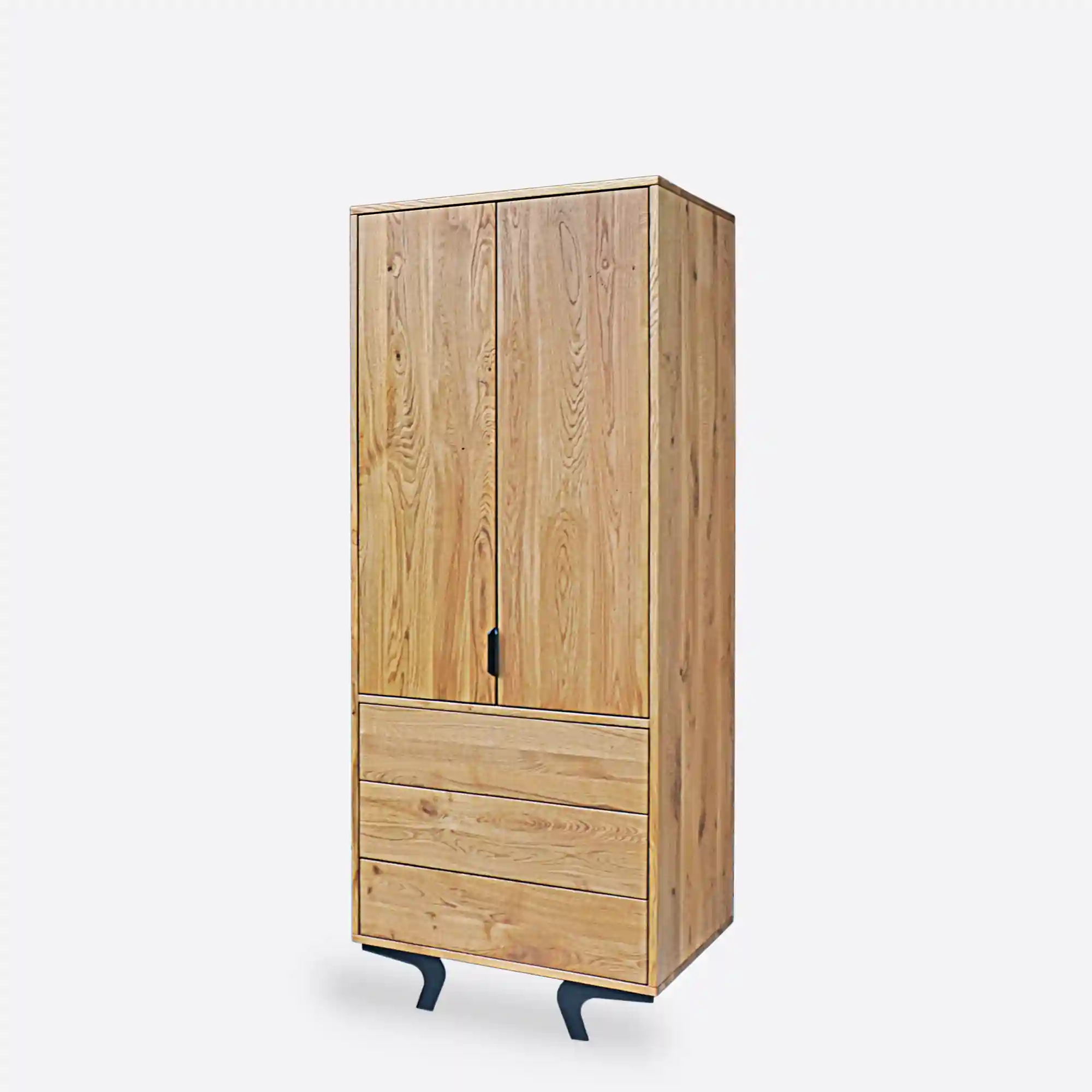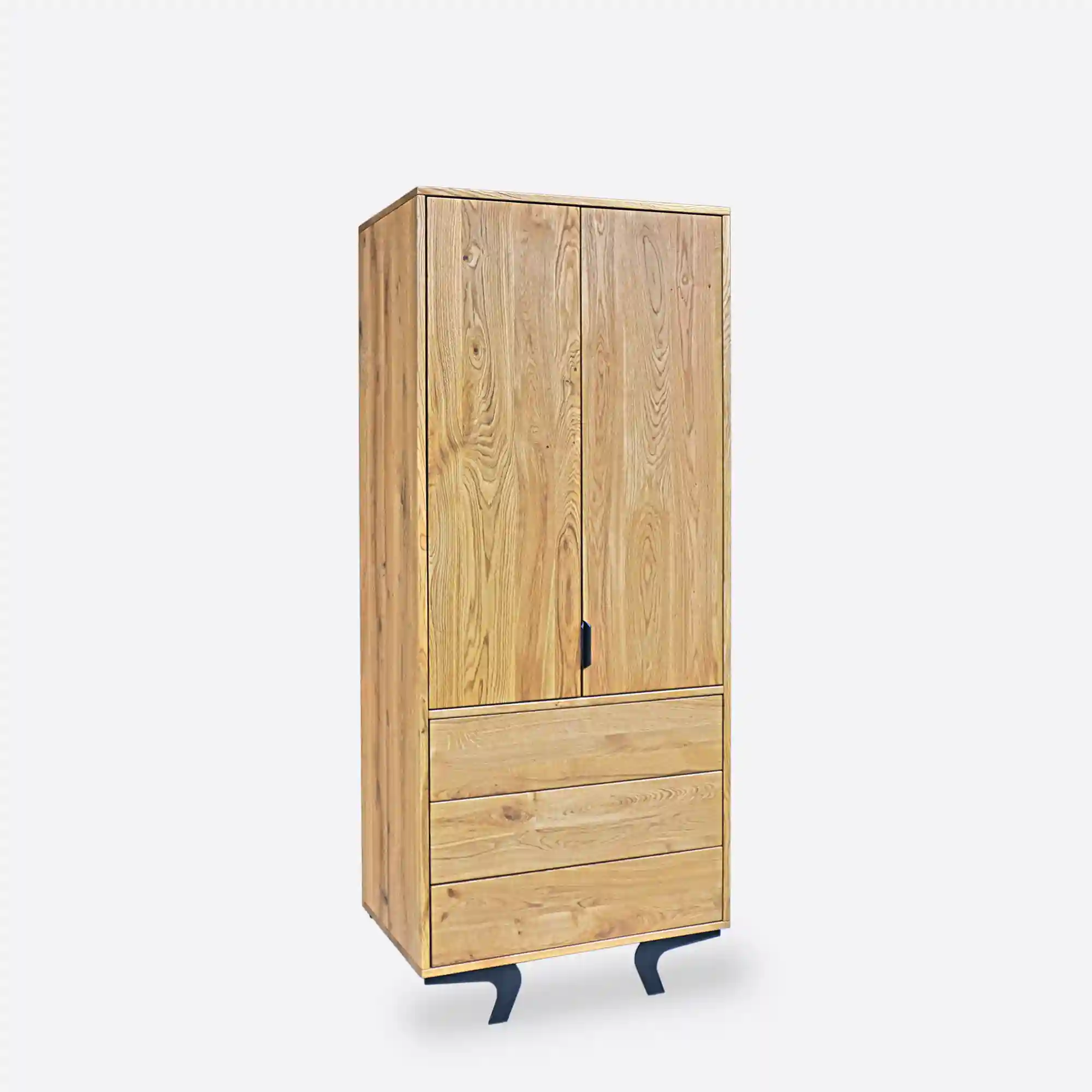 Der Eichenschrank VITA ist eine einzigartige Kombination aus modernem Design, Loft-Stil und der natürlichen Schönheit von Massivholz. Der aus hochwertigem Eichenholz gefertigte Holzschrank besticht durch seine Langlebigkeit, Robustheit und sein elegantes Aussehen. Sein charakteristisches Merkmal sind die Stahlbeine mit ihrer auffälligen, gebogenen Form. Der Stahlsockel verleiht dem Ganzen Leichtigkeit und setzt einen industriellen Akzent, der perfekt zum trendigen Loft-Stil passt.