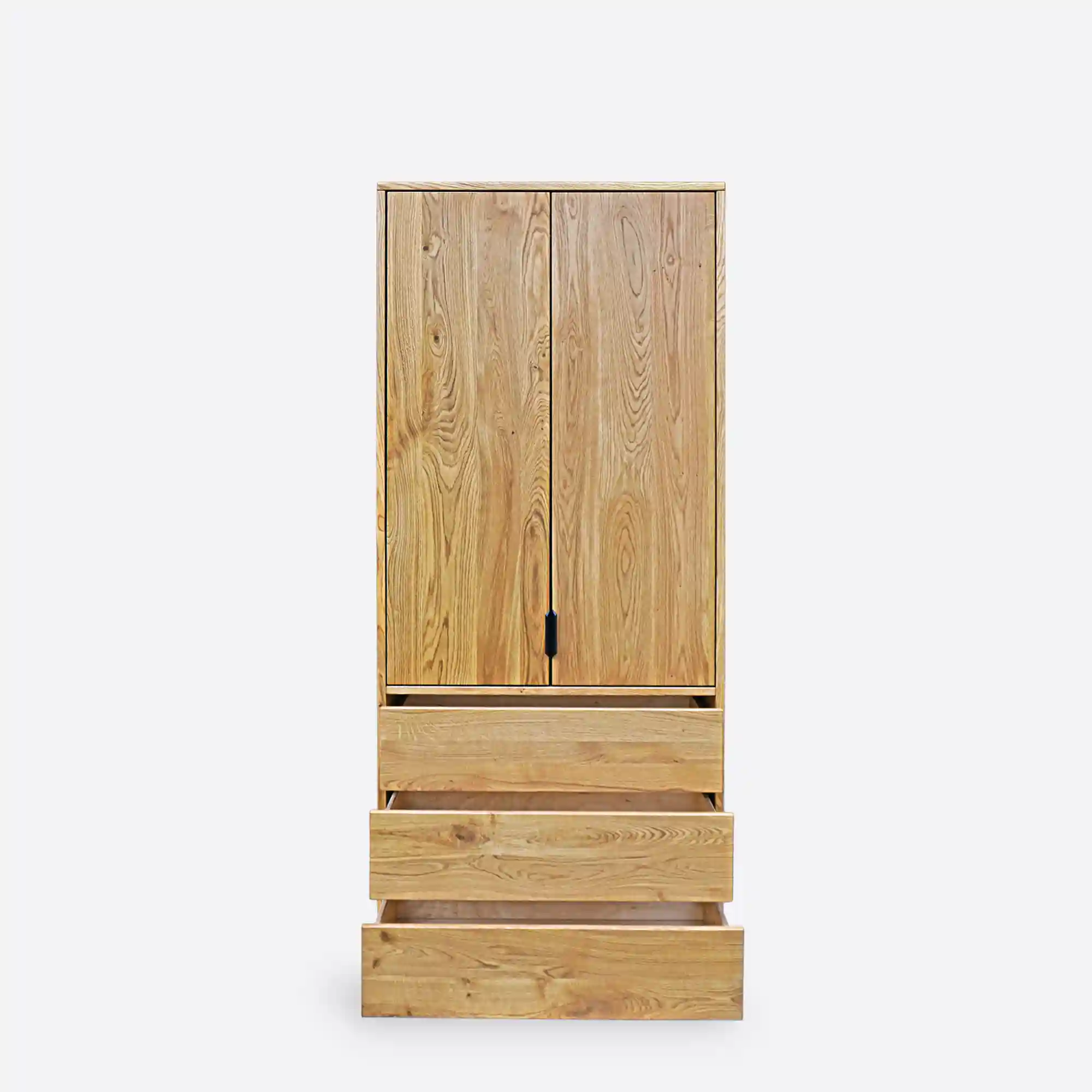 Das Möbelstück ist mit drei geräumigen Schubladen mit Tip-On-System ausgestattet, die Komfort im täglichen Gebrauch und ein minimalistisches Aussehen gewährleisten. Der obere Teil des Schranks wird mit Griffen verschlossen, und im Inneren befindet sich eine Kleiderstange. Damit ist er die ideale Lösung für Schlafzimmer, Ankleidezimmer oder Flur. Es handelt sich um ein Holzmöbelstück, das Funktionalität mit der Ästhetik von Innenräumen verbindet, die von der Natur und einem modernen Stil inspiriert sind.
