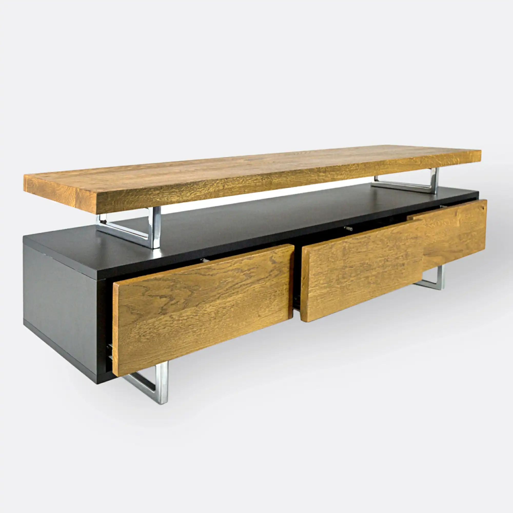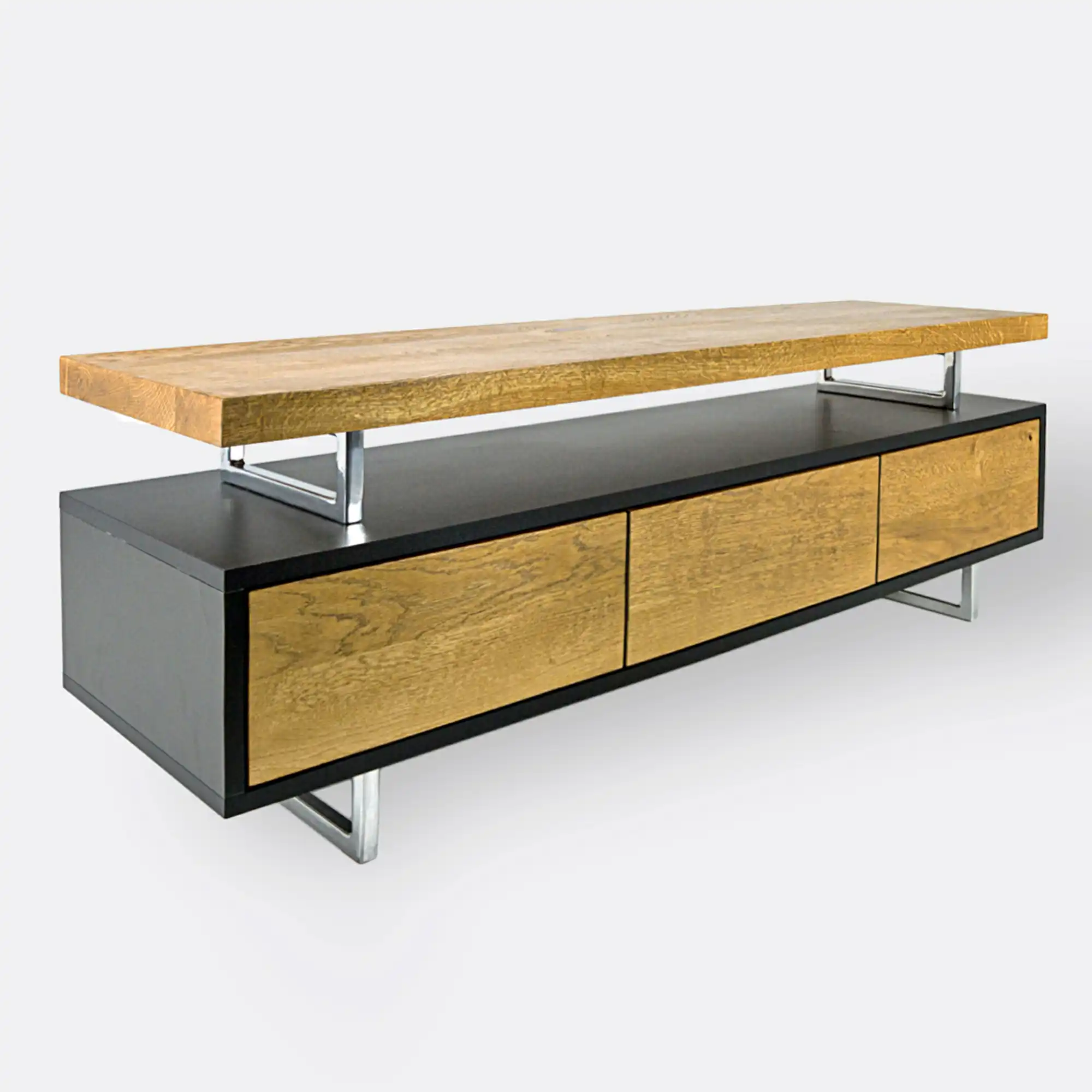 TV-Schränke aus Eichenholz und laminierte Platte NESCA II ist eine der Möbelversionen der NESCA Kollektion. Fernsehschrank wurde im Geiste des industriellen Stils hergestellt – Holz wurde mit Metall kombiniert, was originelle Wirkung, höchste Qualität und Haltbarkeit der Möbel für viele Jahre verleiht. Der Körper der Möbel besteht aus schwarz laminierte Platte. Schubladenfronten und Tischplatte aus ausgesuchtem massivem Eichenholz. TV-Schrank aus Holz ist definitiv ein praktisches Element der Wohnzimmereinrichtung. Lowboard aus Holz NESCA II ist eine originelle und moderne Kombination von Materialien, die in erster Linie Haltbarkeit und einzigartiges Aussehen gewährleisten. TV-Tisch hat Metallbeine, geschützt mit Pulverbeschichtung in Chromfarbe. Diese Kombination von Materialien verleiht dem gesamten Möbel Chic und Eleganz. Hölzerne TV-Schrank mit 3 Schubladen bietet viel Platz für elektronische Geräte, CD, DVD-Player oder Fernbedienungen. Regal unter der Tischplatte bietet Platz für TV-Geräte. Auf der anderen Seite ist die Tischplatte des TV-Schranks ein guter Ort, um den Fernseher so einzustellen, dass er sich auf der richtigen Höhe befindet. TV Schrank aus Holz auf Metallbeinen NESCA II ist eine perfekte Ergänzung zu jeder Anordnung des Wohnzimmers.