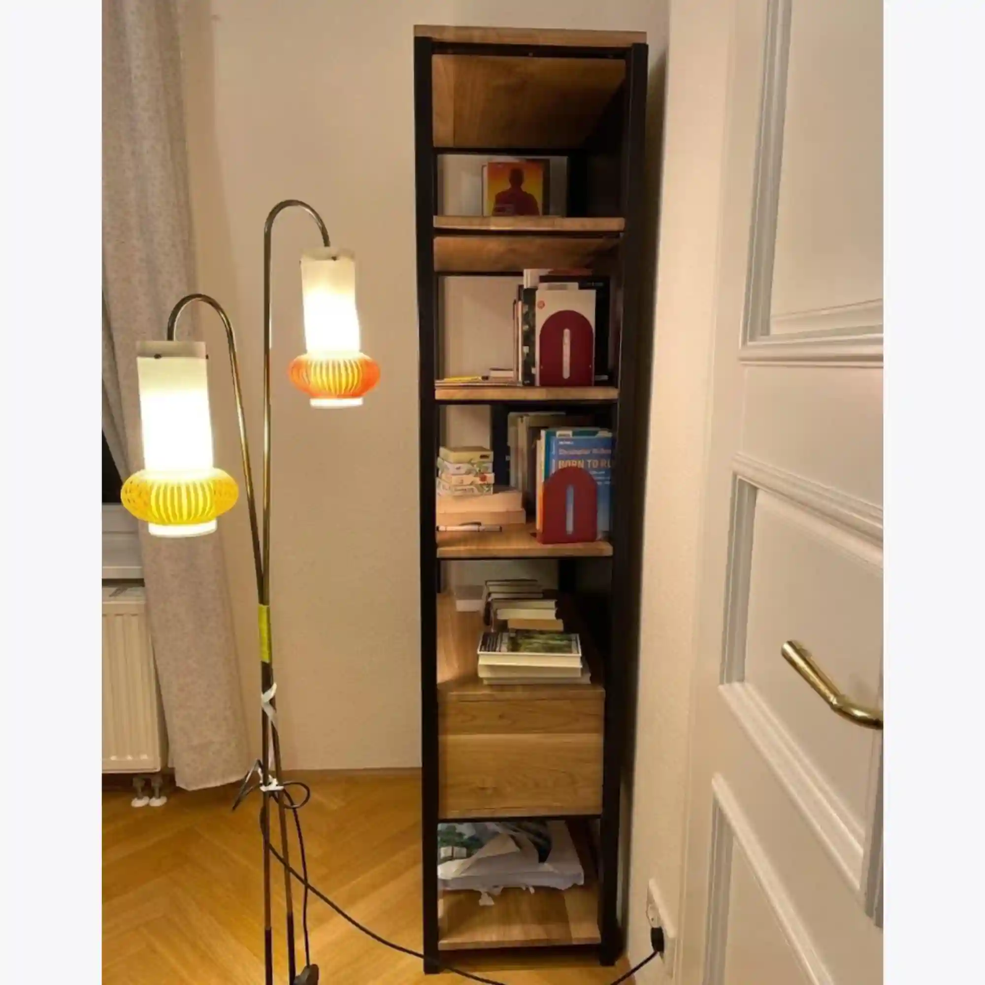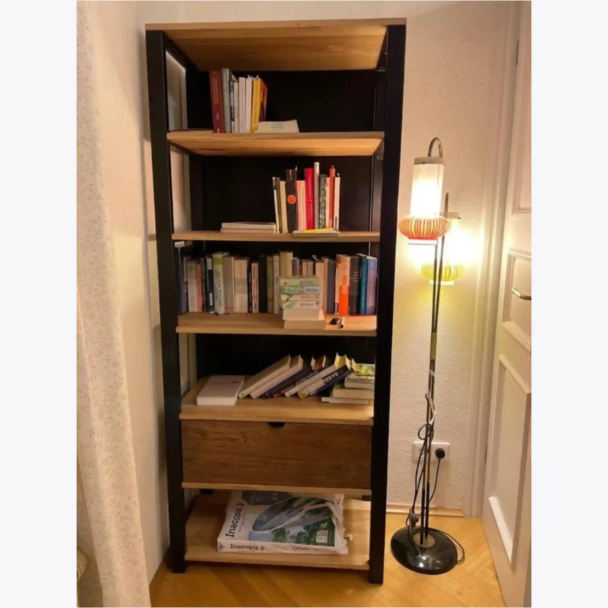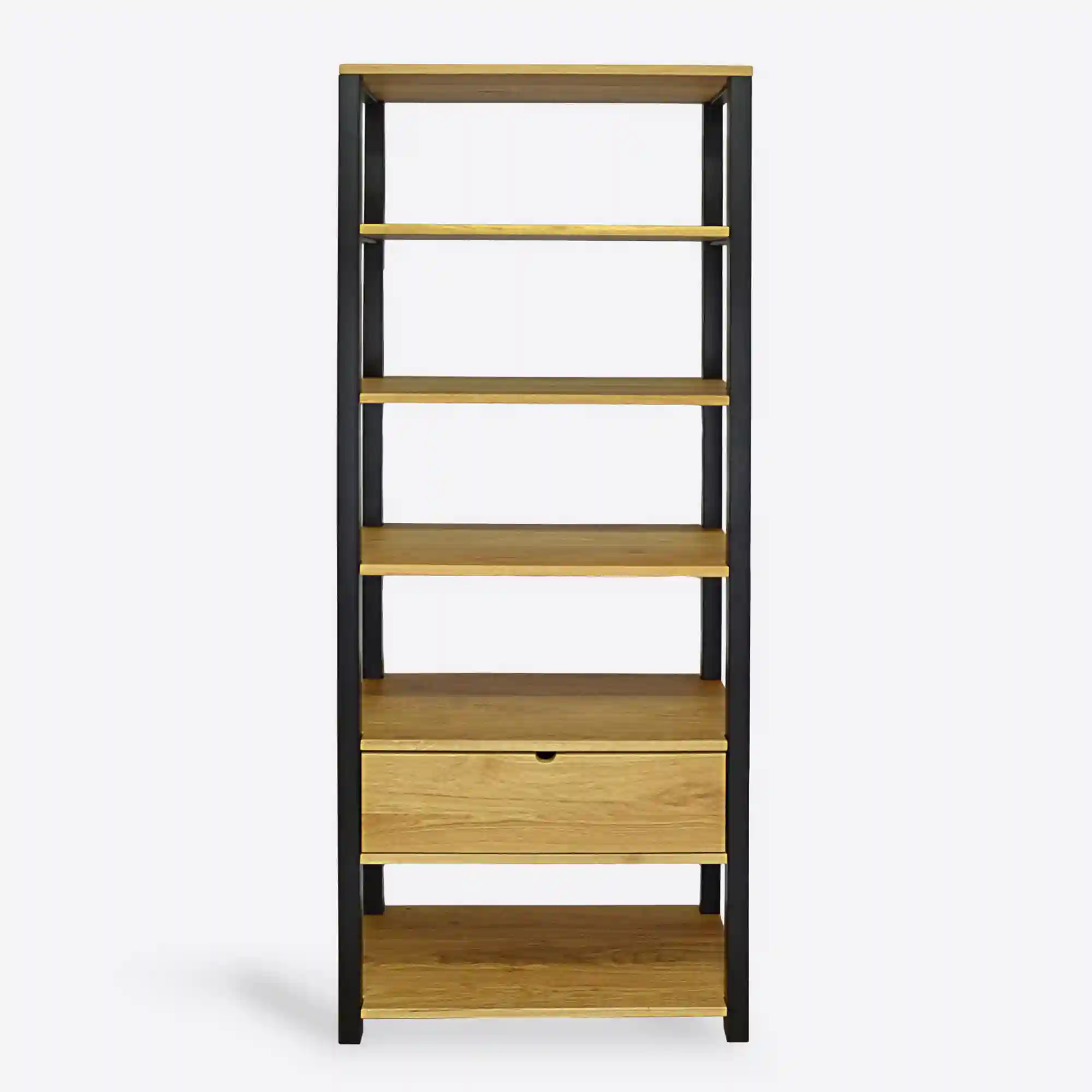 Holzbücherregal COLIN ist eine raffinierte Komposition aus massivem Eichenholz und Stahl. Es stellt eine geschmackvolle Option für das Wohnzimmer, das Büro oder das Wohnzimmer dar. Das Loftregal ist aus robustem massivem Eichenholz gefertigt. Die Beine sind aus pulverbeschichtetem Stahl in Schwarz. Natürlich besteht die Möglichkeit, die Farbe des Holzes und des Stahls zu ändern sowie andere Anpassungen am Regal vorzunehmen. Das Designerregal verfügt über fünf Regalböden und eine Schublade, was es äußerst geräumig und funktional macht. Das hölzerne Bücherregal COLIN, handgefertigt mit Liebe zur Verarbeitungsqualität, bietet hervorragende Haltbarkeit und Stabilität.