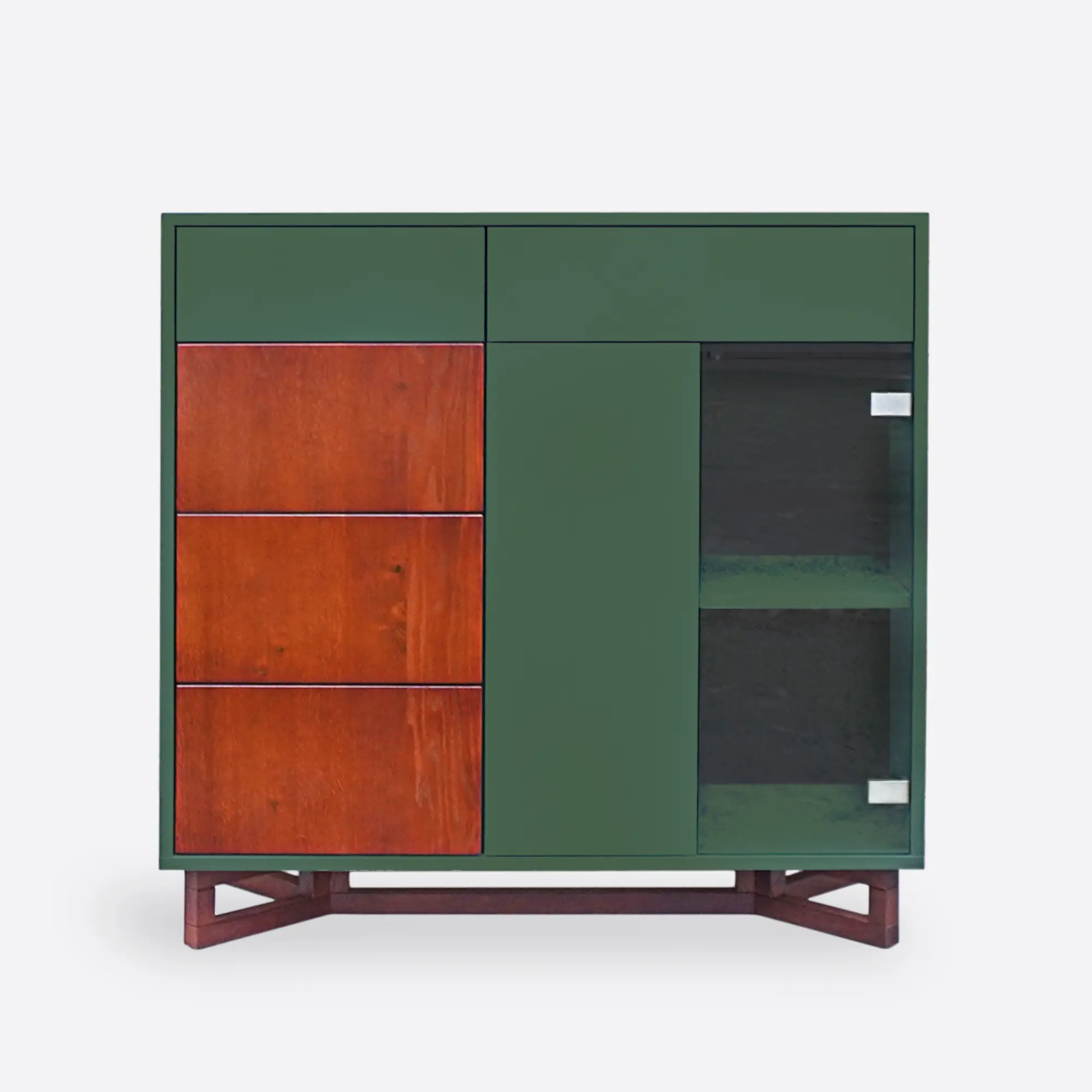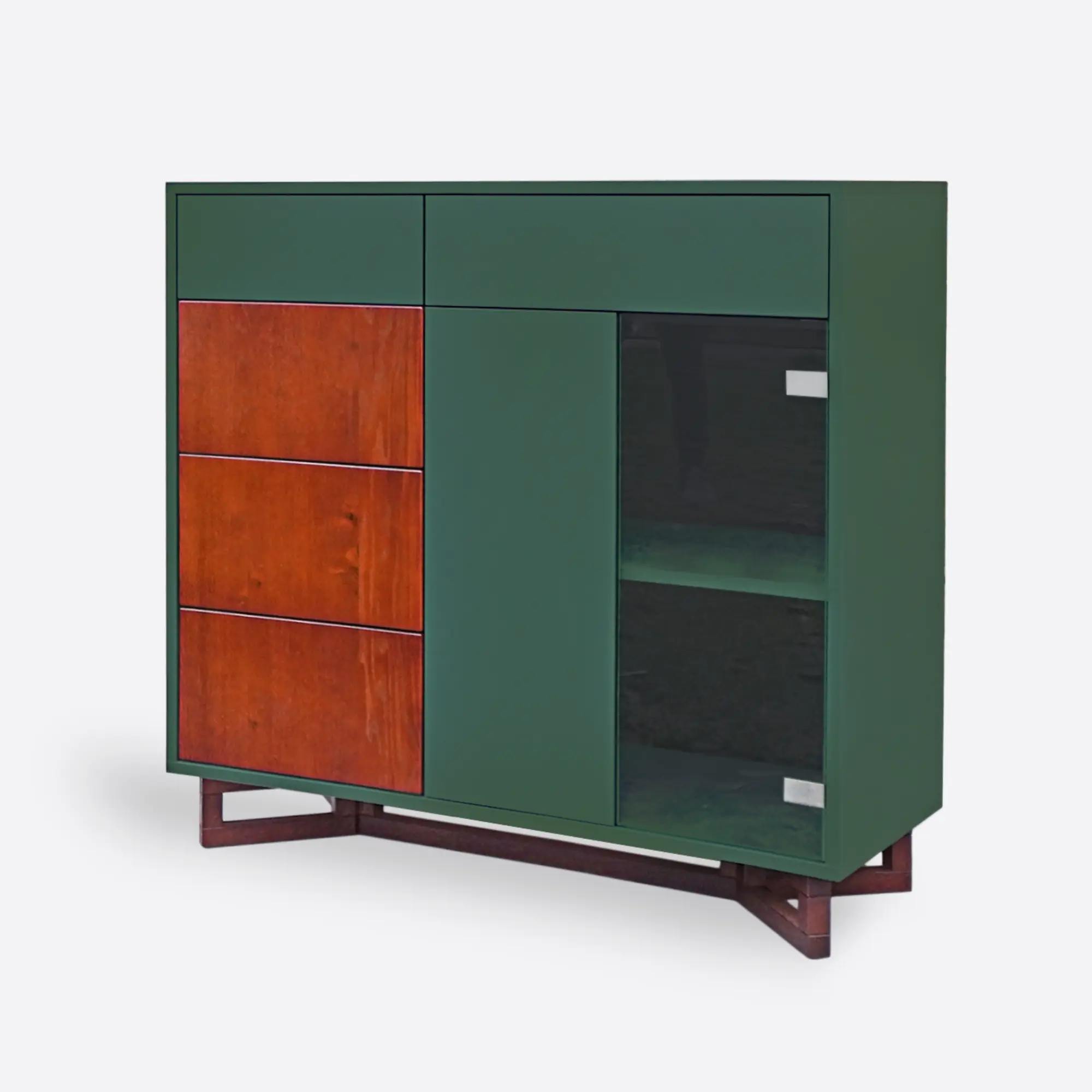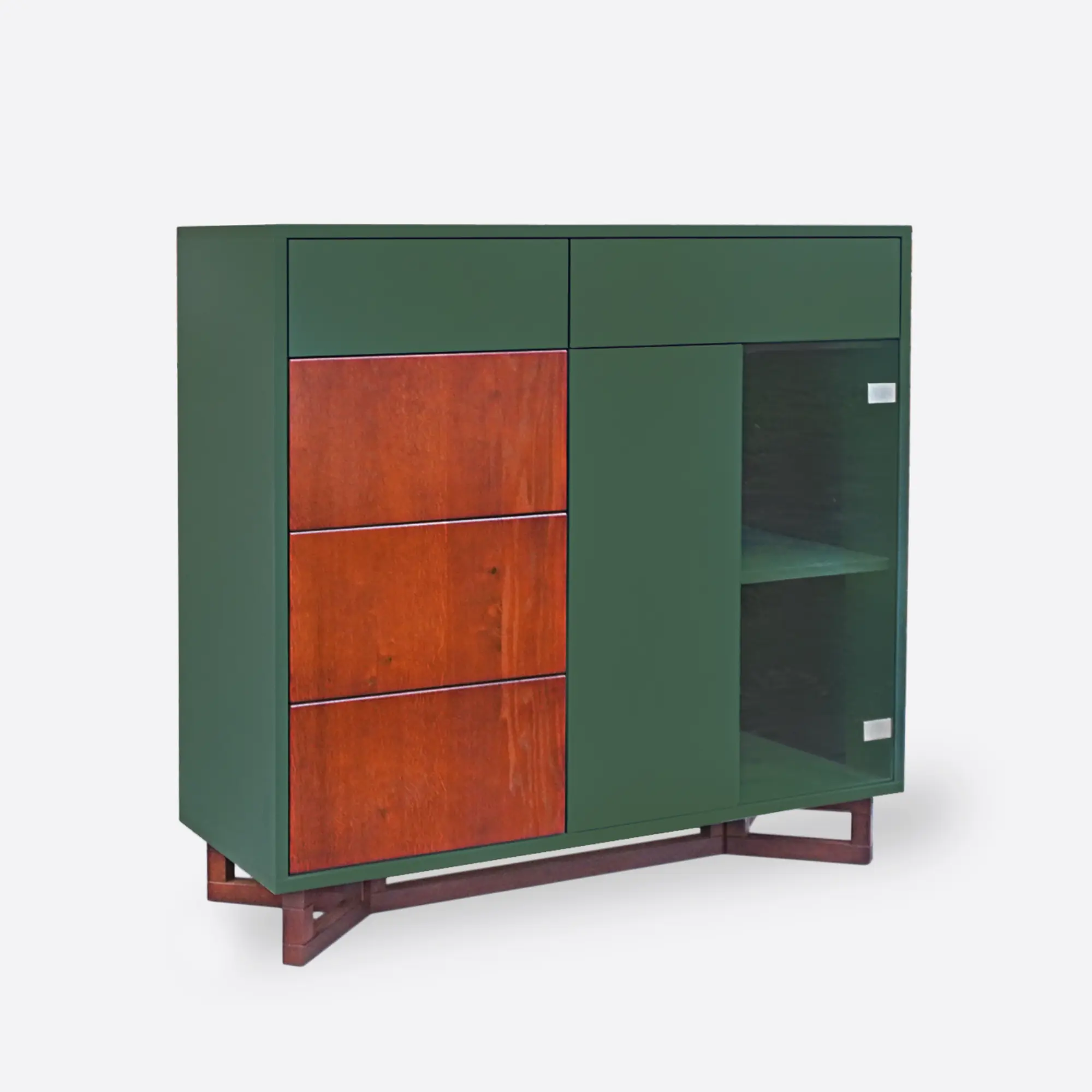 Die Holzkommode mit Schubladen aus Holz und einer NORD-Platte ist ein Möbelstück, das ein modisches und funktionales Interieur schafft. Das Möbelstück ist aus laminiertem Material in der Farbe Labrador gefertigt. Die Fronten von drei Schubladen und einem Schrank bestehen aus massivem Eichenholz in der Kirschfarbe. Darüber hinaus wurden die Türen auf der rechten Seite aus Glas gefertigt, um interessante Dekorationen auf interessante Weise zu präsentieren. Die Beine des Möbelstücks sind aus Eichenholz gefertigt. Holzkommoden und Kommoden aus Kiefernholz sind solide und langlebige Möbelstücke. Diese Designer-Kommode ist mit fünf Schubladen und zwei Regalen ausgestattet, in denen Sie viele Dinge des täglichen Gebrauchs sicher aufbewahren können, und sie bietet gleichzeitig Sicherheit für deren Aufbewahrung. Die moderne Form der Holzkommode in Verbindung mit einer praktischen und soliden Konstruktion aus Schubladen und Schränken schafft eine elegante und vielseitige Einheit. Die Holzkommode mit Holzschubladen und einer Platte wird eine hervorragende Ergänzung sowohl für das Esszimmer, das Wohnzimmer als auch den Wohnbereich sein. Holzkommoden sind vielseitige Möbelstücke. Wir fertigen Holzkommoden und andere Möbelstücke von Hand, was eine Garantie für ein originelles und einzigartiges Aussehen bietet.