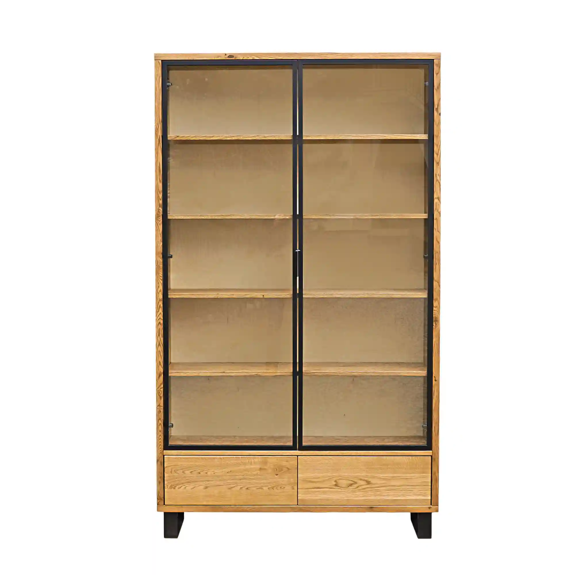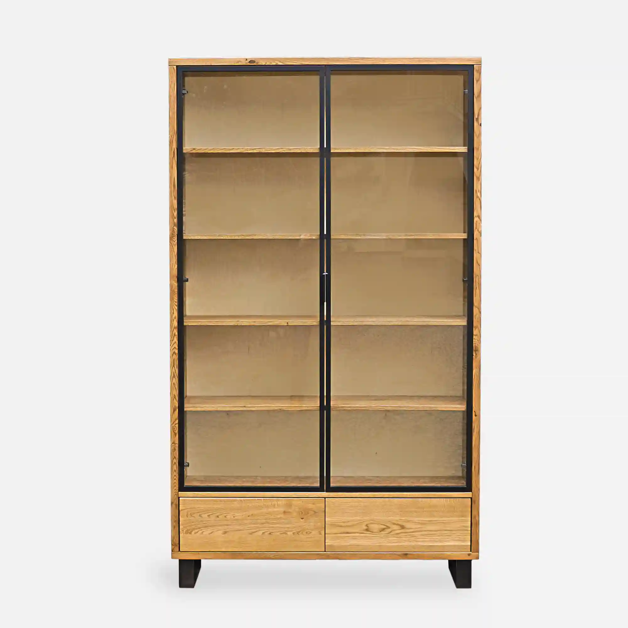 Die Holzvitrine DELIO IV besteht aus massivem Eichenholz und Metalldetails, die ihr den für den Loft-Stil charakteristischen rohen, industriellen Look verleihen. Das Möbel hat eine einfache, geometrische Form, ohne unnötige Verzierungen. Die Tür ist aus Glas, so dass das Innere der Vitrine einsehbar ist und der Inhalt präsentiert werden kann. Die Holzvitrine ist funktional und bietet reichlich Stauraum. Sie kann der perfekte Ort für Ihr Geschirr oder Ihre Gläser sein, das auf den Eichenholzböden schön aussieht. Die stabilen Einlegeböden aus Eichenholz bieten viel Platz für Bücher, Dekorationen oder Sammlungen von Glasvasen und Porzellansammlungen. Die rohe, natürliche Maserung des Holzes verleiht dem Möbelstück Authentizität und bringt Wärme in den Raum. Das Modell mit zwei Schubladen mit geräuschlosem Schließmechanismus ist eine gute Wahl für die Aufbewahrung von Dokumenten oder Gegenständen, die Sie verstecken möchten. Solche Lösungen bringen Ordnung in Ihr Wohnzimmer. Die Eichenholzvitrine DELIO IV hat nicht nur eine praktische Funktion, sondern ist auch ein unverwechselbares dekoratives Element, das dem Raum einen einzigartigen Charakter verleiht.