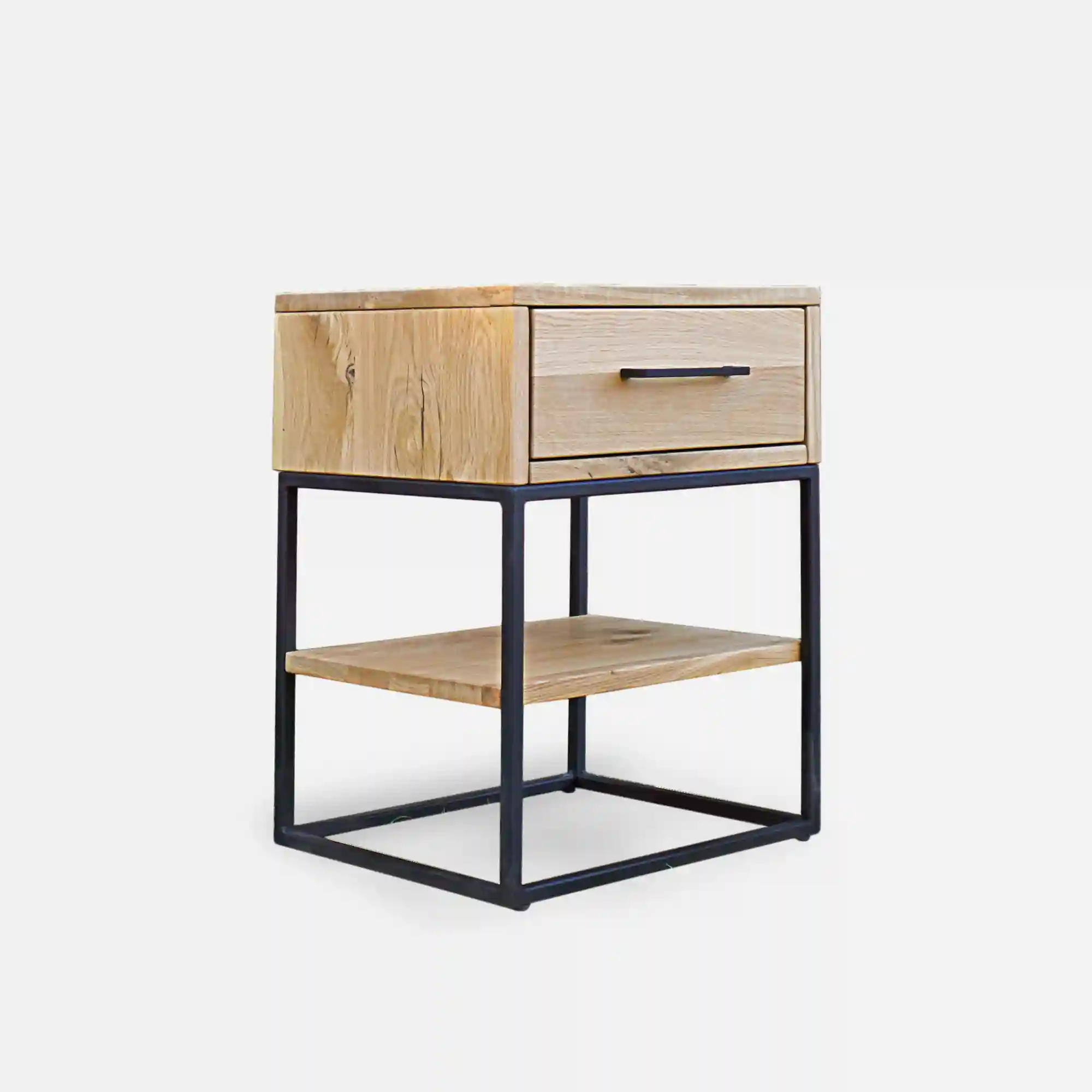 Der Eichen-Nachttisch im industriellen Stil, MERIS I, ist ein Vorschlag für einen Nachttisch im modernen, loftartigen und industriellen Stil. Dieser industrielle Eichen-Nachttisch zeichnet sich vor allem durch seine einfache und vielseitige Form aus, die in nahezu jedes Schlafzimmer passt. Der loftartige Nachttisch wurde aus natürlicher Eiche und pulverbeschichtetem Stahl in Schwarz gefertigt. Industrielle Nachttische aus massiver Eiche und Stahl bieten ein modernes Design und verbinden Funktionalität mit einem einzigartigen ästhetischen Erscheinungsbild. Die Wärme des natürlichen Eichenholzes verleiht dem Raum Gemütlichkeit, während das Metall ihm Charme verleiht. Der Eichen-Nachttisch verfügt über eine praktische Schublade und ein Regal, das je nach Bedarf des Kunden herausgenommen werden kann. Auf speziellen Kundenwunsch kann der Nachttisch auch mit zwei Schubladen angefertigt werden. Nachttische sind ein unverzichtbares Element in jedem Schlafzimmer. Der loftartige Eichen-Nachttisch MERIS I mit seinem ungewöhnlichen Design zieht sicherlich die Aufmerksamkeit auf sich und verleiht jeder Einrichtung Charme.