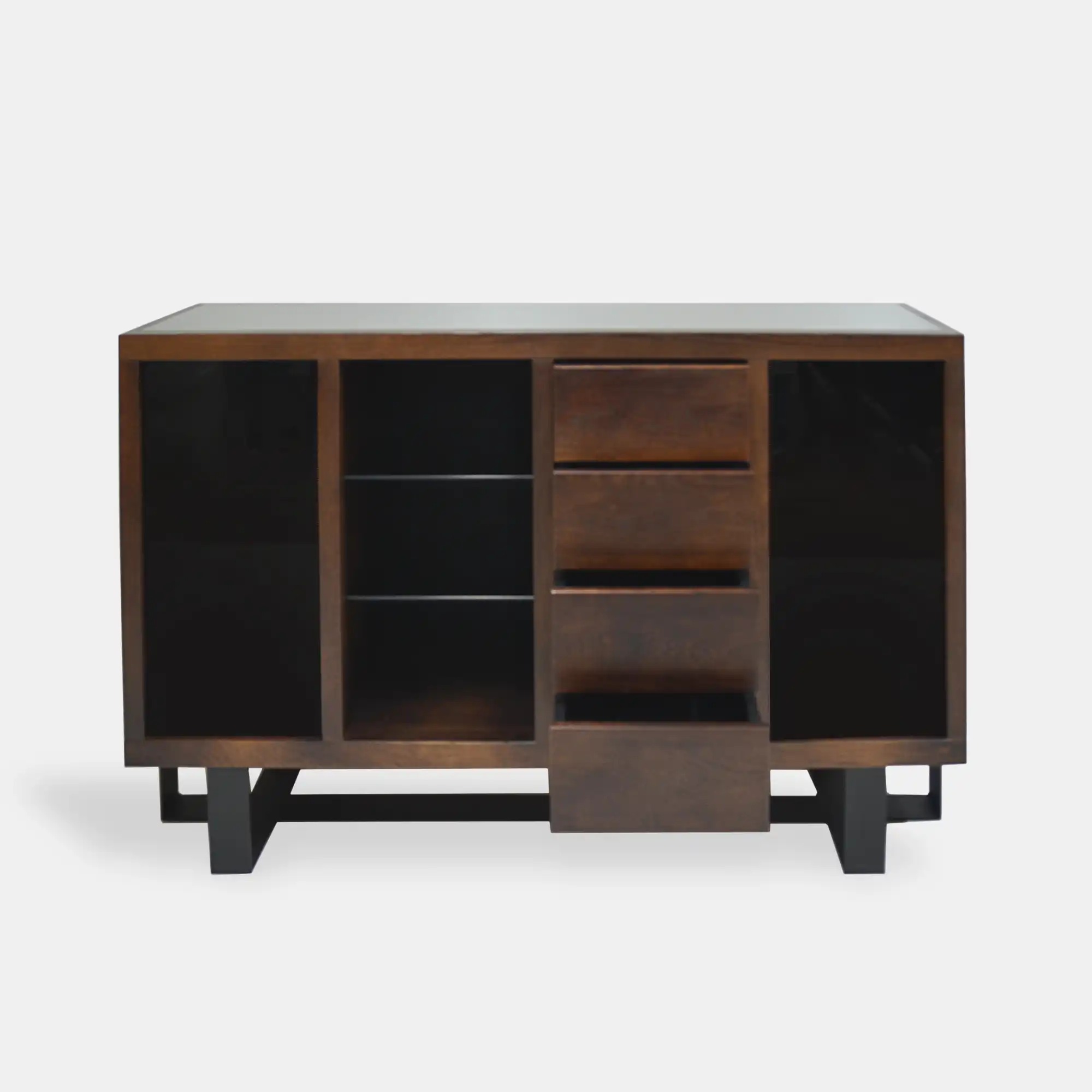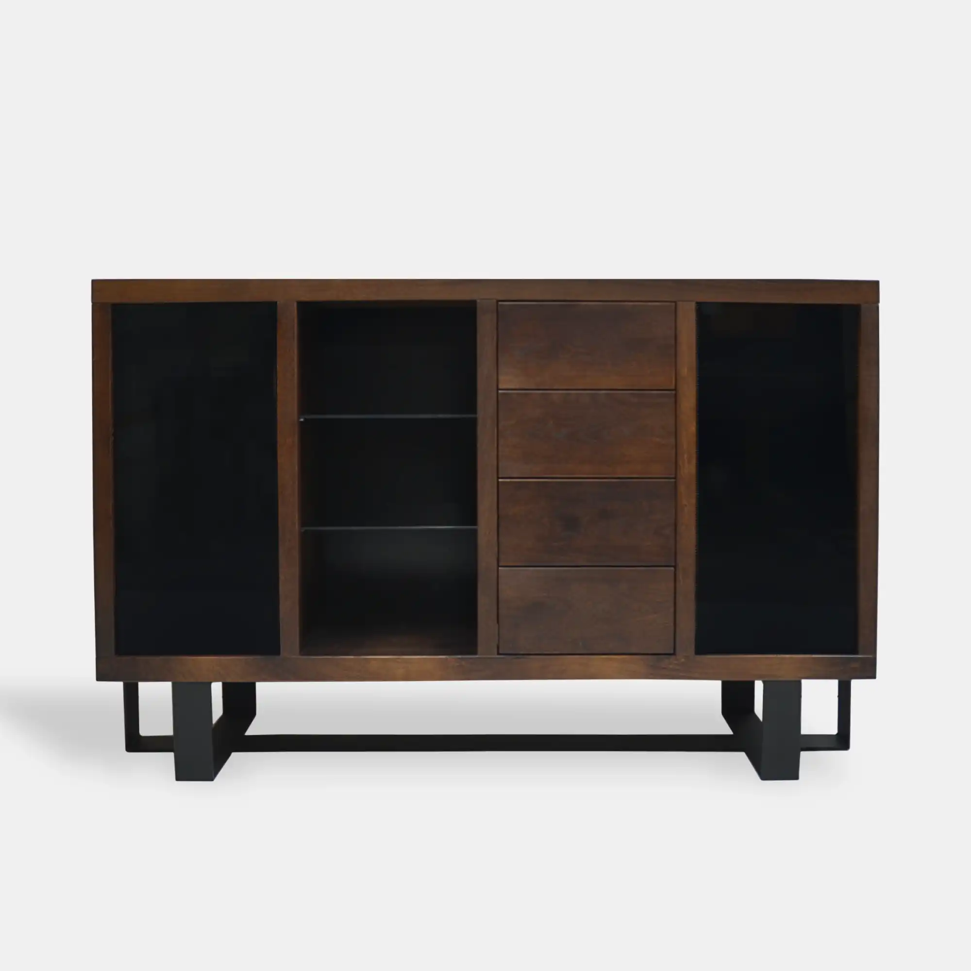 Industrielle Kommode aus Eiche MOCCA I ist eine ausgezeichnete Wahl für jedes Wohnzimmer, Schlafzimmer sowie Büro. Loftkommode besteht aus massivem Eichenholz, während die Fronten der Seitenschränke und Regale aus Glas bestehen. Die Basis der Kommode besteht aus pulverbeschichtetem Stahl. Sowohl das Eichenholz als auch der Stahl sorgen für die Haltbarkeit und Ästhetik der Möbel für viele Jahre. Eichenkommode hat vier Schubladen und neun Regale, was es sehr geräumig und funktional macht. Die mit Metallakzenten in Schwarz angereicherte Kommode aus Holz wird alle Blicke auf sich ziehen. Holzkommode mit Schubladen und Regalen passt perfekt in industrielle, klassische und modernere Innenräume. Industrielle Eichenkommode MOCCA I ist die ideale Wahl für alle, die Funktionalität und einzigartiges Design in Kombination mit höchster Qualität schätzen.