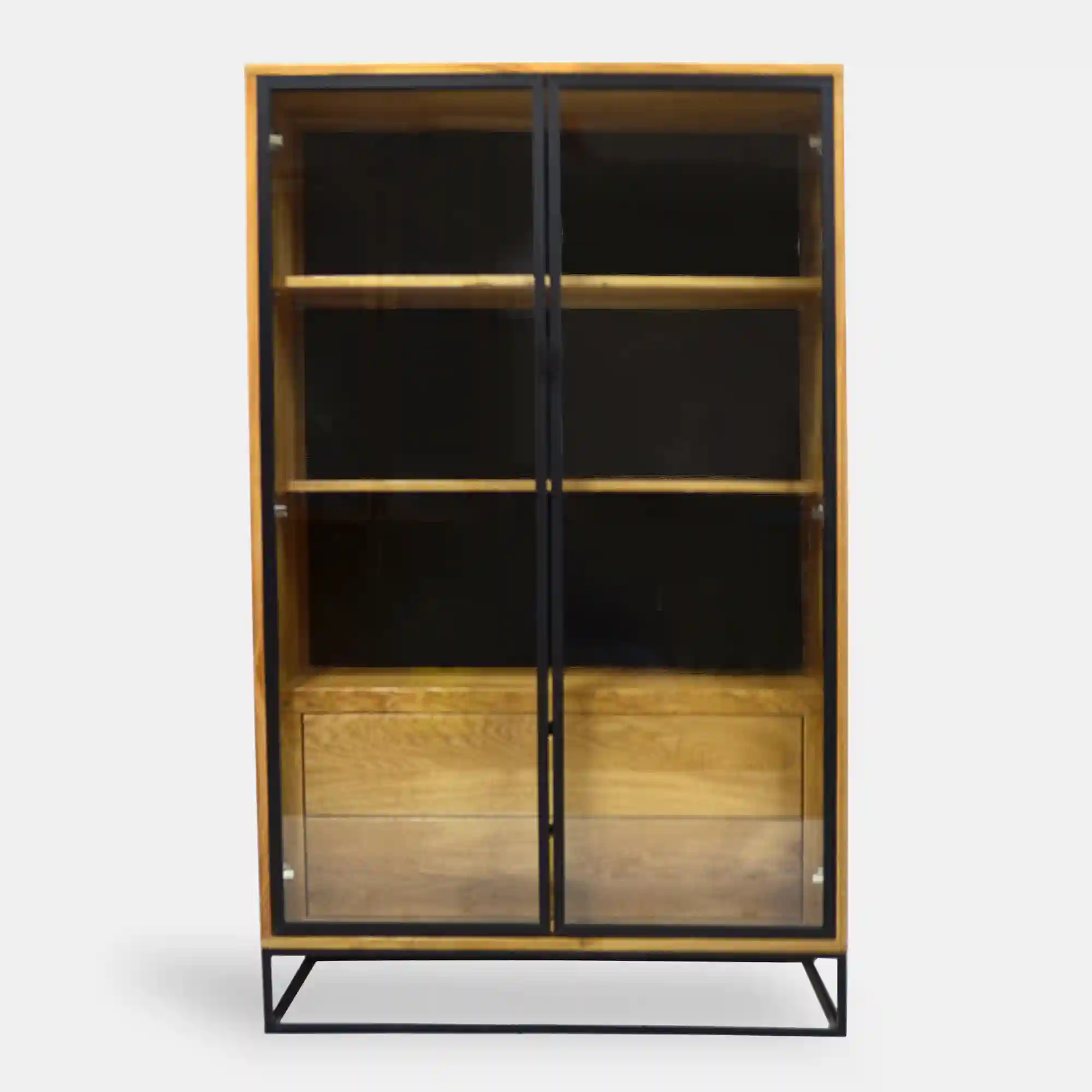 Industrielle Vitrine aus natürlichem Massivholz passt perfekt in Loft-Interieurs. Darüber hinaus ist die Struktur des Holzes deutlich sichtbar und jedes Möbelstück erhält ein Unikat. Industrielle Vitrinen heben sich in der Kategorie der Holzmöbel deutlich ab. Der industrielle Stil zeichnet sich durch die Kombination der Rohheit von Metall und den warmen Farben von Massivholz aus. Auf der einen Seite cool und streng, auf der anderen extrem modisch und einzigartig. Metallelemente kontrastieren mit dem natürlichen Material und verleihen den Möbeln gleichzeitig einen wirklich industriellen Charakter. Vitrine im industriellen Stil bietet Ihnen viel Platz, um Ihre Souvenirs, Dekorationen oder Lagerbücher, Ordner im Arbeitszimmer auszustellen. Möbel im industriellen Stil verleihen dem Interieur Eleganz und Charakter.