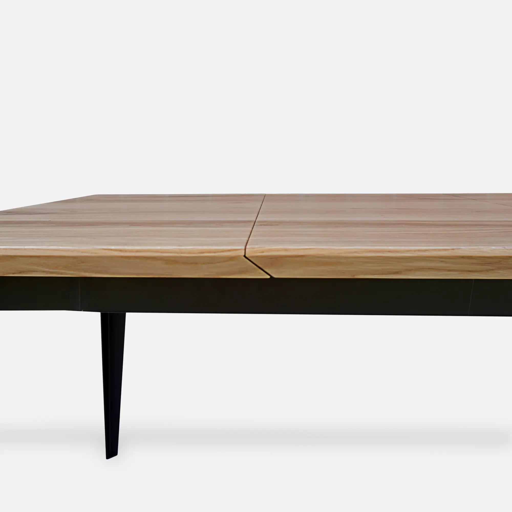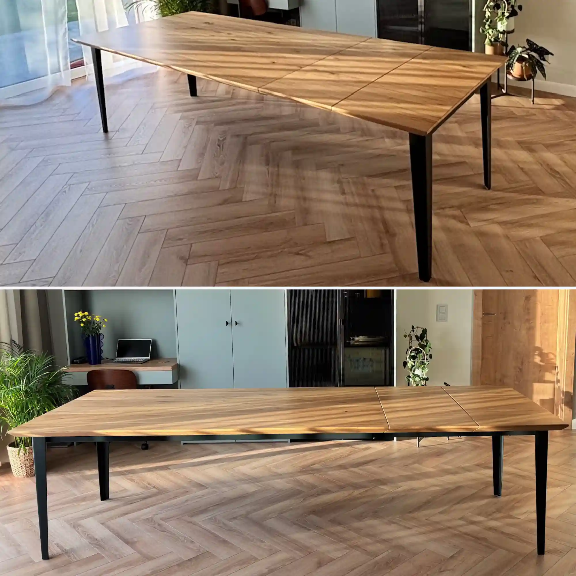 Bei unseren Ausziehtischen sind die Gleitschienen für die Montage der Extras geschickt in die Metallstruktur integriert, was ein reibungsloses und bequemes Ausklappen ermöglicht. Die Tischplattenverlängerungen selbst, die eine schnelle Vergrößerung der Tischfläche ermöglichen, müssen separat aufbewahrt werden. Um die Organisation zu erleichtern, legen wir jeder Bestellung eines Tisches mit Verlängerungen eine elegante Aufbewahrungsbox kostenlos bei. Dank dieser praktischen Lösung bleibt die Form des Tisches erhalten, und die Anbauten belasten die Tischstruktur nicht. Unsere Ausziehtische sind der Inbegriff von Funktionalität: Nach dem Hinzufügen der Verlängerungen ist die Holzmaserung auf der gesamten Tischplatte perfekt durchgängig und sorgt für ein harmonisches Erscheinungsbild. Werfen Sie einen Blick auf unsere komplette Kollektion von Massivholztischen und Couchtischen, die jede stilvolle Einrichtung perfekt ergänzen.