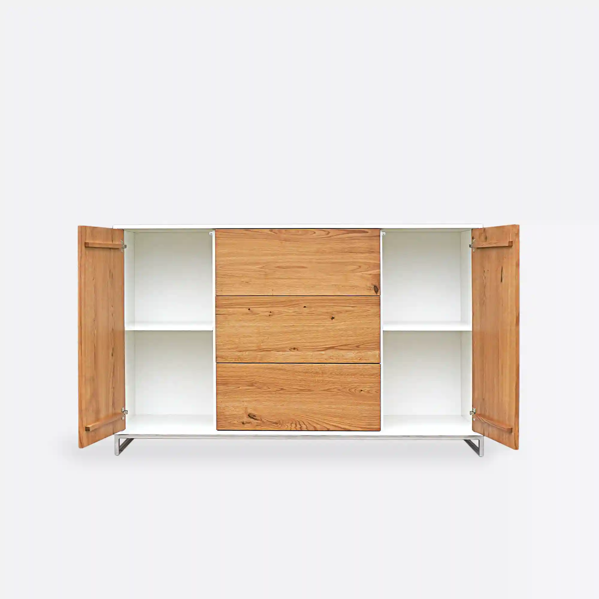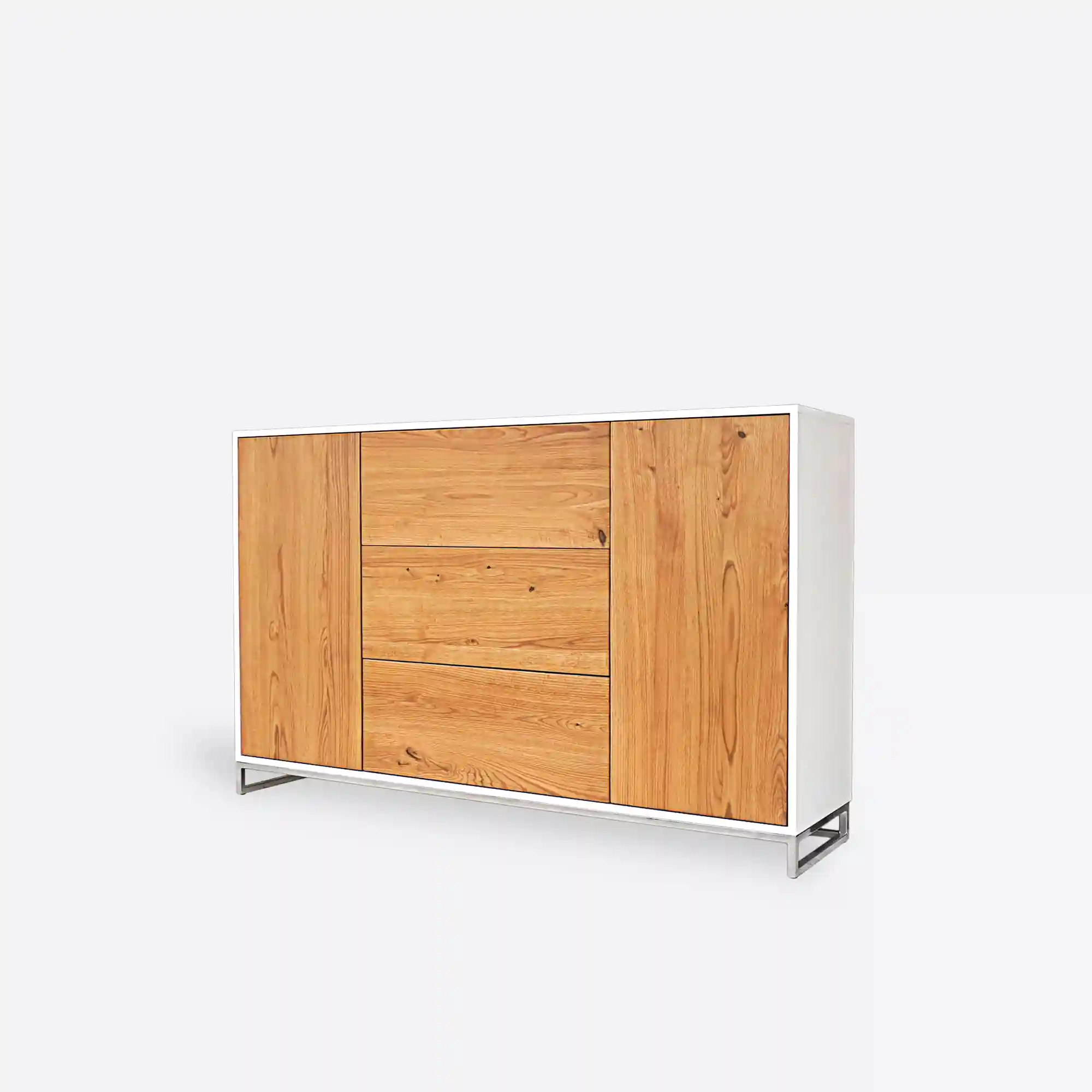 Kommode aus Eiche im Industriestil ADEO IV ist ein geräumiges und elegantes Möbelstück, das sich ideal für eine Vielzahl von Innenräumen eignet. Aus Eichenholz und laminierter Platte gefertigt, mit verchromten Stahlbeinen, verbindet sie Haltbarkeit und modernes Design. Ausgestattet mit drei geräumigen Schubladen und zwei Schränken, bietet es viel Stauraum. Die Kommode ADEO IV eignet sich sowohl für das Schlafzimmer als auch für das Wohn- und Arbeitszimmer und fügt sich in die Ästhetik des Loft-Stils ein. Sie verbindet harmonisch Naturholz mit Metallelementen. Die Kommode im Stil einer Kombination aus weißer Möbelplatte und Holzfronten ist eine perfekte Wahl für Innenräume mit modernem, skandinavischem oder minimalistischem Stil. Diese Kombination von Materialien und Farben schafft einen angenehmen Kontrast – das Weiß verleiht Leichtigkeit und Eleganz, während das Holz Wärme und Natürlichkeit vermittelt.
