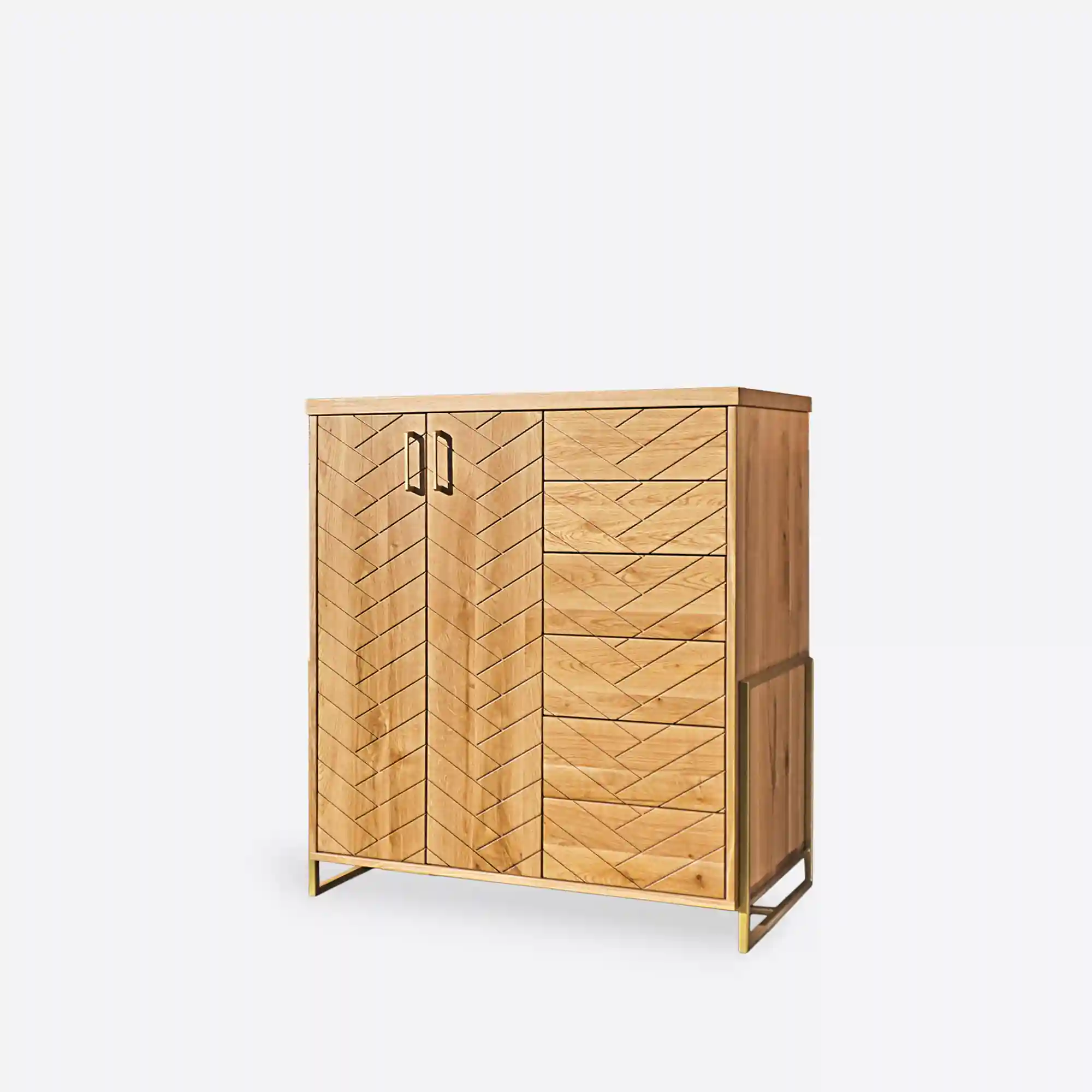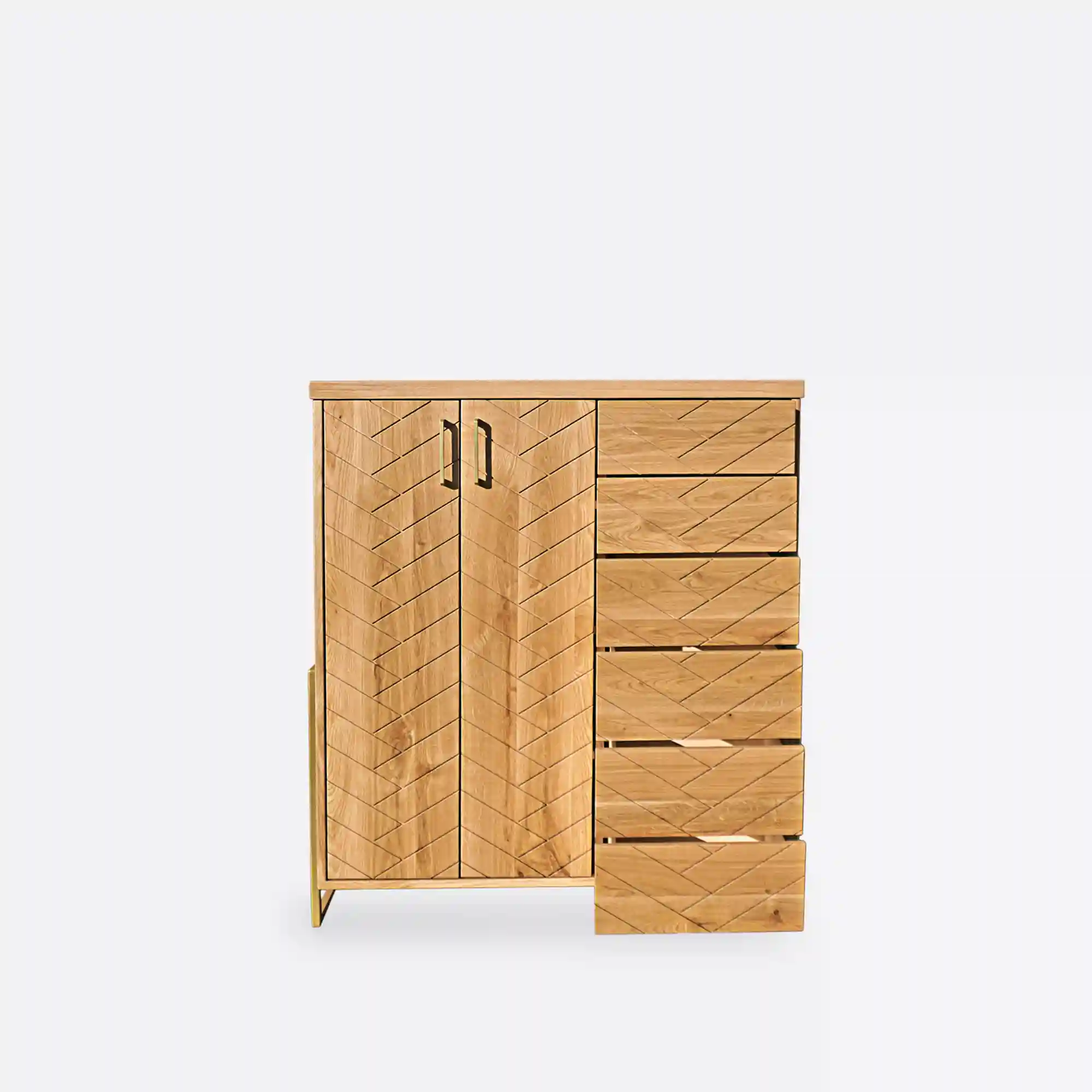 Kommode aus Eichenholz mit Fischgrätmuster CARIN ist ideal für Wohnzimmer oder Schlafzimmer. Möbel sind aus natürlichem Eichenholz, das solide, langlebig und schön ist. Beinen und Griffe sind jedoch aus pulverbeschichtetem Stahl in Gold gefertigt. Warme Farbe aus natürlicher Eiche fügt sich perfekt mit den Elementen aus Goldstahl zusammen. Moderne Holzschrank hat großen Schrank mit Regal in der Mitte und vier Schubladen. Eichenkommode CARIN ist sehr geräumig und funktional und viel Stauraum bietet. Fronten des Kommode sehen sehr interessant aus, dank der Art, wie das Holz in einem Fischgrätenmuster platziert wird, was den ursprünglichen Effekt verleiht. Kommode aus Eichenholz mit Fischgrätmuster CARIN ist Kombination aus modernem Stil und klassischem Design, die perfekt in Ihr Wohnzimmer passt.