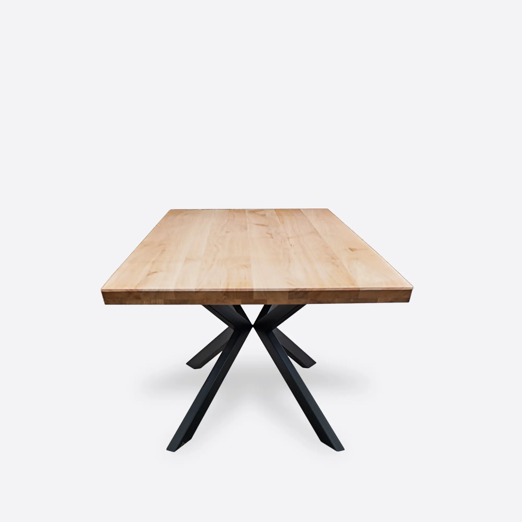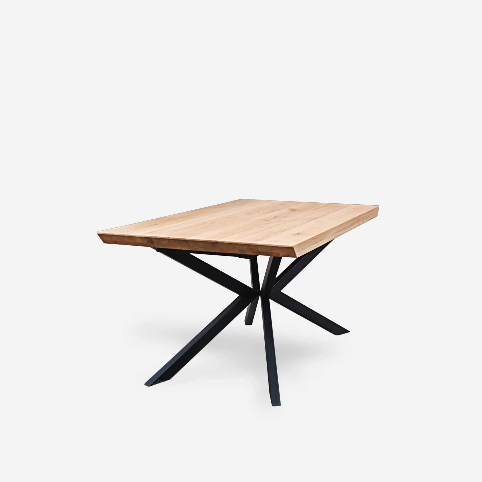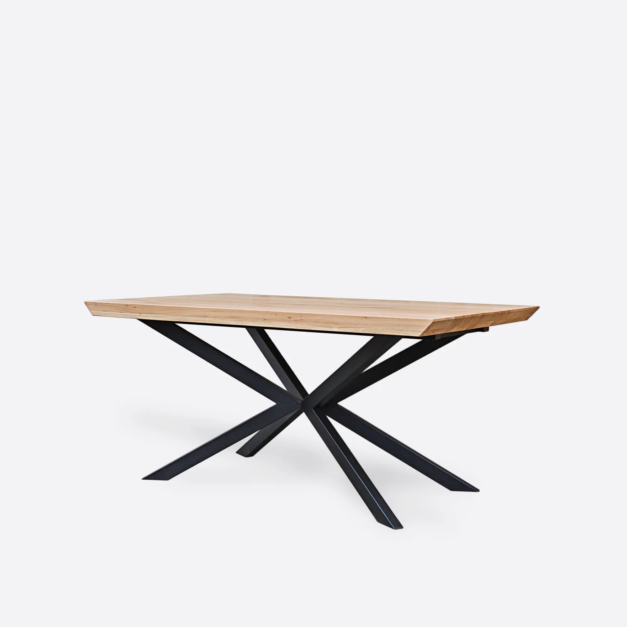 Der DEVON Eichenholz Esstisch im Loft-Stil mit einer interessanten und unkonventionellen Tischgestaltung im Loft-Stil wurde aus sorgfältig ausgewähltem natürlichen Eichenholz gefertigt. Die Wärme des natürlichen Materials in Kombination mit dem kühlen Stahl ergibt einen bezaubernden Effekt. Die solide und massive Tischplatte, die auf einem metallenen Gestell ruht, ist eine ideale Wahl für Menschen, die originelle Lösungen schätzen. Dank seiner Konstruktion ermöglicht dieser moderne Eichenholztisch im Loft-Stil angenehme Momente in komfortabler Umgebung. Die interessant gestalteten Beine des Loft-Tisches, die in der Mitte zusammenlaufen, wurden aus pulverbeschichtetem Stahl in Schwarz gefertigt. Die Farbe der Beine kann nach Ihren eigenen Vorlieben geändert werden. Entscheiden Sie sich für ein dezentes Weiß, subtilen Chrom oder tiefes Schwarz? Unsere Holztische werden mit Leidenschaft hergestellt, und wir achten auf jedes Detail. Die Eichenholzplatte kann in einem von 32 Farben eingefärbt werden, entsprechend Ihrer eigenen Vorstellung. Die Kanten der Tischplatte können gerade oder mit einer Schweizer Kante gestaltet werden, um dem Holztisch ein raffinierteres Aussehen zu verleihen.