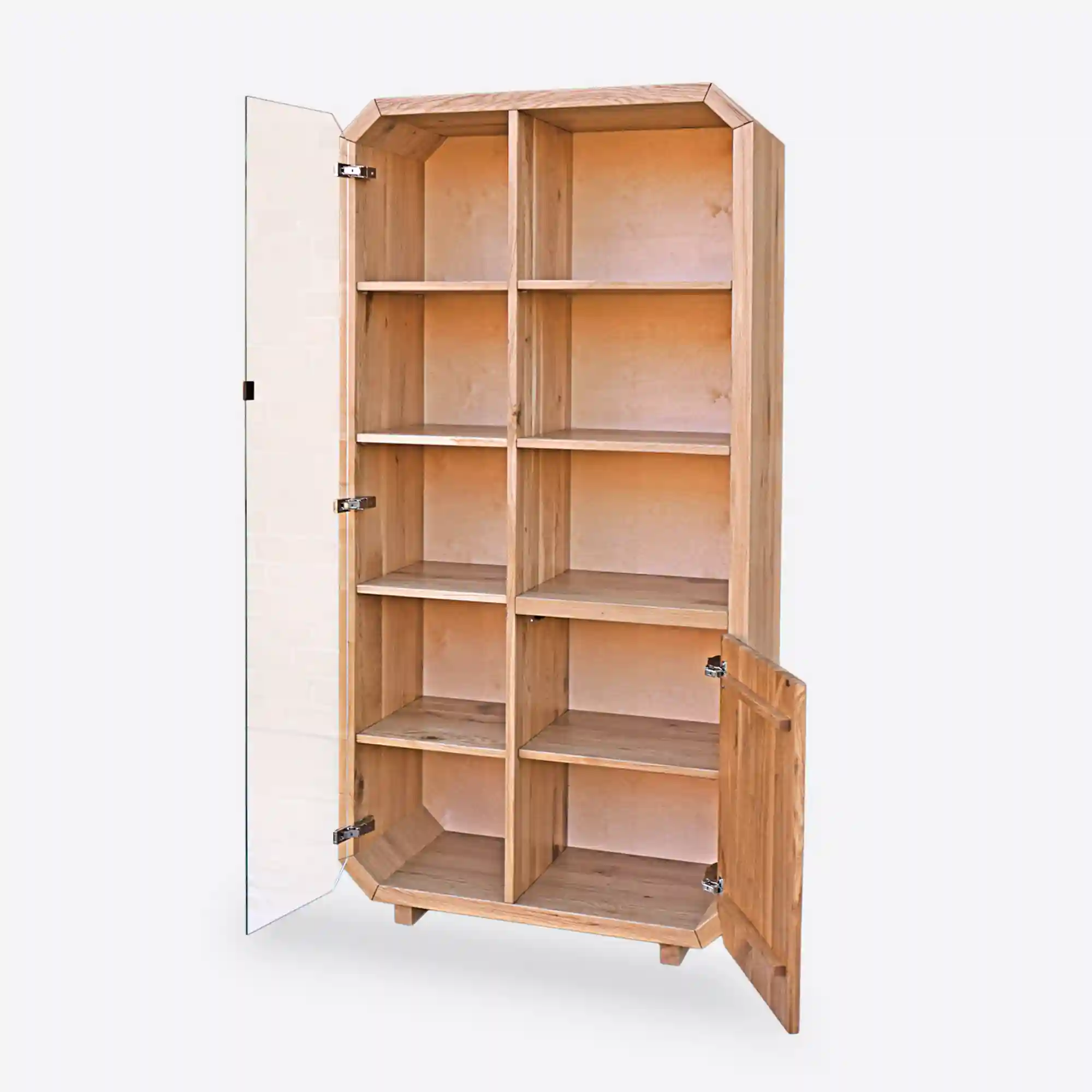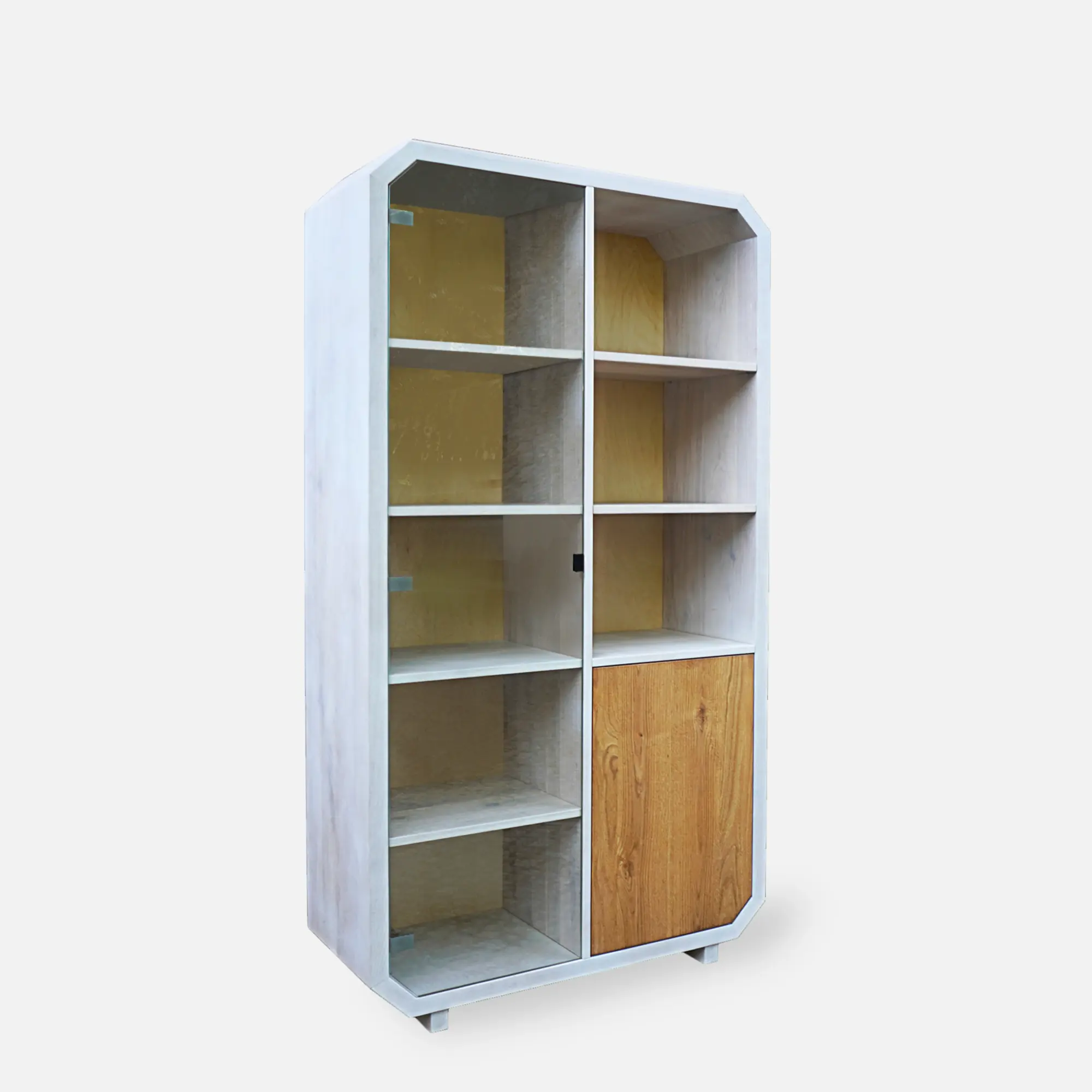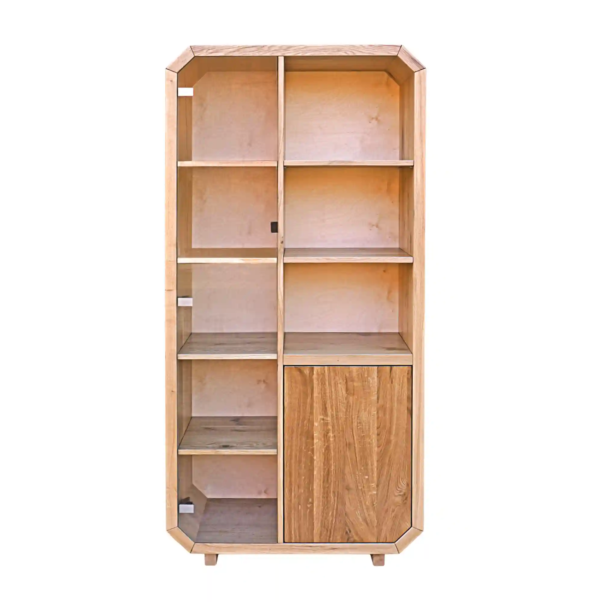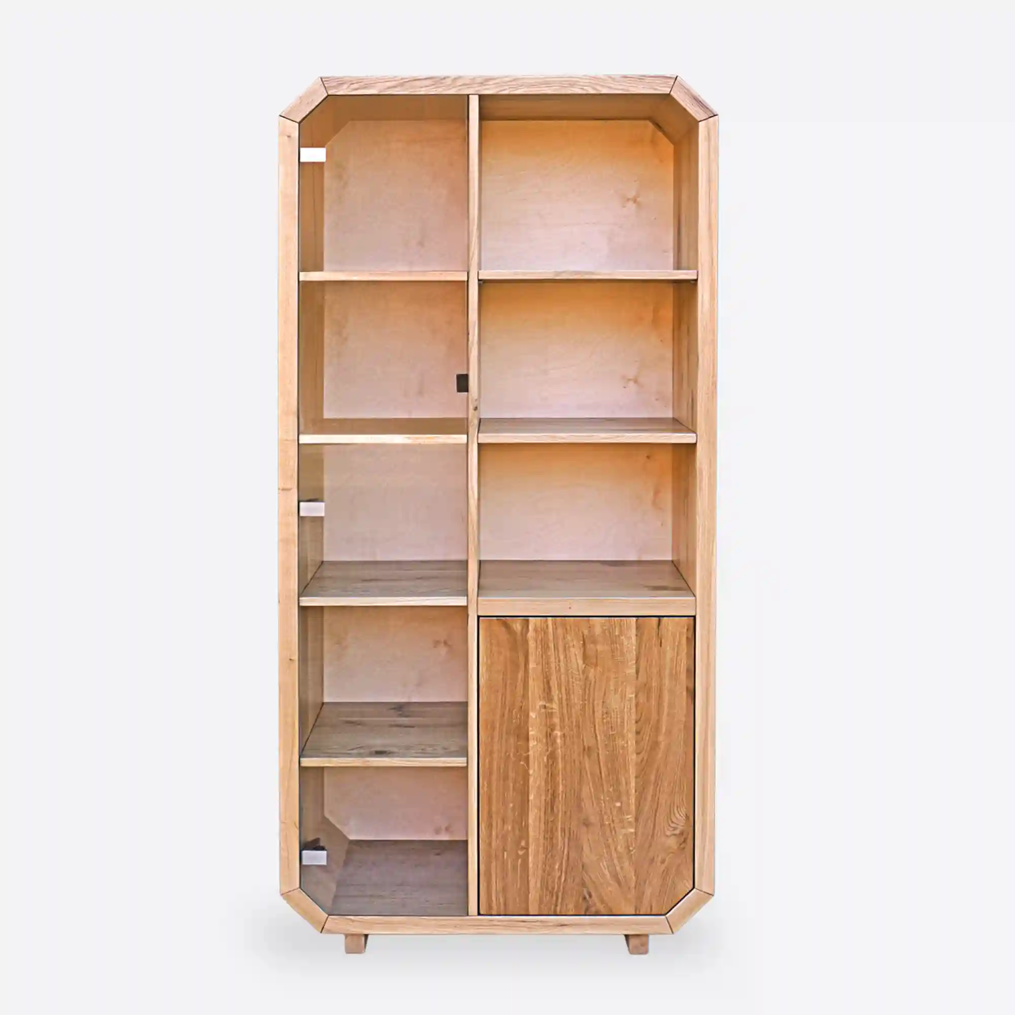 Massiver Bücherregalständer für das Wohnzimmer OMNIS OMNIS ist ein handgefertigtes Möbelstück von hoher Qualität. Der Korpus des Möbels besteht aus massivem Eichenholz, während die Front des unteren Schranks aus altem Holz gefertigt ist. Dank des Holzmaterials verleiht der Regalständer dem Raum eine warme und gemütliche Atmosphäre. Die gläsernen Türen verleihen dem Ganzen ein leichtes und offenes Erscheinungsbild. Die Form des Möbels bildet ein Achteck nach, was ihm im Vergleich zu anderen Möbelstücken Originalität verleiht. Auf der linken Seite des Holzbücherregals befinden sich 4 Regalböden, die hinter schwarzem Glas versteckt sind. Auf der rechten Seite befinden sich 3 offene Regalböden, und darunter eine Schublade mit einem Regalboden in der Mitte. Dieses Designer-Bücherregal ist daher sehr funktional und geräumig und ermöglicht eine bessere Organisation im Raum. Massiver Bücherregalständer für das Wohnzimmer OMNIS wird eine Bereicherung für jeden Raum sein, aufgrund seiner praktischen Form und Kapazität.