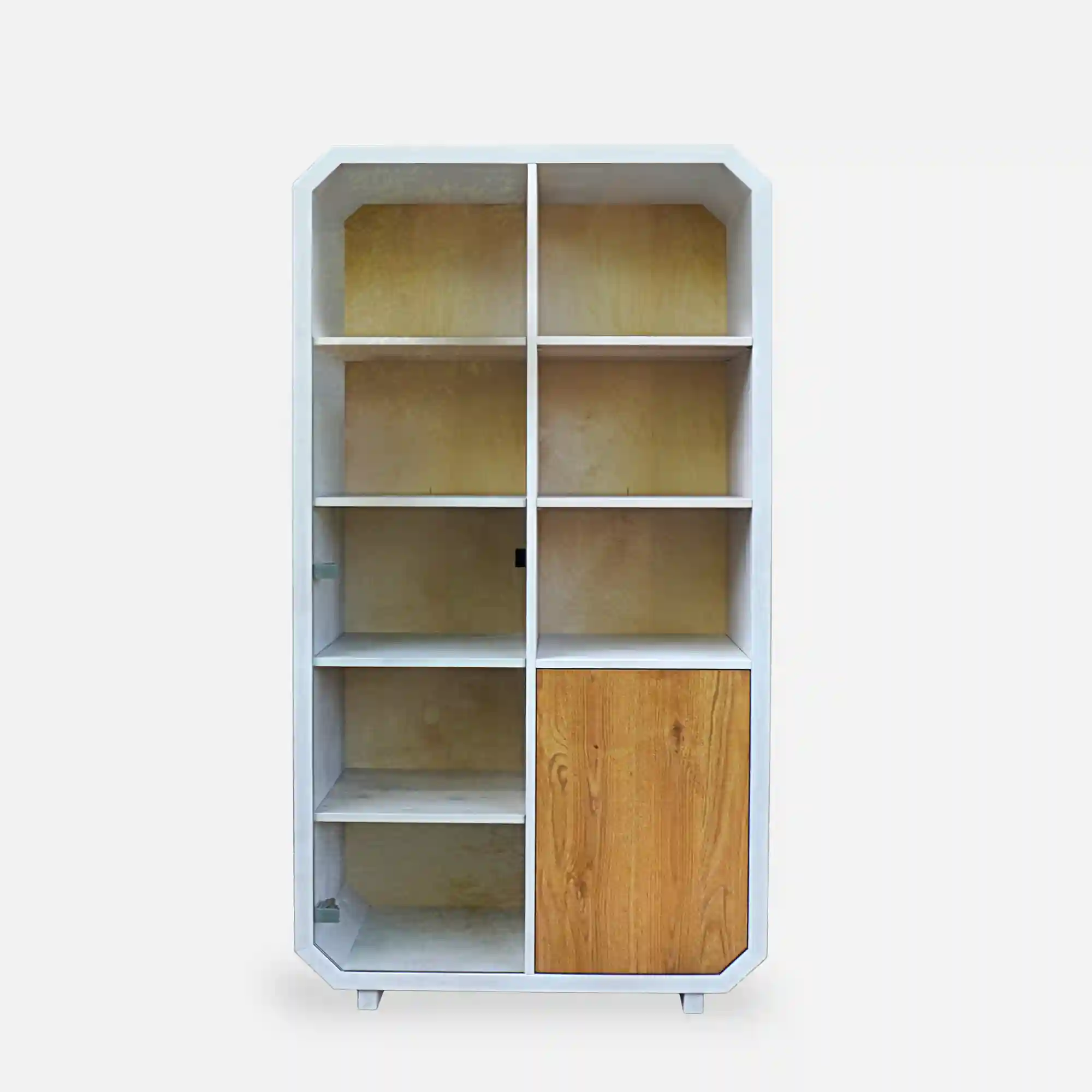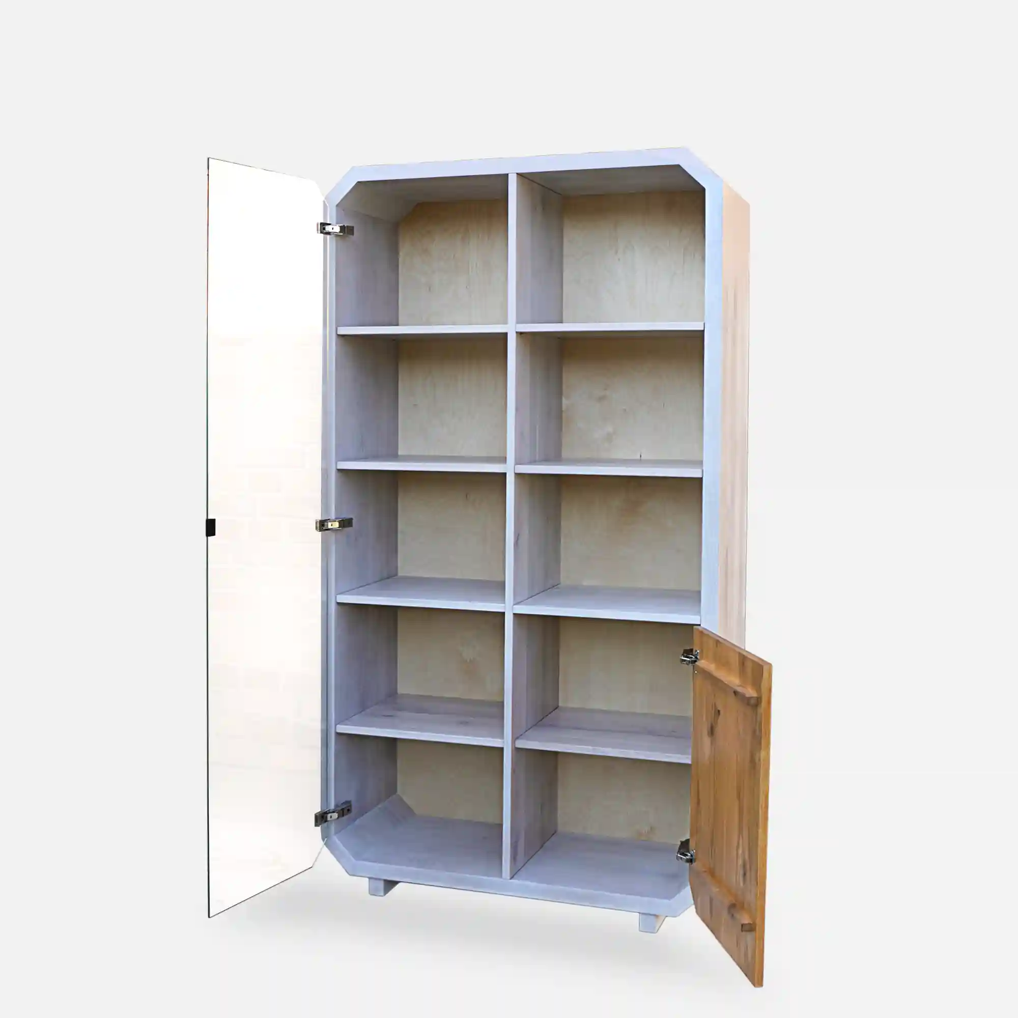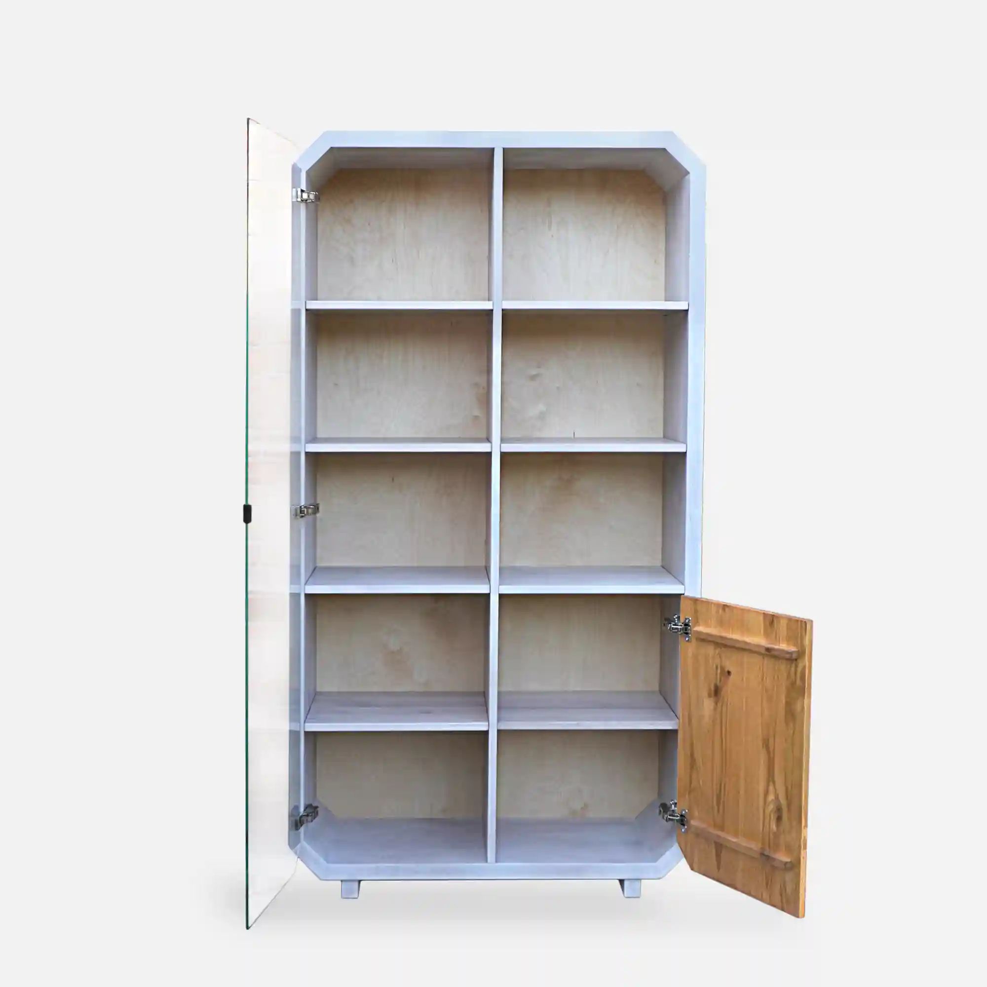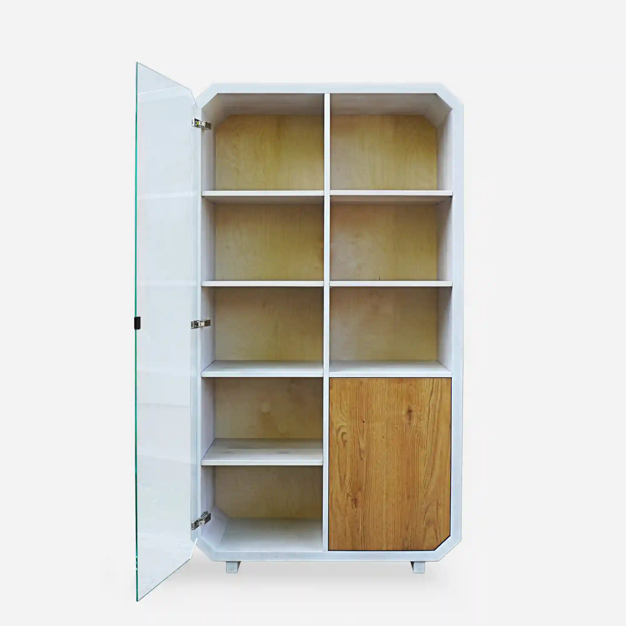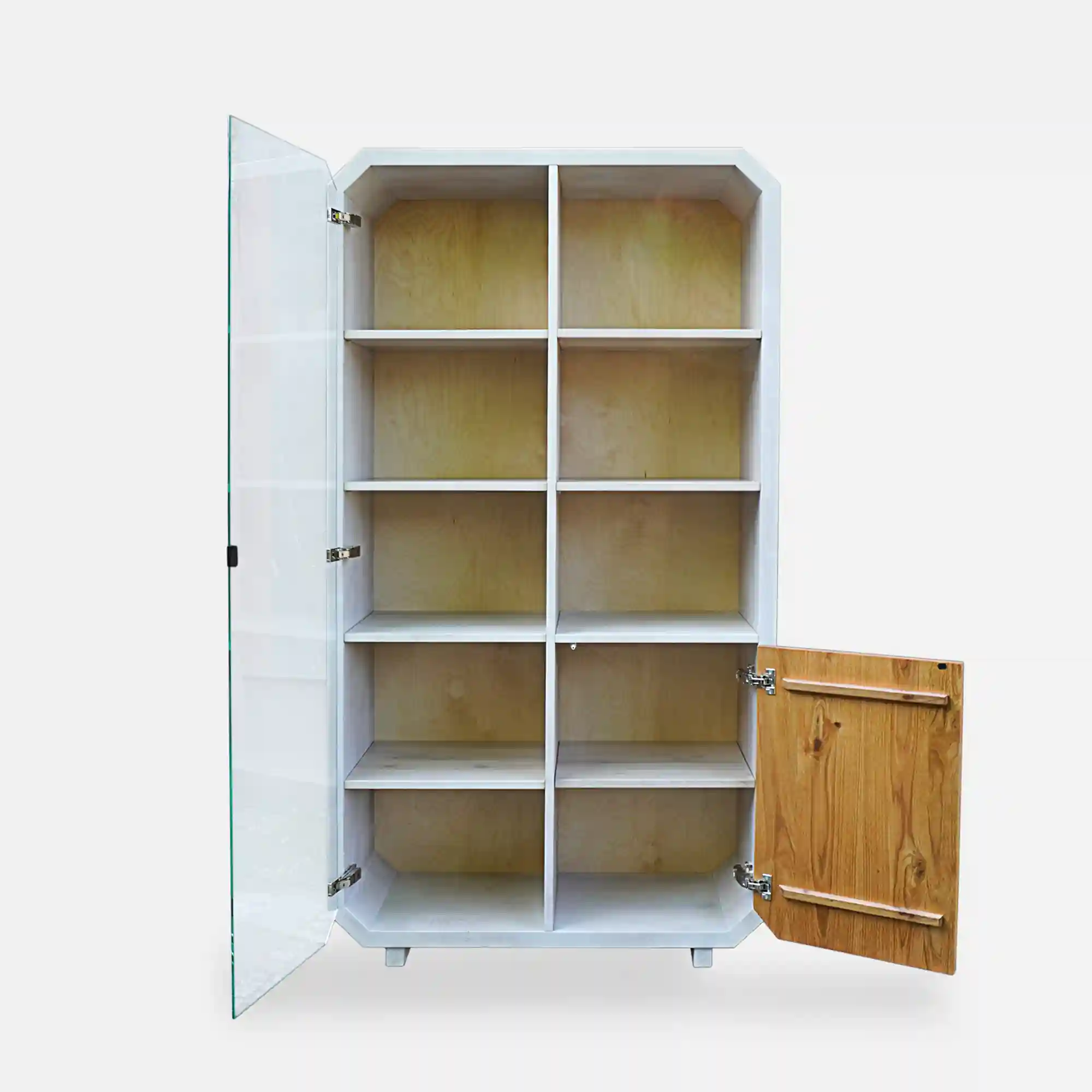 Massiver Bücherregalständer für das Wohnzimmer OMNIS OMNIS ist ein handgefertigtes Möbelstück von hoher Qualität. Der Korpus des Möbels besteht aus massivem Eichenholz, während die Front des unteren Schranks aus altem Holz gefertigt ist. Dank des Holzmaterials verleiht der Regalständer dem Raum eine warme und gemütliche Atmosphäre. Die gläsernen Türen verleihen dem Ganzen ein leichtes und offenes Erscheinungsbild. Die Form des Möbels bildet ein Achteck nach, was ihm im Vergleich zu anderen Möbelstücken Originalität verleiht. Auf der linken Seite des Holzbücherregals befinden sich 4 Regalböden, die hinter schwarzem Glas versteckt sind. Auf der rechten Seite befinden sich 3 offene Regalböden, und darunter eine Schublade mit einem Regalboden in der Mitte. Dieses Designer-Bücherregal ist daher sehr funktional und geräumig und ermöglicht eine bessere Organisation im Raum. Massiver Bücherregalständer für das Wohnzimmer OMNIS wird eine Bereicherung für jeden Raum sein, aufgrund seiner praktischen Form und Kapazität.