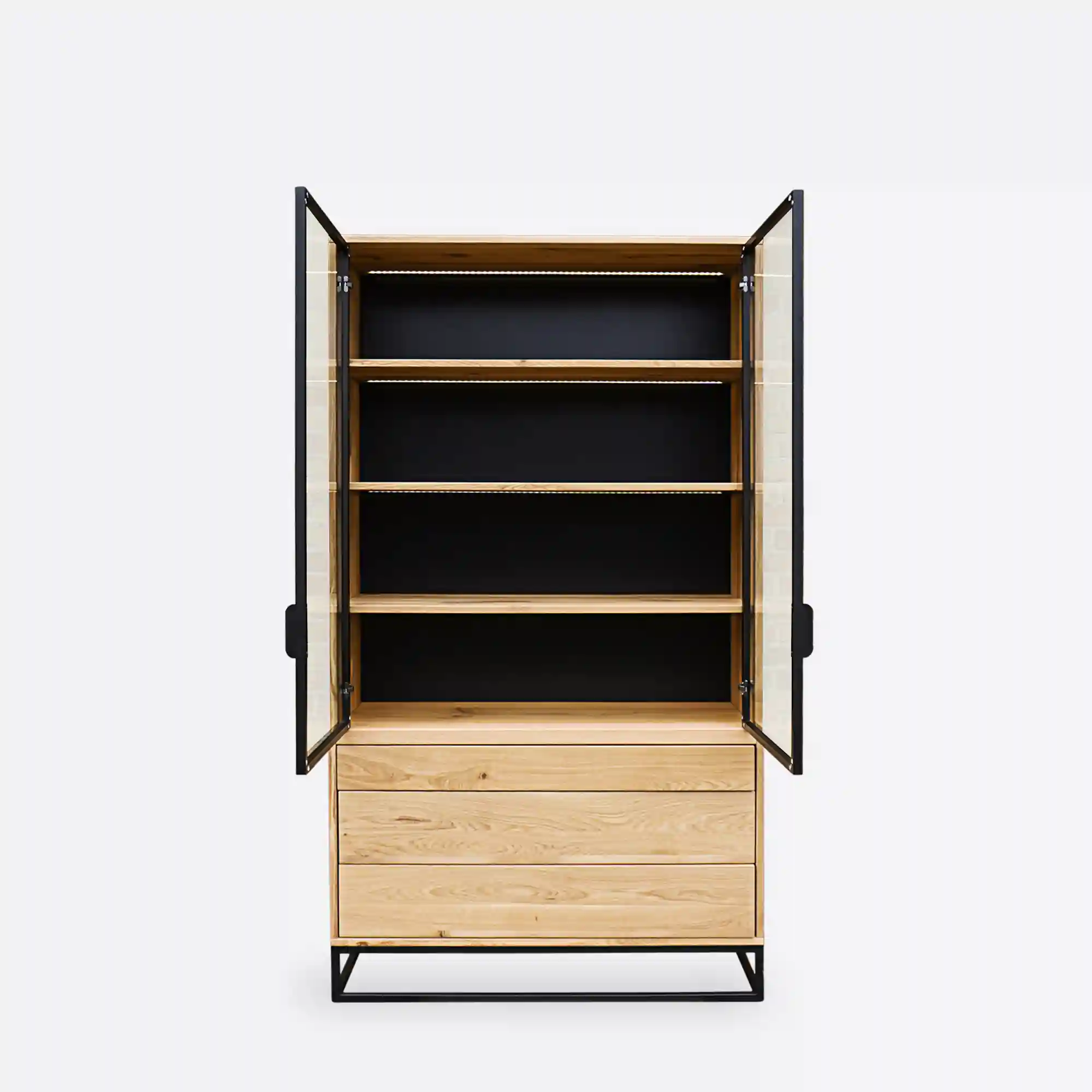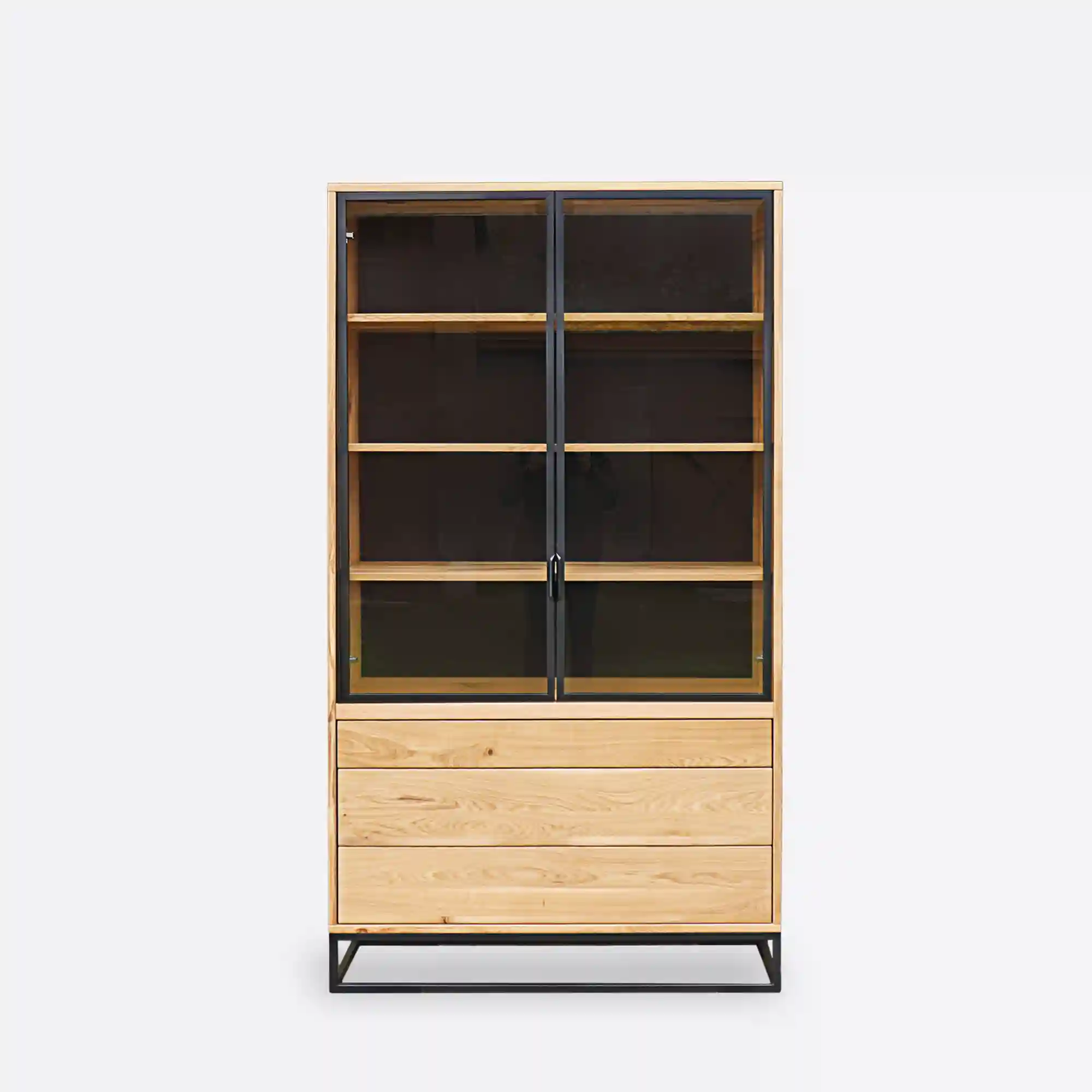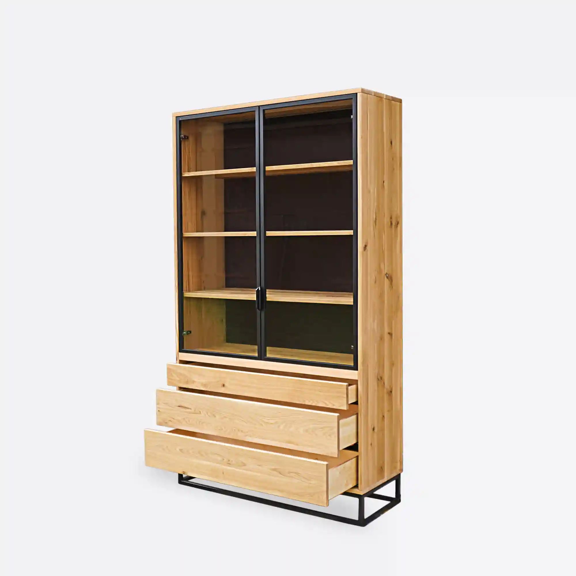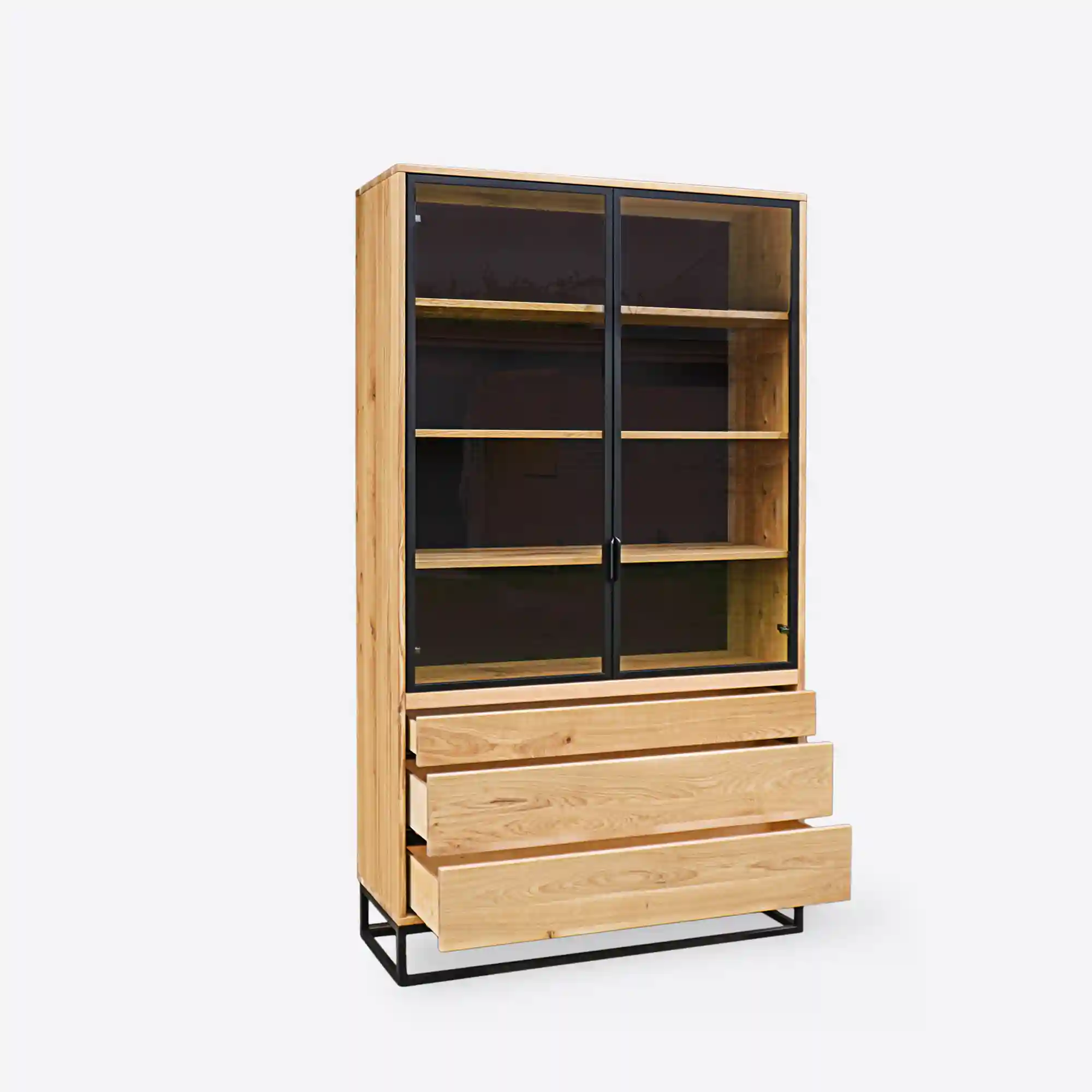 Die MERIS IV Vitrine aus massiver Eiche ist eine moderne Version des meistverkauften Modells, die Funktionalität mit der Ästhetik des industriellen Designs verbindet. Im Gegensatz zu den Vorgängermodellen sind die drei geräumigen Schubladen unter dem verglasten Teil angebracht, um den Zugang zu erleichtern und die Benutzung zu vereinfachen. Die Schubladen öffnen sich mit einem Tip-on-System mit geräuschloser Schließung, und das Ganze wird von einem massiven, schwarz pulverbeschichteten Stahlsockel getragen. Der verglaste Teil der Vitrine ist mit Floatglas und Aluminiumrahmen mit einem dezenten Griff ausgestattet. Der kontrastreiche schwarze Hintergrund unterstreicht die Schönheit des natürlichen Holzes und der ausgestellten Gegenstände – wie Porzellan, Glas, Bücher, Sammlungen oder Familienerbstücke. Die unteren Schubladen hingegen bieten Platz für Tischdecken, Dokumente, Haushaltszubehör oder kleine Gegenstände, die Sie immer griffbereit haben möchten. Es ist die perfekte Kombination aus Präsentation und Aufbewahrung in einem Möbelstück.