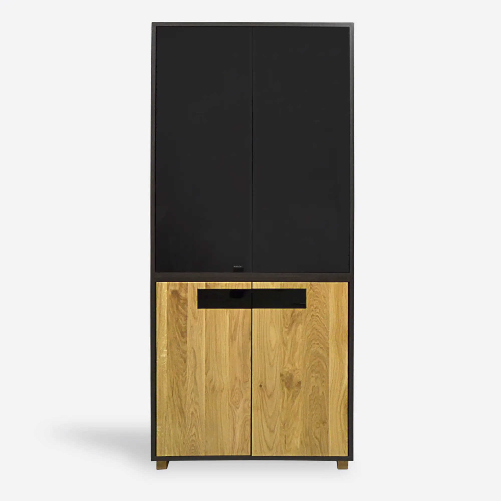 Eine große moderne Eichenvitrine LAGOS bietet viel Stauraum, sieht aber gleichzeitig einzigartig aus. Der Standort besteht aus massivem Eichenholz und einem massiven Korpus aus laminierten Brettern in der Farbe dunkler Eiche. Zum anderen sind die Beine der Vitrine für das Wohnzimmer und nicht nur aus Eichenmassivholz gefertigt. Es ist erwähnenswert, dass die Möbel aus zwei Teilen bestehen: verglast und geschlossen. Hinter dem Glasteil befinden sich zwei Regale, in denen Sie Familiensouvenirs, Geschirr und andere dekorative Elemente ausstellen können. Hinter der Holztür verbirgt sich ein großes Regal, das zusätzlichen, versteckten Stauraum bietet. Die Möbel bestechen durch ihre moderne und originelle Optik. Moderne Vitrinen für das Wohnzimmer verleihen dem Interieur einen unverwechselbaren Charakter. Eine große LAGOS-Vitrine funktioniert in jedem Raum, unabhängig von der Einrichtung und Anordnung.