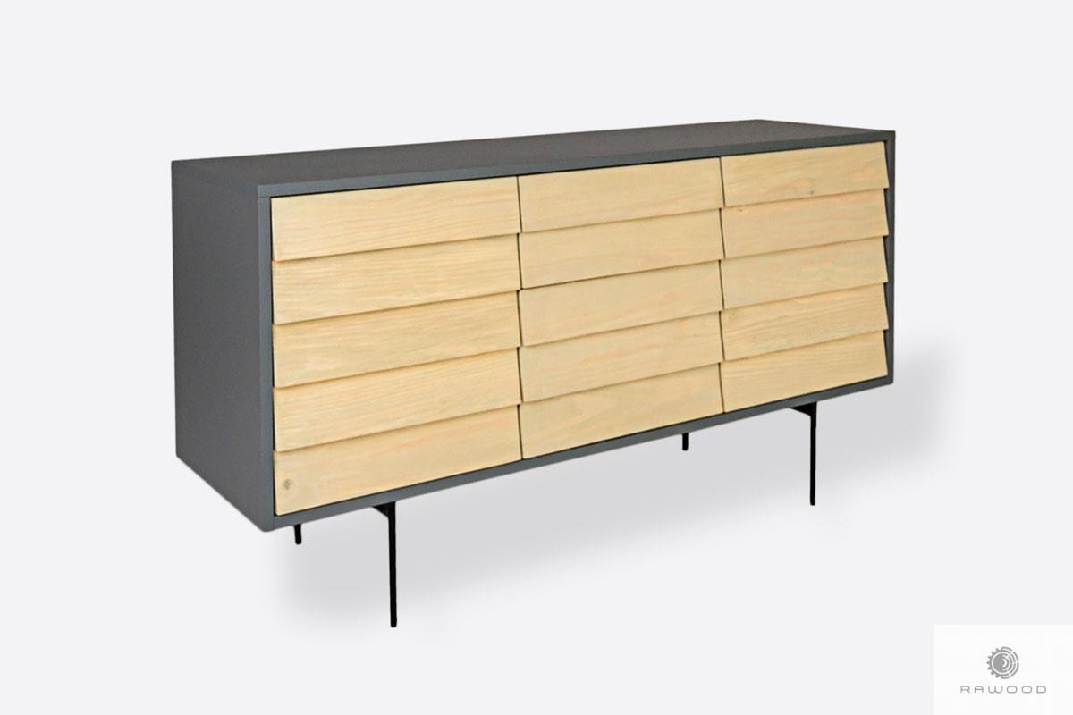 Modern Kommode aus Massivholz ADEO ist große, geräumige und elegante Schrank, das vom Industriestil inspiriert ist. TV Schrank ist aus Kiefernholz und laminierter Platte. Beinen sind aus Stahl pulverbeschichtetem in schwarz. Schrank hat keine Metallgriffe. Fronten des Schrankes und Schubladen als auch Türen ihr Aussehen ähnelt Jalousien, die gleichzeitig als Griffe fungieren. Kommode aus Massivholz hat zwei geräumige Schubladen und zwei Schränke mit Originaltüren geschlossen. Modern Kommode aus Massivholz ADEO ist perfekte Möbel für Loft-Wohnzimmer.