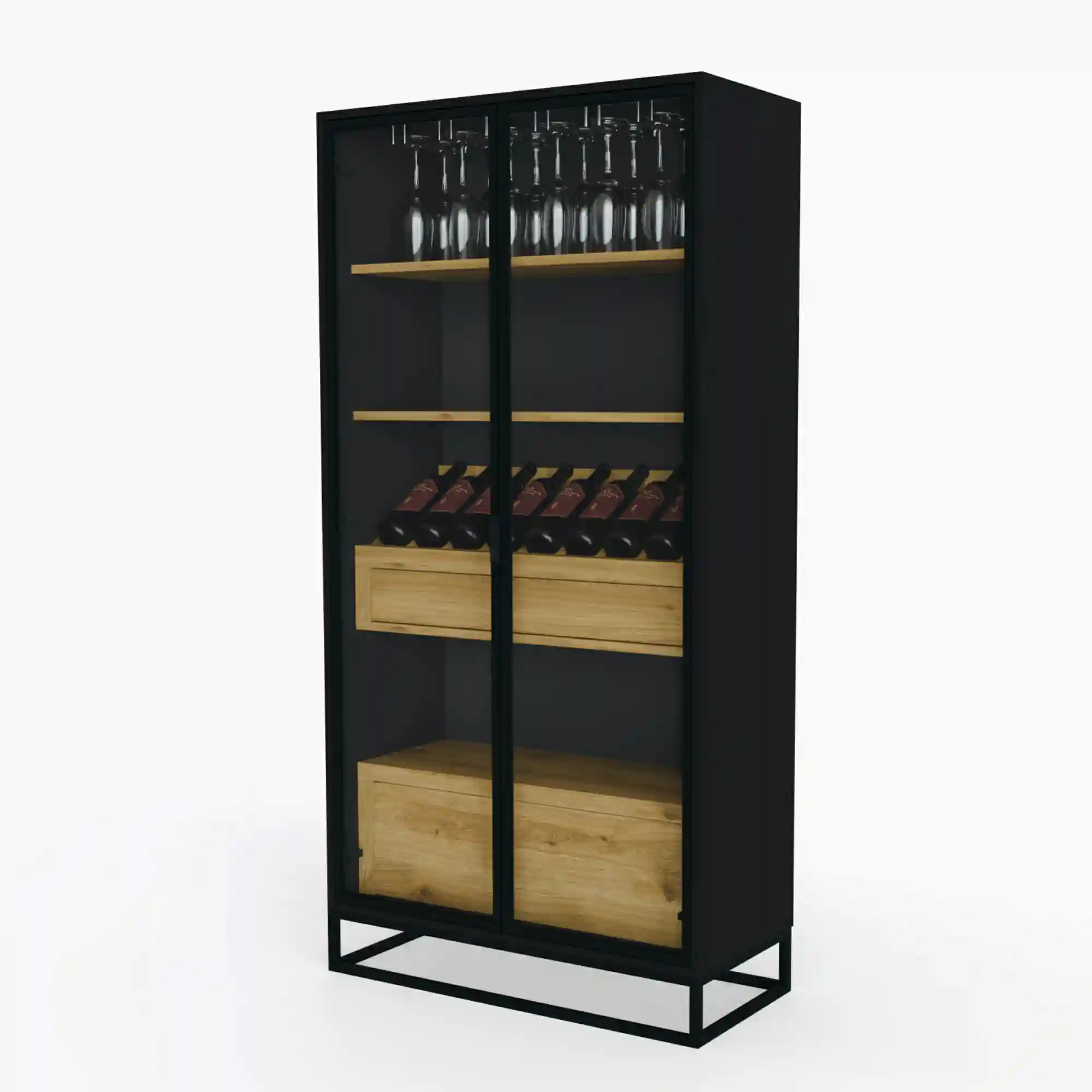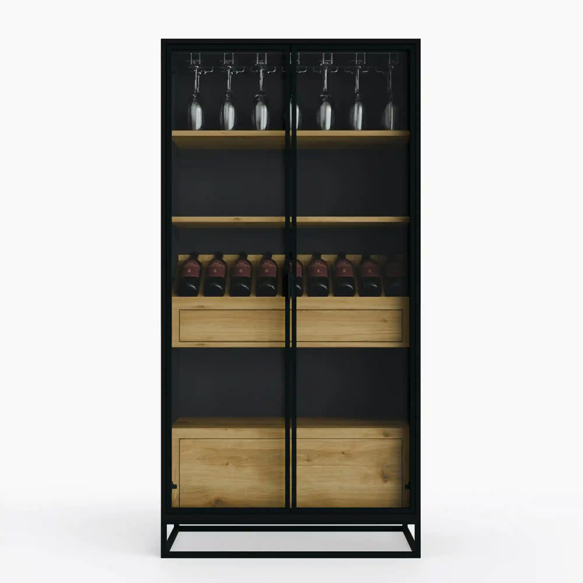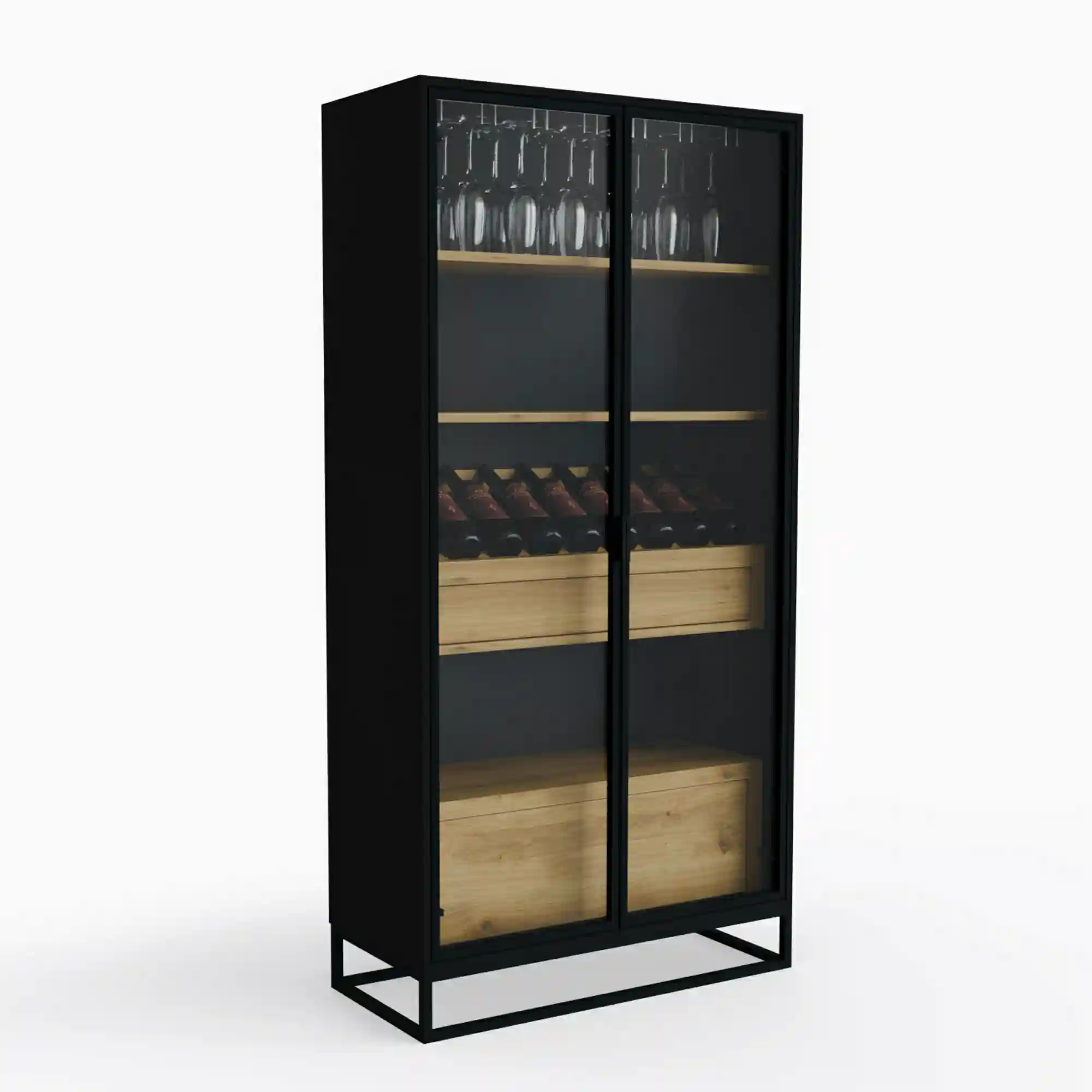 Die Glasvitrine NEMIR II aus Holz ist ein elegantes und funktionelles Möbelstück, mit dem Sie Ihre Sammlung von Spirituosen und Bar-Accessoires stilvoll präsentieren können. Der Korpus aus schwarzer Schichtholzplatte harmoniert perfekt mit den Eichenholzböden und -schubladen. Das Eichenholz kann in einem der vielen Farbtöne aus unserem Musterbuch gebeizt werden. Die verglasten Türen bringen Leichtigkeit in das Design und präsentieren Ihre Lieblingsspirituosen, Karaffen und Gläser. Subtile Aluminiumdetails und ein schwarz pulverbeschichteter Stahlsockel unterstreichen den industriellen Charakter des Möbels.