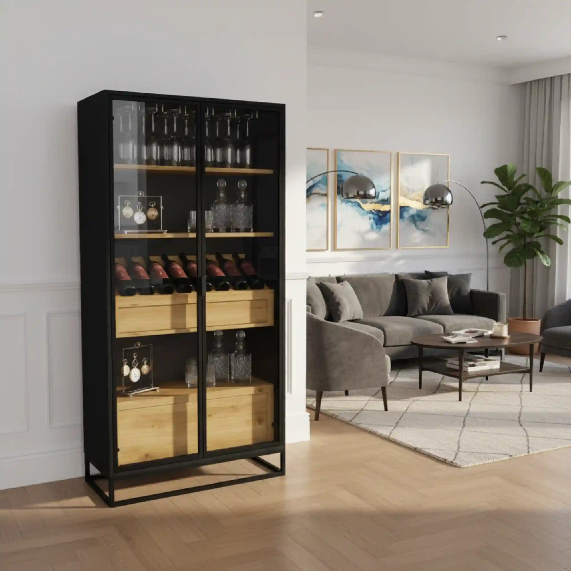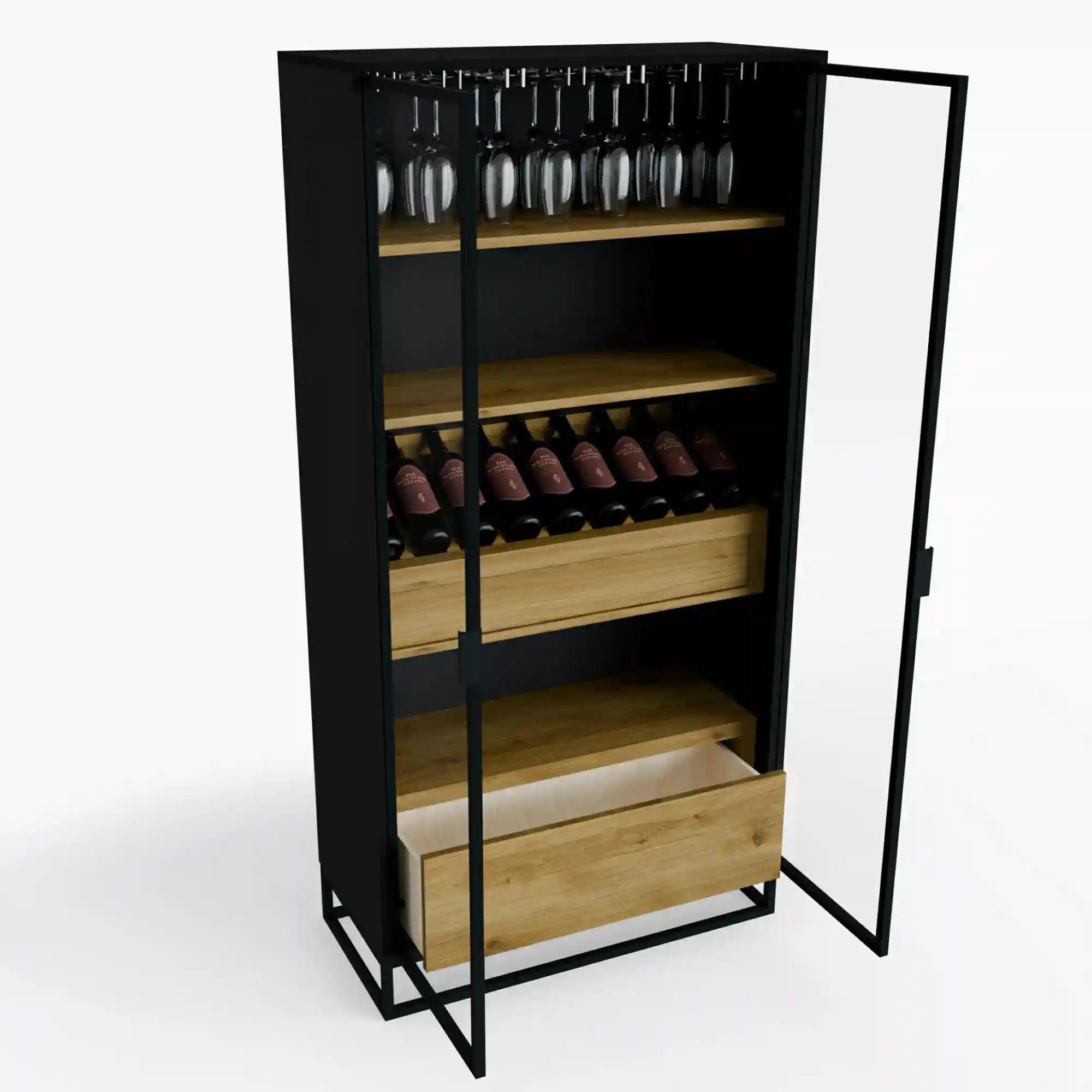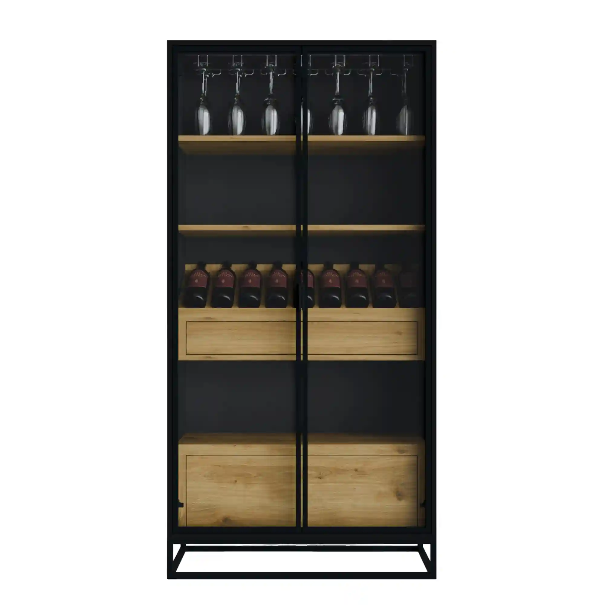 Die Glasvitrine NEMIR II aus Holz ist ein elegantes und funktionelles Möbelstück, mit dem Sie Ihre Sammlung von Spirituosen und Bar-Accessoires stilvoll präsentieren können. Der Korpus aus schwarzer Schichtholzplatte harmoniert perfekt mit den Eichenholzböden und -schubladen. Das Eichenholz kann in einem der vielen Farbtöne aus unserem Musterbuch gebeizt werden. Die verglasten Türen bringen Leichtigkeit in das Design und präsentieren Ihre Lieblingsspirituosen, Karaffen und Gläser. Subtile Aluminiumdetails und ein schwarz pulverbeschichteter Stahlsockel unterstreichen den industriellen Charakter des Möbels.