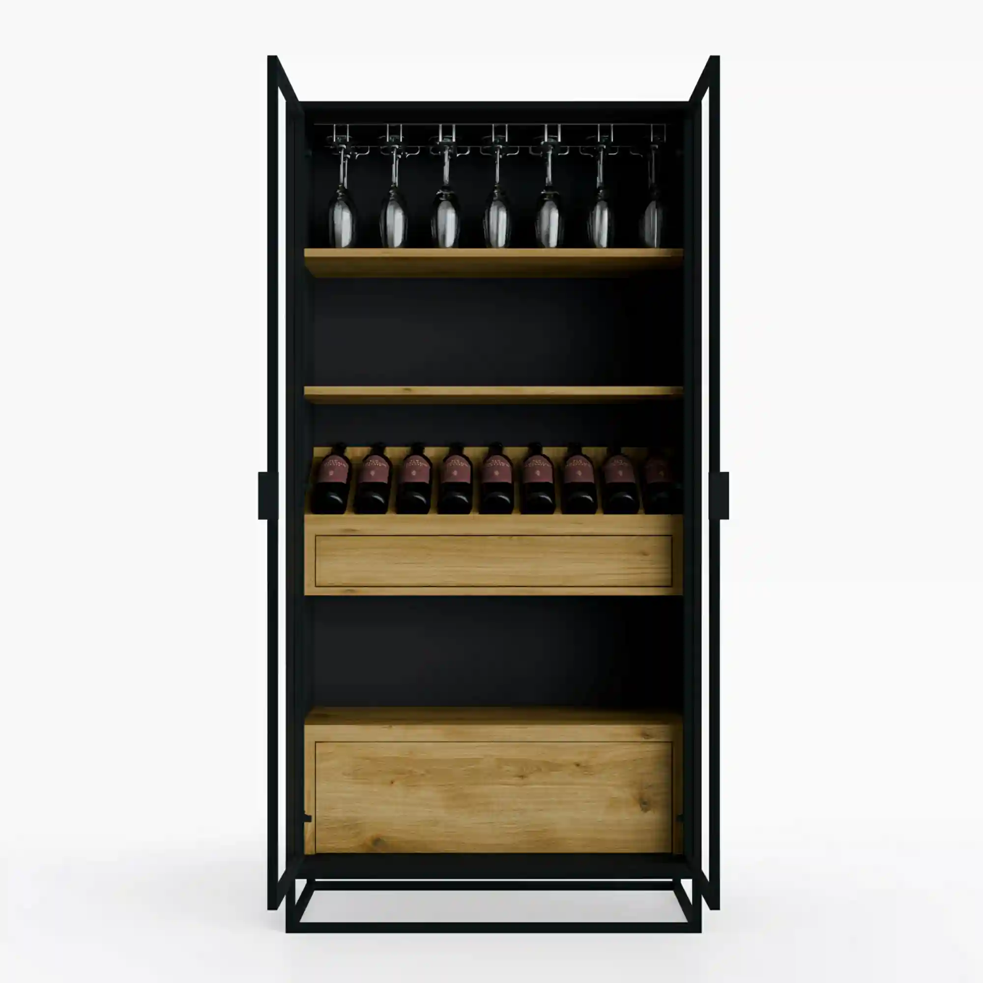Die durchdachte Einteilung der Regale, spezielle Fächer für Flaschen und eine Glasablage sorgen für Ordnung und Nutzungskomfort. Ein weiterer Vorteil sind die beiden unterschiedlich tiefen Schubladen, eine davon flach, direkt unter dem Weinregal. Eine flache Schublade befindet sich direkt unter dem Weinregal und kann für kleineres Barkeeperzubehör wie Öffner und Korkenzieher, Rührer, Messer/Schäler und Glashalter genutzt werden. In der zweiten, tieferen Schublade können größere Gegenstände wie Shaker, Servietten und Papierhandtücher oder Getränkezubehör untergebracht werden. Dank dieser Aufteilung setzt die Vitrine nicht nur die Spirituosenkollektion eindrucksvoll in Szene, sondern hilft auch, Ordnung zu halten und alle notwendigen Accessoires immer in Reichweite zu haben.