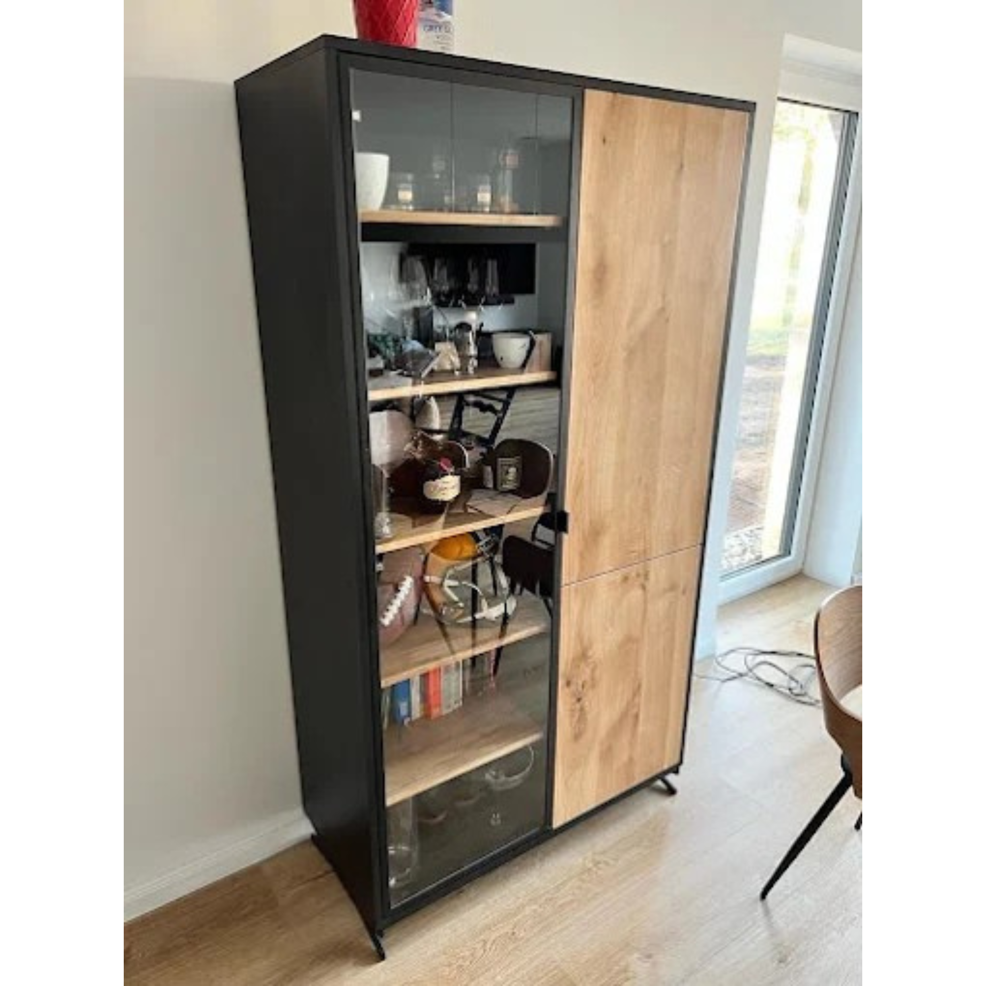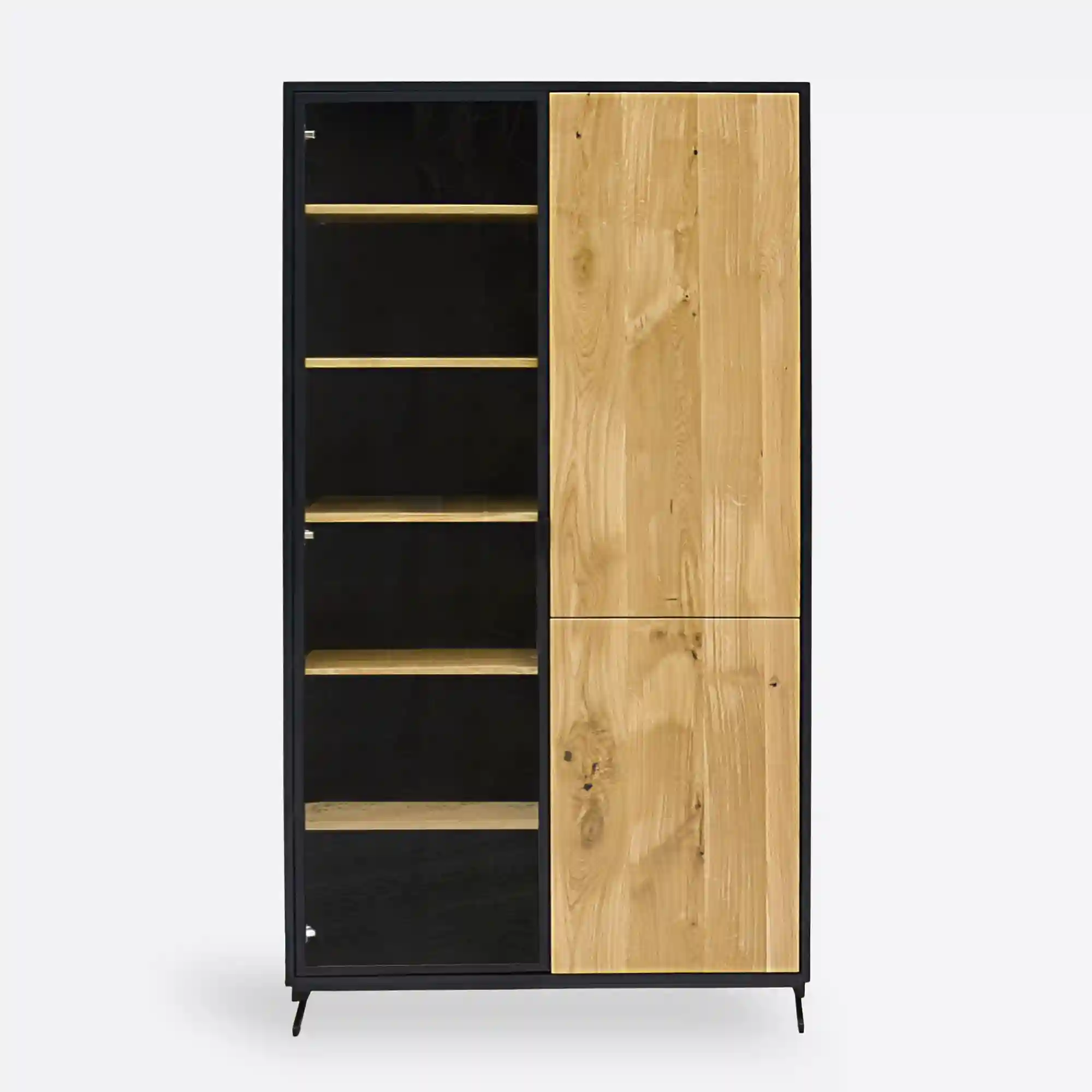 Eine perfekte Kombination aus Moderne und Tradition. Eine interessante Form wird mit festen Materialien kombiniert. Es wird perfekt als Designer-Ergänzung zu modernen Arrangements funktionieren. Alles dank der interessanten Form und des originellen Aussehens. Das Designer-Bücherregal besteht aus massivem Eichen-Massivholz und laminierter Platte. Darüber hinaus besteht eine Tür des Bücherregals aus Glas in einem Metallrahmen, mit dem Sie interessante Ornamente und Bücher anzeigen können. Die Beine der Möbel sind aus pulverbeschichtetem Stahl in Schwarz gefertigt. Das Bücherregal Loft Eiche ist äußerst geräumig und funktional, da es bis zu 9 Regale hat! Sicherlich wird es im Büro keinen Mangel an Platz für Dokumente oder Ordner geben. Ein handgefertigtes Bücherregal aus Eichenholz ist ein großartiges Angebot für alle, die Wert auf höchste Qualität legen. Interessantes, minimalistisches Design macht das Bücherregal aus Eichenholz zu einer Dekoration vieler zeitgenössischer Interieurs. Naturholz wird mit Brettschichtholz kombiniert, was ihm einen einzigartigen Charakter verleiht. Das Bücherregal CASTEL Eiche eignet sich perfekt für verschiedene Anordnungen. Es wird eine ideale Dekoration in Räumen im klassischen Stil, aber auch im industriellen Stil sein.