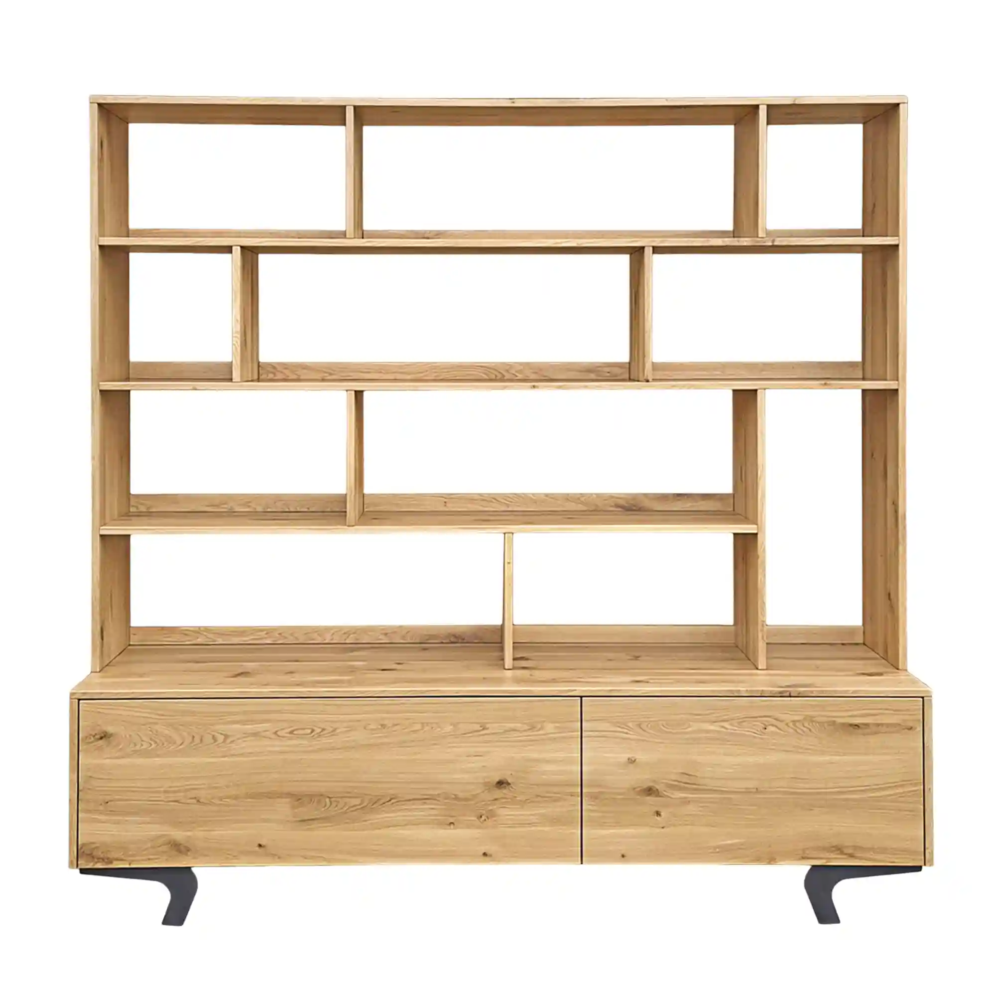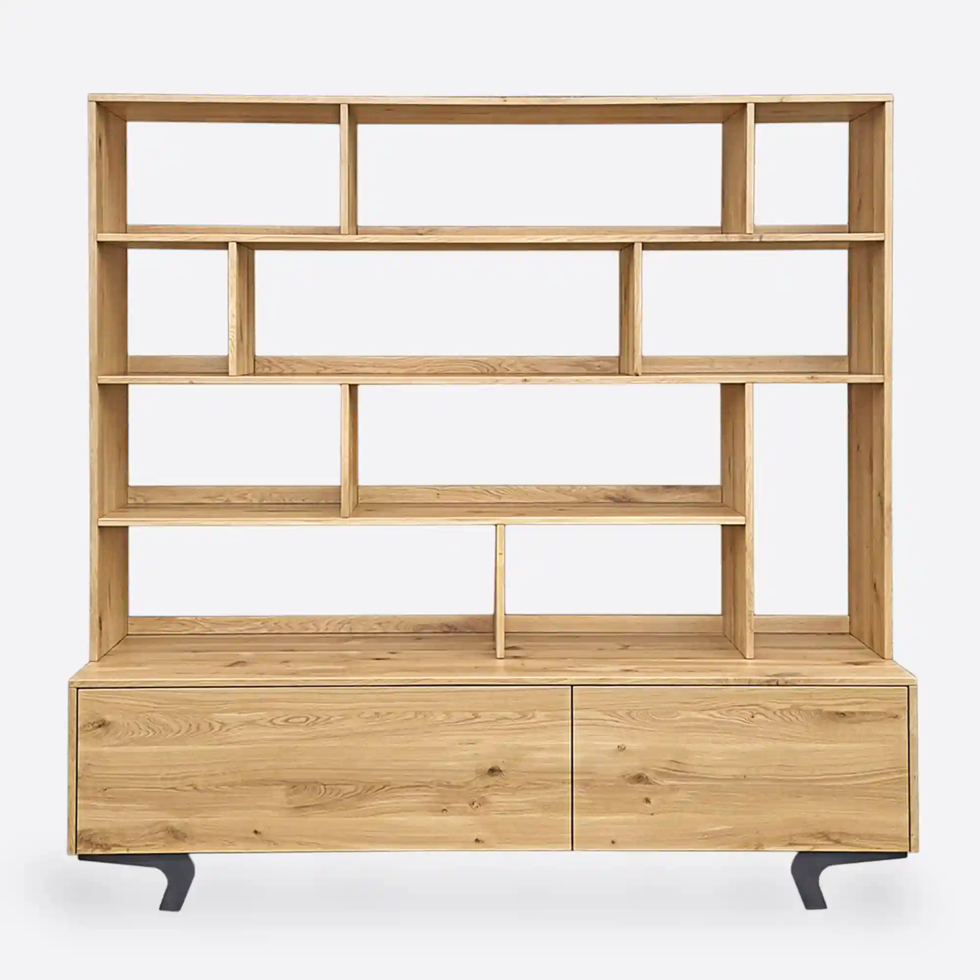 Jedes unserer Möbelstücke wird aus massivem Eichenholz höchster Qualität gefertigt, das sich durch außergewöhnliche Langlebigkeit und Widerstandsfähigkeit gegen den Lauf der Zeit auszeichnet. Ein Wohnzimmer-Bücherregal ist eine Investition, die über Jahre hinweg Bestand hat. Deshalb bieten wir Ihnen die Möglichkeit, es individuell zu gestalten. Bei der Bestellung können Sie die Farbe des Holzes und des Stahls Ihren Wünschen anpassen, die Einteilung der Regale ändern oder zusätzliche Schubladen hinzufügen. So können Sie sicher sein, dass das Möbelstück perfekt zu Ihrer Einrichtung passt. Wenn Sie Ihre eigenen Vorstellungen von den Möbeln haben, nutzen Sie einfach die Option “Bücherregal anpassen”, wo Sie angeben können, welche Änderungen Sie vornehmen möchten. Auf diese Weise wird Ihr Bücherregal aus Eiche nicht nur zu einem einzigartigen Element Ihrer Inneneinrichtung, sondern auch zu einem voll funktionsfähigen Möbelstück.