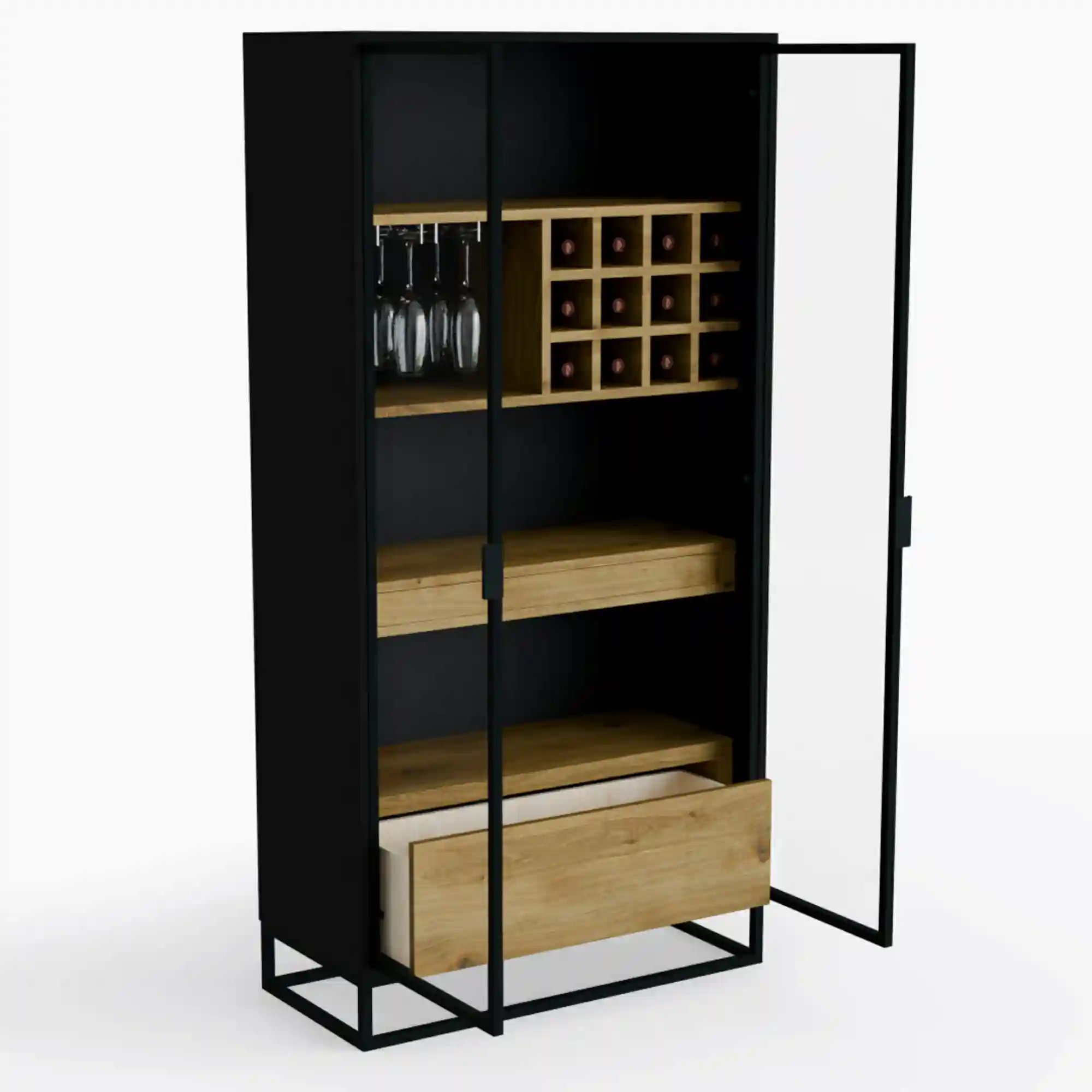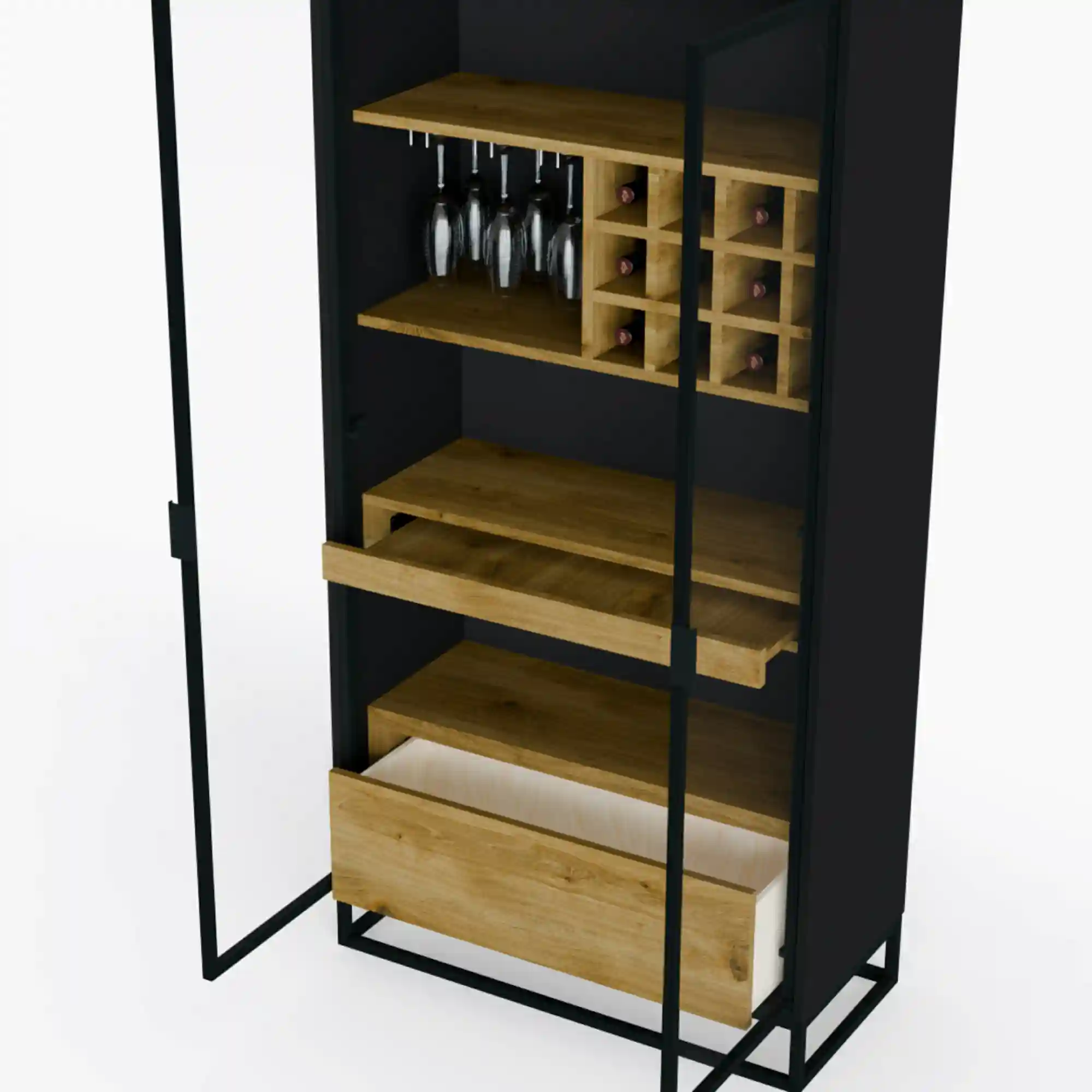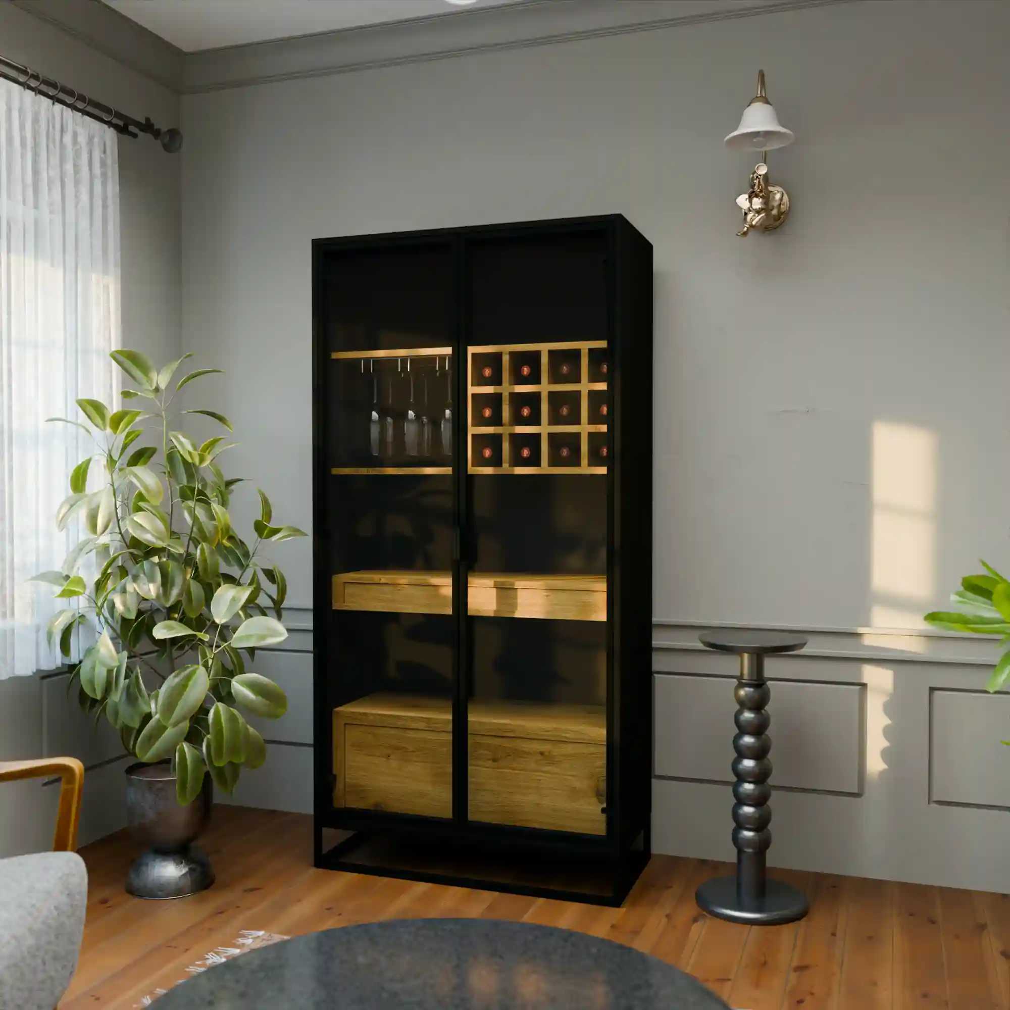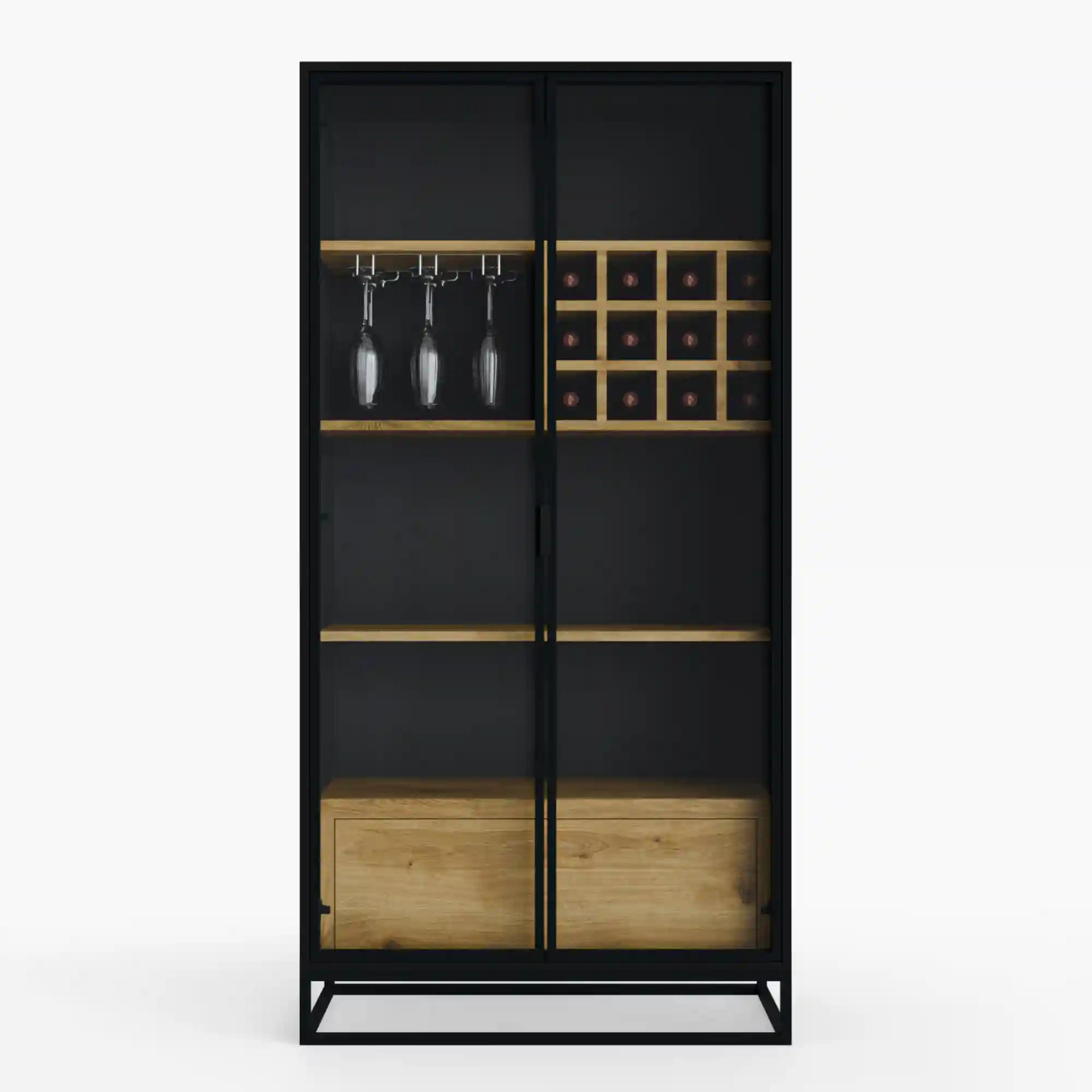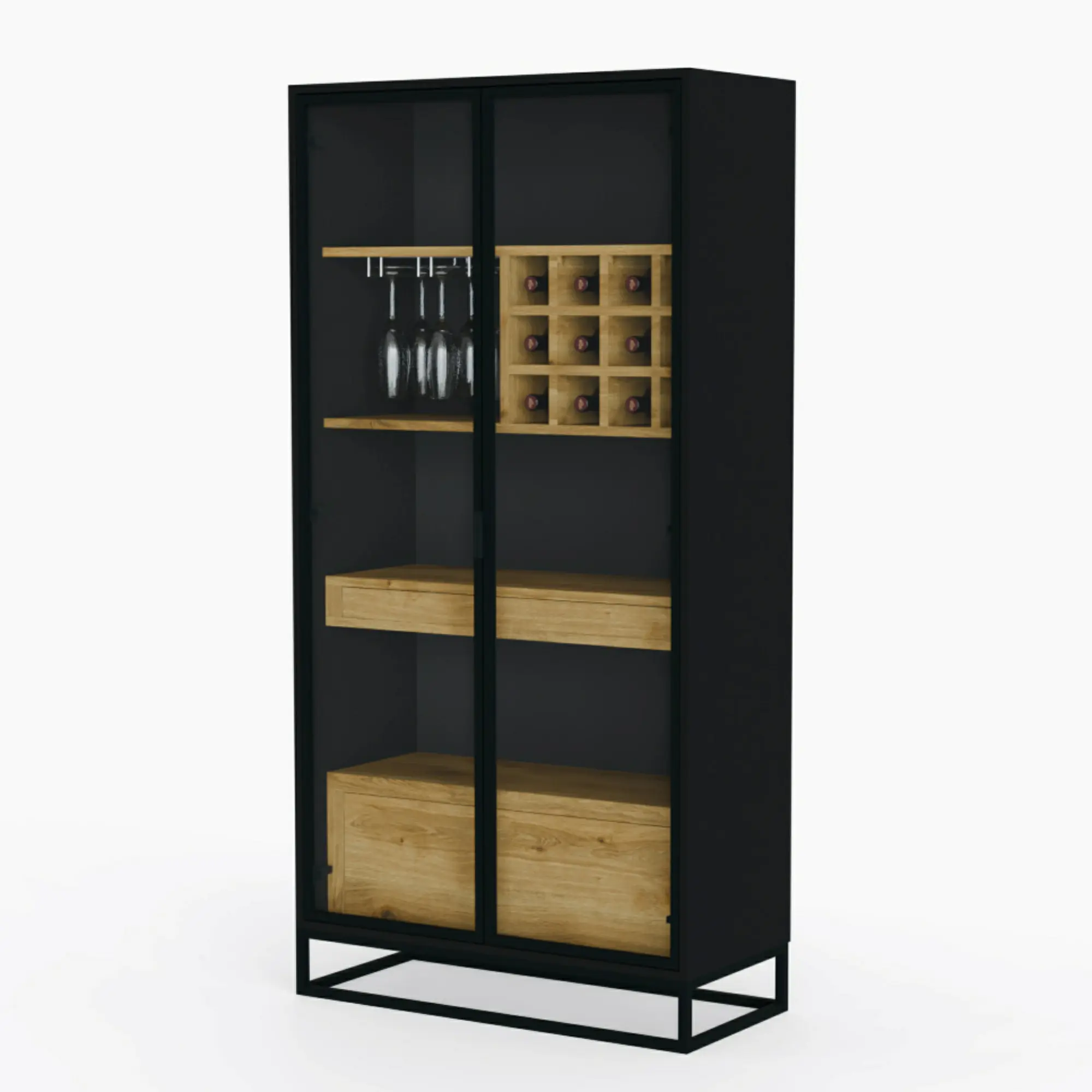 Der Eichenholz-Schrank für das Wohnzimmer NEMIR I ist ein elegantes und funktionales Möbelstück, in dem Sie Ihre Lieblingsspirituosen stilvoll präsentieren können. Der Korpus aus schwarzer Schichtstoffplatte harmoniert mit den Eichenholzböden und der Schublade. Das Eichenholz kann in jeder in unserem Musterbuch verfügbaren Farbe gebeizt werden. Die transparenten Glastüren verleihen dem Design Leichtigkeit und erlauben es Ihnen, Ihre Spirituosensammlung, schöne Karaffen und Gläser zu bewundern. Die Aluminiumoberfläche der Tür und der schwarz pulverbeschichtete Stahlsockel verleihen dem Regal eine industrielle Note. Dank der geschickten Anordnung der Einlegeböden und der speziell entworfenen Flaschenfächer und Glasablagen ist das Möbelstück nicht nur ästhetisch ansprechend, sondern auch äußerst praktisch. Das ausziehbare Regal, das als Tisch dient, ermöglicht das bequeme Einschenken von Alkohol, ohne dass man die Flaschen tragen muss. Die geräumige Schublade wiederum bietet den idealen Platz für stilvolle Accessoires wie Öffner oder Untersetzer. Die Vitrine NEMIR I kann mit einer zusätzlichen Beleuchtung ausgestattet werden, die die optischen Qualitäten der Spirituosen hervorhebt und eine einzigartige Atmosphäre in den Wohnraum bringt. Neben den Spirituosen bietet die Vitrine auch Platz für Dekorationen, stilvolle Gläser oder Design-Accessoires, die die Inneneinrichtung ergänzen. Es handelt sich um ein universelles Möbelstück, das dank seines modernen Designs sowohl in moderne als auch in klassische Räume perfekt passt. Außerdem ist die moderne Vitrine ein Ausdruck guten Geschmacks und eine einzigartige Dekoration für jedes Wohnzimmer.