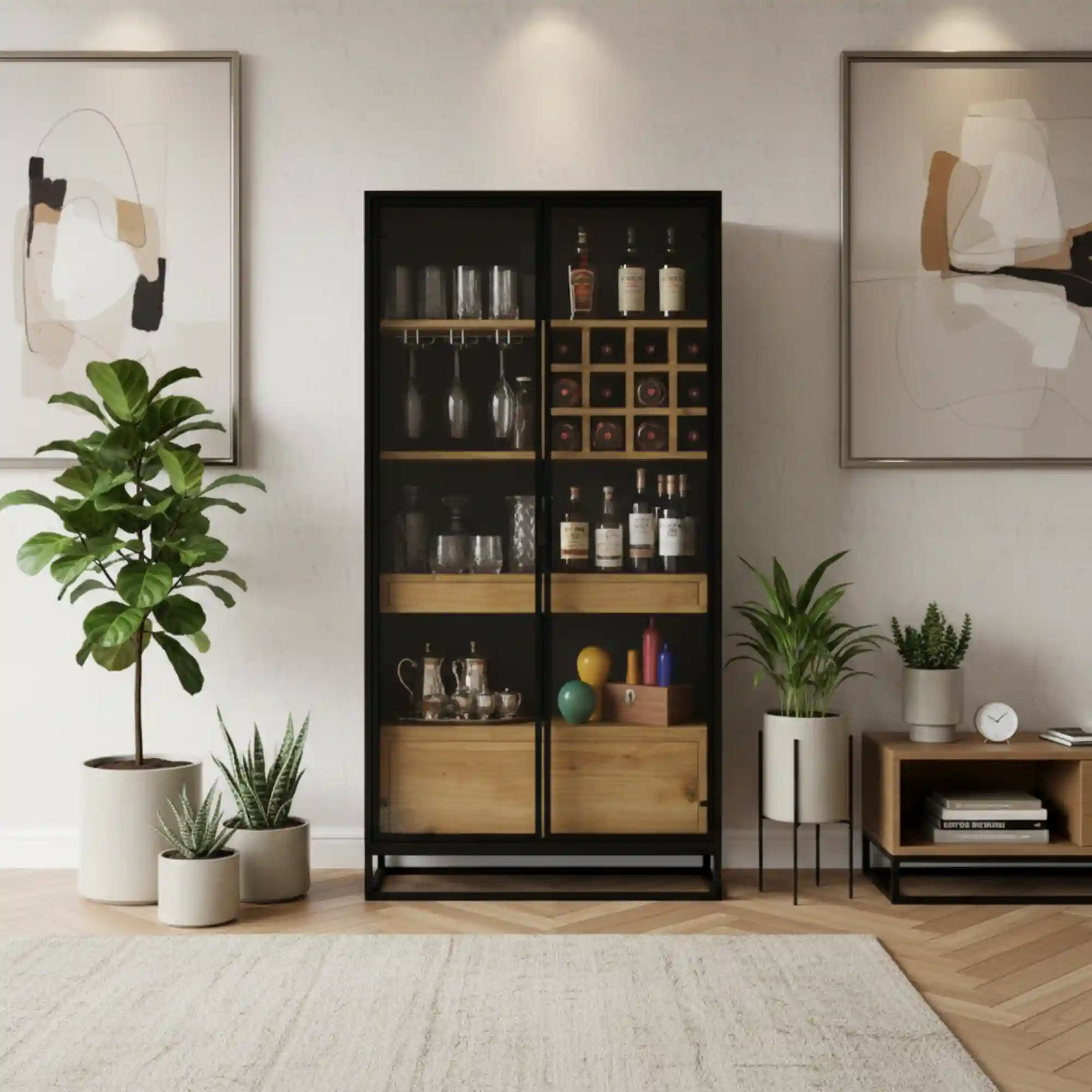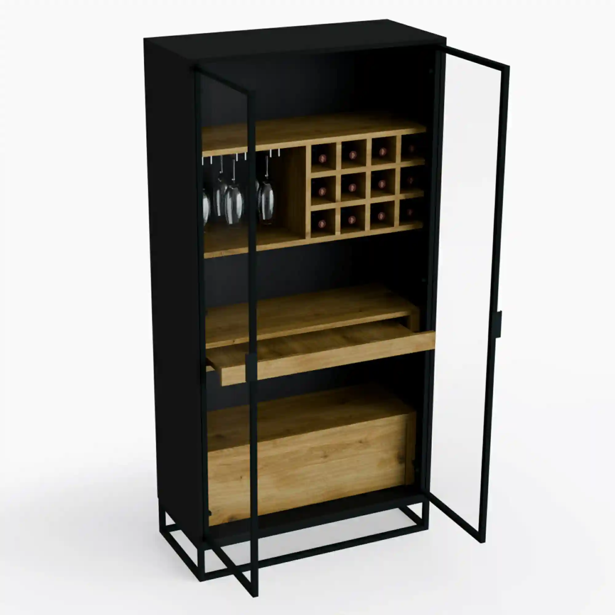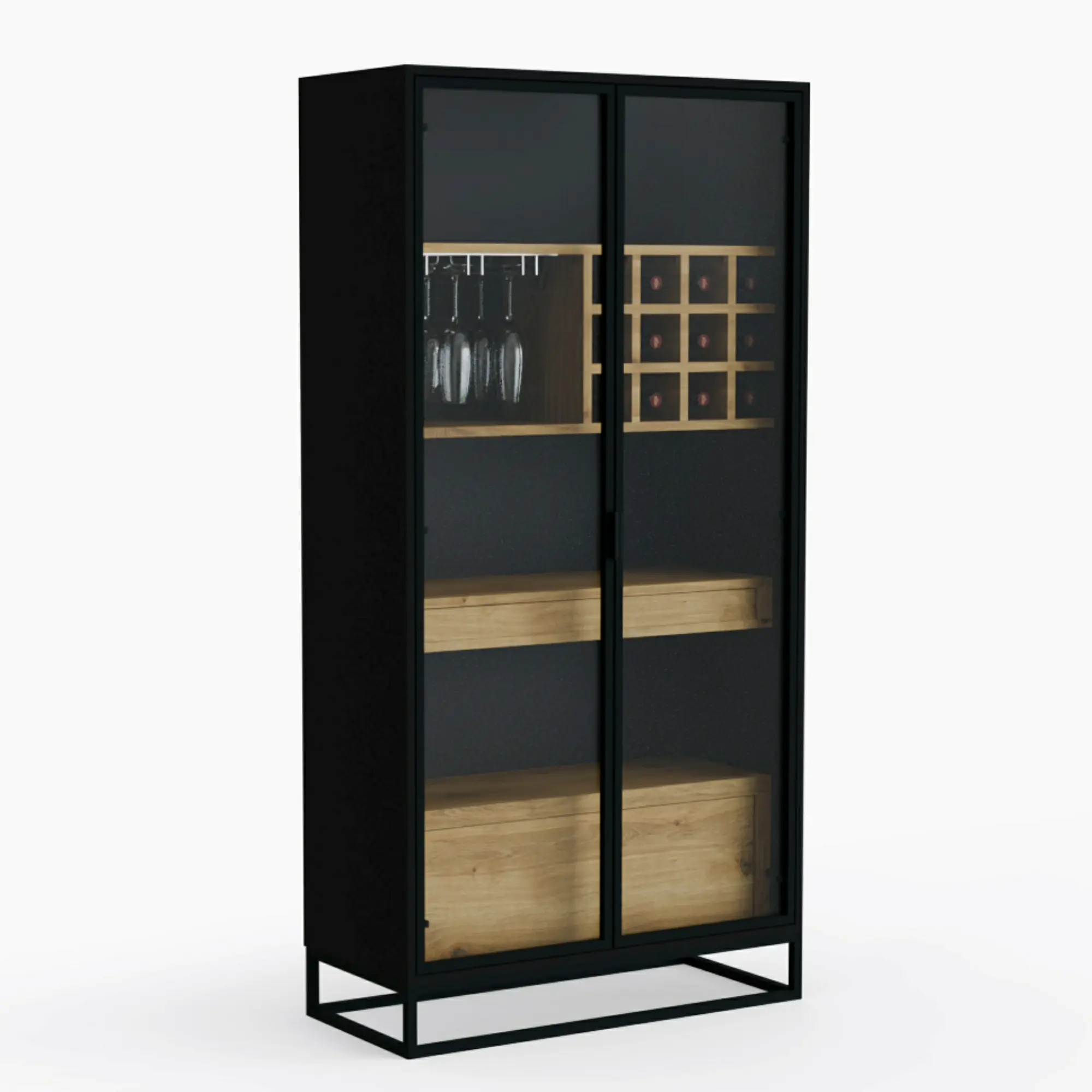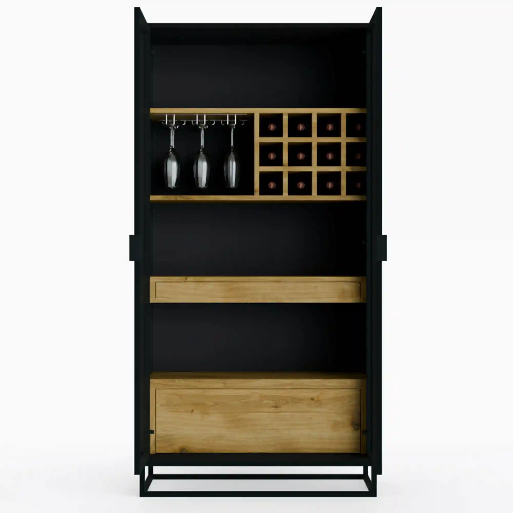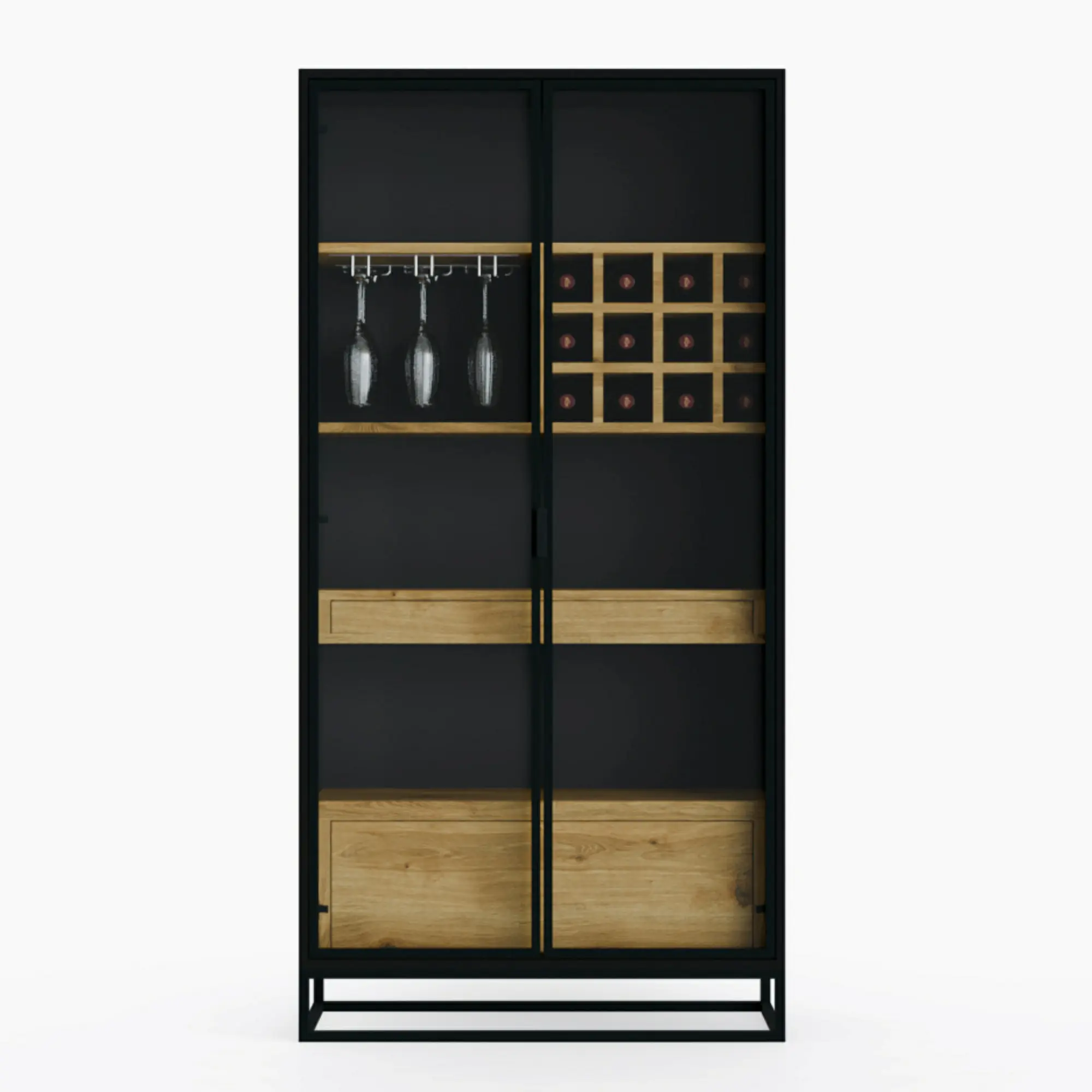 Der Eichenholz-Schrank für das Wohnzimmer NEMIR I ist ein elegantes und funktionales Möbelstück, in dem Sie Ihre Lieblingsspirituosen stilvoll präsentieren können. Der Korpus aus schwarzer Schichtstoffplatte harmoniert mit den Eichenholzböden und der Schublade. Das Eichenholz kann in jeder in unserem Musterbuch verfügbaren Farbe gebeizt werden. Die transparenten Glastüren verleihen dem Design Leichtigkeit und erlauben es Ihnen, Ihre Spirituosensammlung, schöne Karaffen und Gläser zu bewundern. Die Aluminiumoberfläche der Tür und der schwarz pulverbeschichtete Stahlsockel verleihen dem Regal eine industrielle Note. Dank der geschickten Anordnung der Einlegeböden und der speziell entworfenen Flaschenfächer und Glasablagen ist das Möbelstück nicht nur ästhetisch ansprechend, sondern auch äußerst praktisch. Das ausziehbare Regal, das als Tisch dient, ermöglicht das bequeme Einschenken von Alkohol, ohne dass man die Flaschen tragen muss. Die geräumige Schublade wiederum bietet den idealen Platz für stilvolle Accessoires wie Öffner oder Untersetzer. Die Vitrine NEMIR I kann mit einer zusätzlichen Beleuchtung ausgestattet werden, die die optischen Qualitäten der Spirituosen hervorhebt und eine einzigartige Atmosphäre in den Wohnraum bringt. Neben den Spirituosen bietet die Vitrine auch Platz für Dekorationen, stilvolle Gläser oder Design-Accessoires, die die Inneneinrichtung ergänzen. Es handelt sich um ein universelles Möbelstück, das dank seines modernen Designs sowohl in moderne als auch in klassische Räume perfekt passt. Außerdem ist die moderne Vitrine ein Ausdruck guten Geschmacks und eine einzigartige Dekoration für jedes Wohnzimmer.
