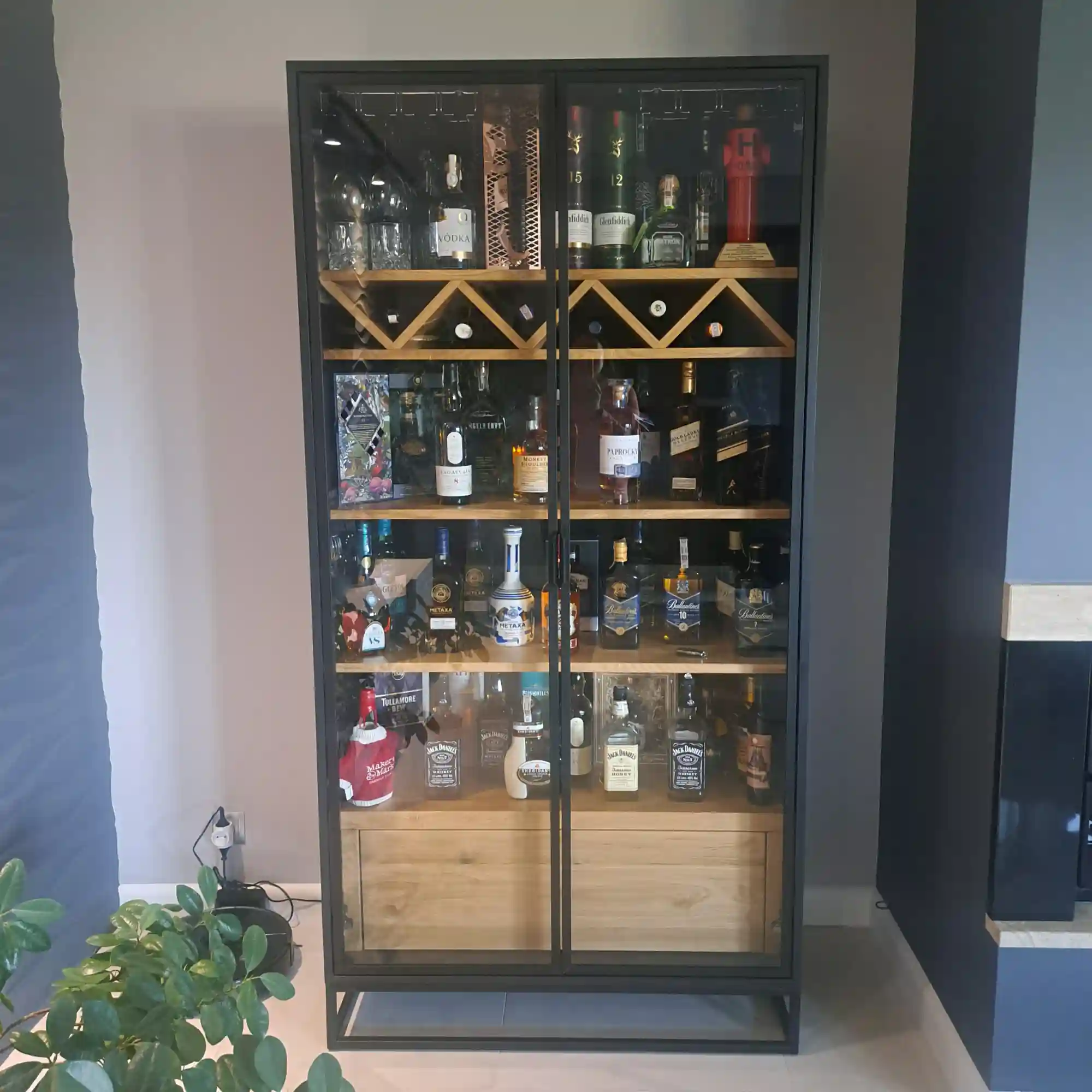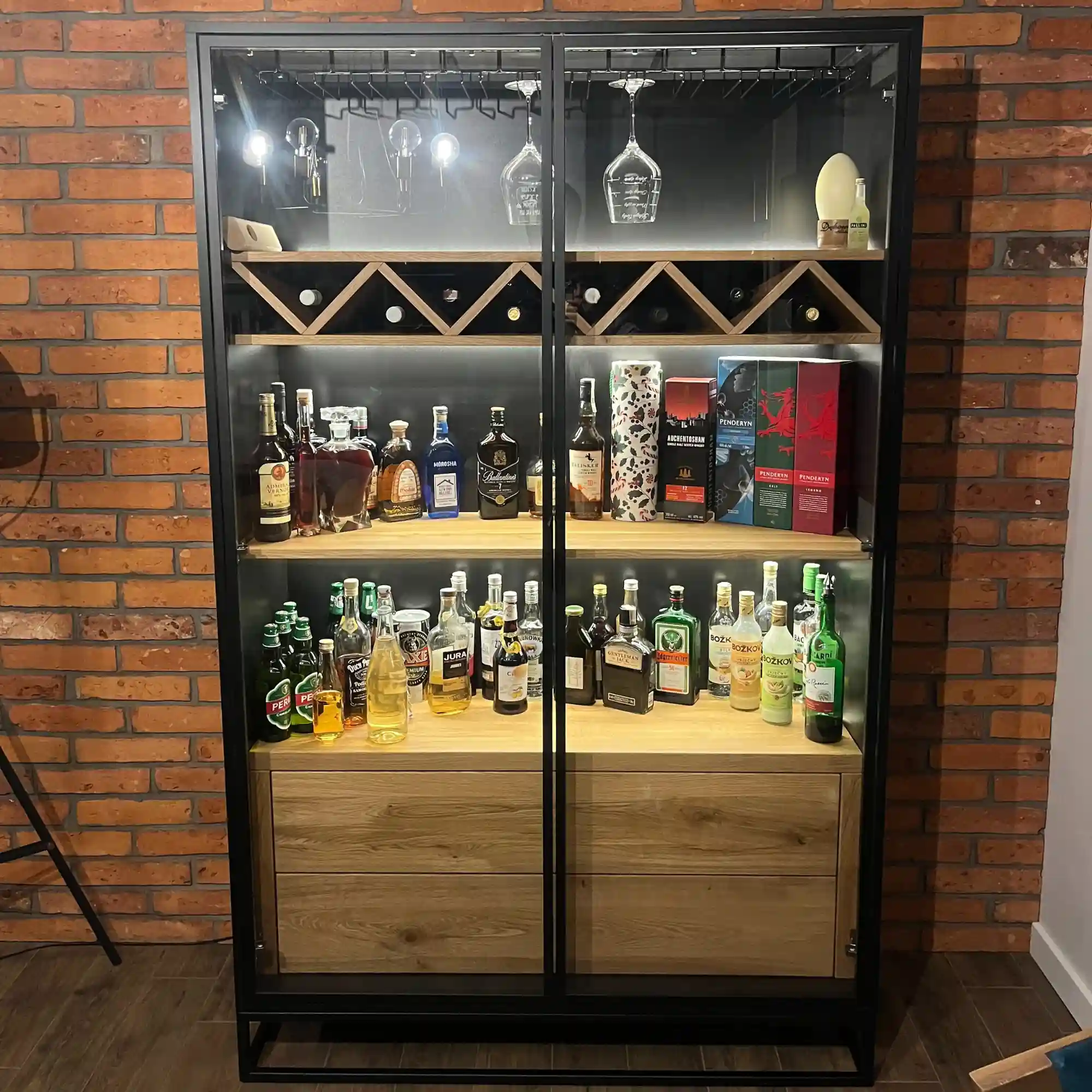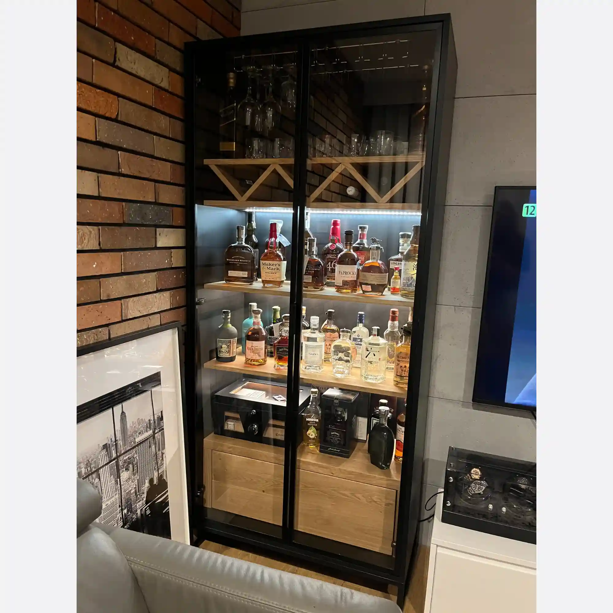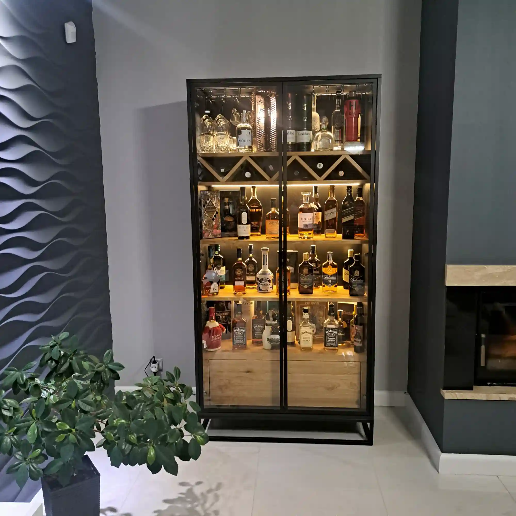 Nicht nur das Aussehen verdient Aufmerksamkeit. Unsere Website wird perfekt als Bar für Alkohol funktionieren! Die moderne Holzvitrine NEMIR eignet sich perfekt zur Aufbewahrung von Gläsern und Getränken, damit Sie sie bei einem unangekündigten Besuch von Freunden zur Hand haben. Es bietet jedoch auch viel Platz für Bücher, Dokumente oder Kleidung. Sie können die Vitrine auch zur Aufbewahrung von Tischdecken, Geschirr und hohen Karaffen verwenden. Vitrinenschrank aus Eiche und laminierte Platte NEMIR zeichnet sich durch ihre Stabilität und Funktionalität aus, aber auch durch einen Designer-Look, der Blicke auf sich zieht. Alle unsere Vitrinen können an Ihre individuellen Bedürfnisse angepasst werden.