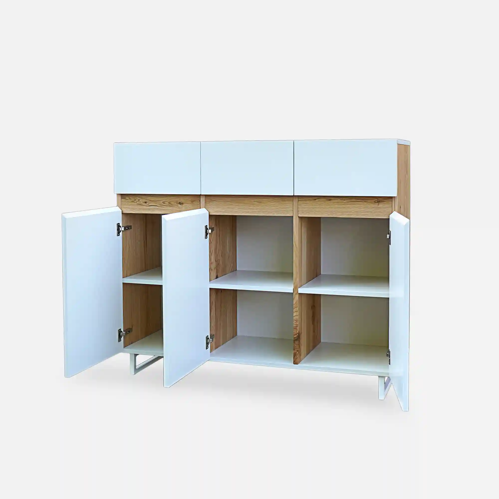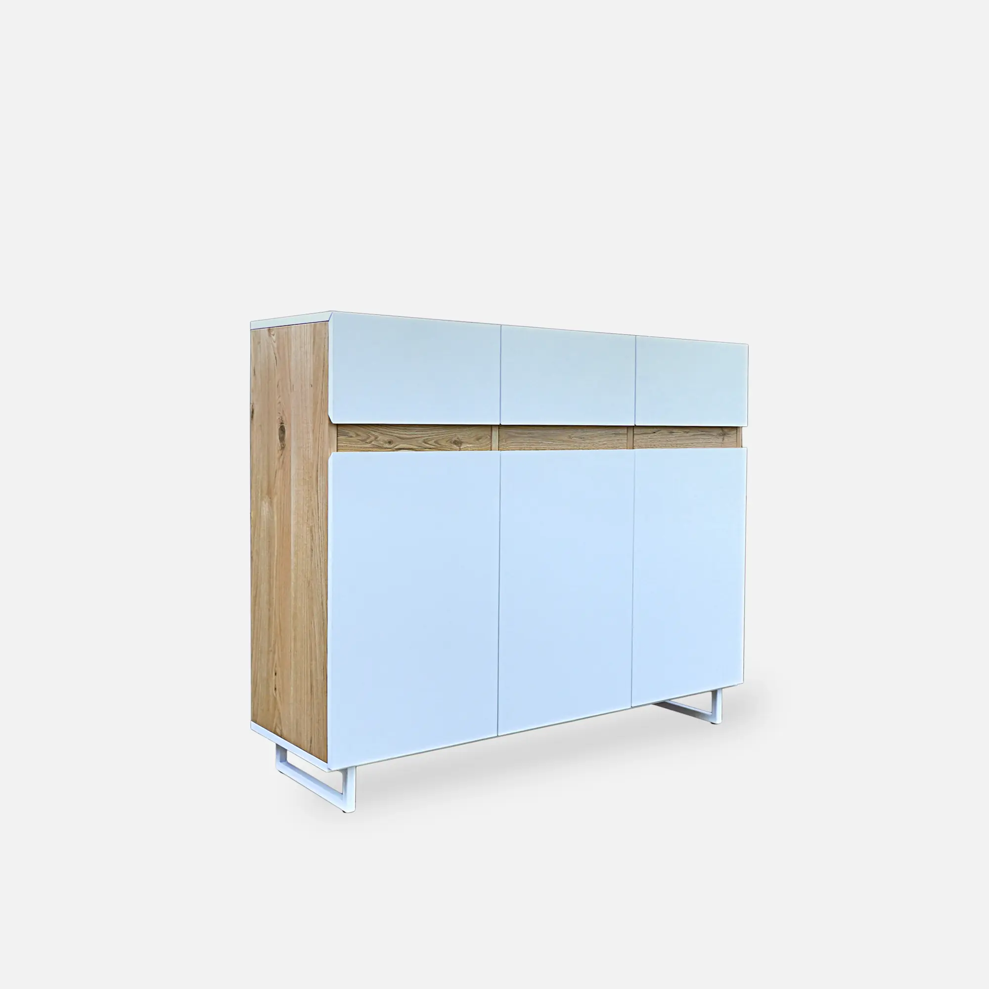 Die moderne weiße Kommode aus Massivholz DORIS ist die perfekte Kombination aus Funktionalität und modernem Design. Der Korpus des Möbels sowie die Regale sind aus natürlichem Eichenmassivholz gefertigt. Die Fronten der Schubladen, der Schränke und die Tischplatte sind aus weißer laminierte Platte. Die Beine der Kommode sind aus pulverbeschichtetem Stahl in Weiß gefertigt. Das Designerstück verfügt über drei Schränke mit Regalen im Inneren. In der oberen Hälfte befinden sich drei geräumige Schubladen. Das Möbelstück verwendet ein äußerst bequemes TIP-ON-Öffnungssystem, sodass es ausreicht, leicht zu drücken, um die Schranktür oder die Schublade zu öffnen, und zum Schließen leicht zu drücken. Die Designerkommode aus naturbelassenem Eichenholz und weißer laminierten Platte sieht elegant und einzigartig aus. Die moderne Kommode aus Massivholz verleiht den Räumen, in denen sie steht, einen originellen Charakter und Gemütlichkeit.
